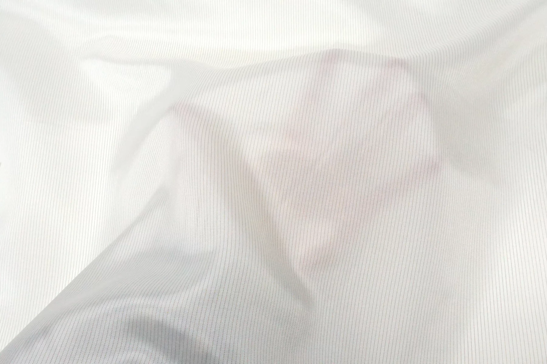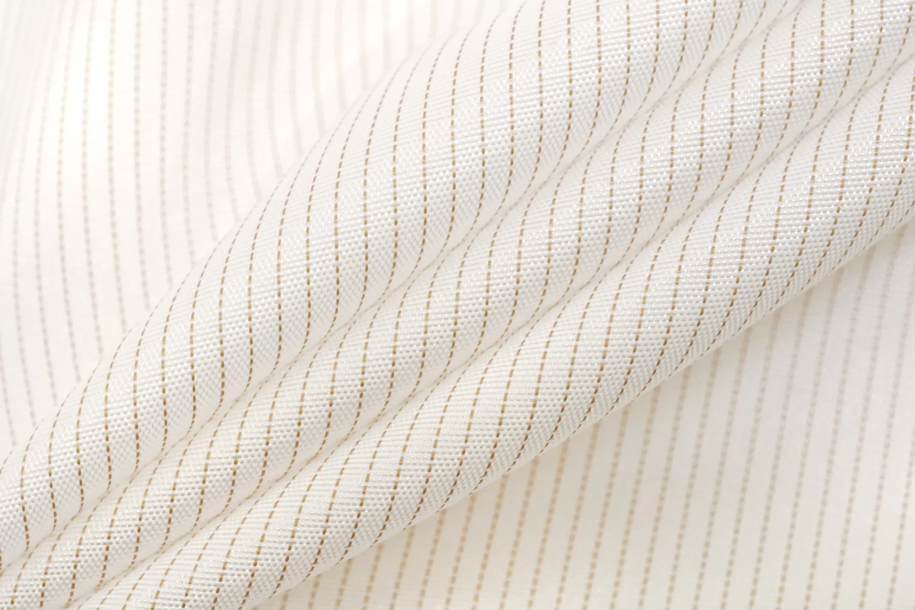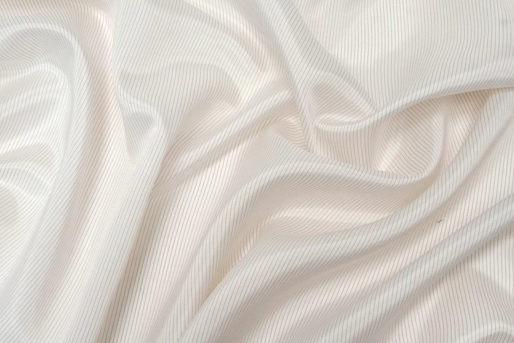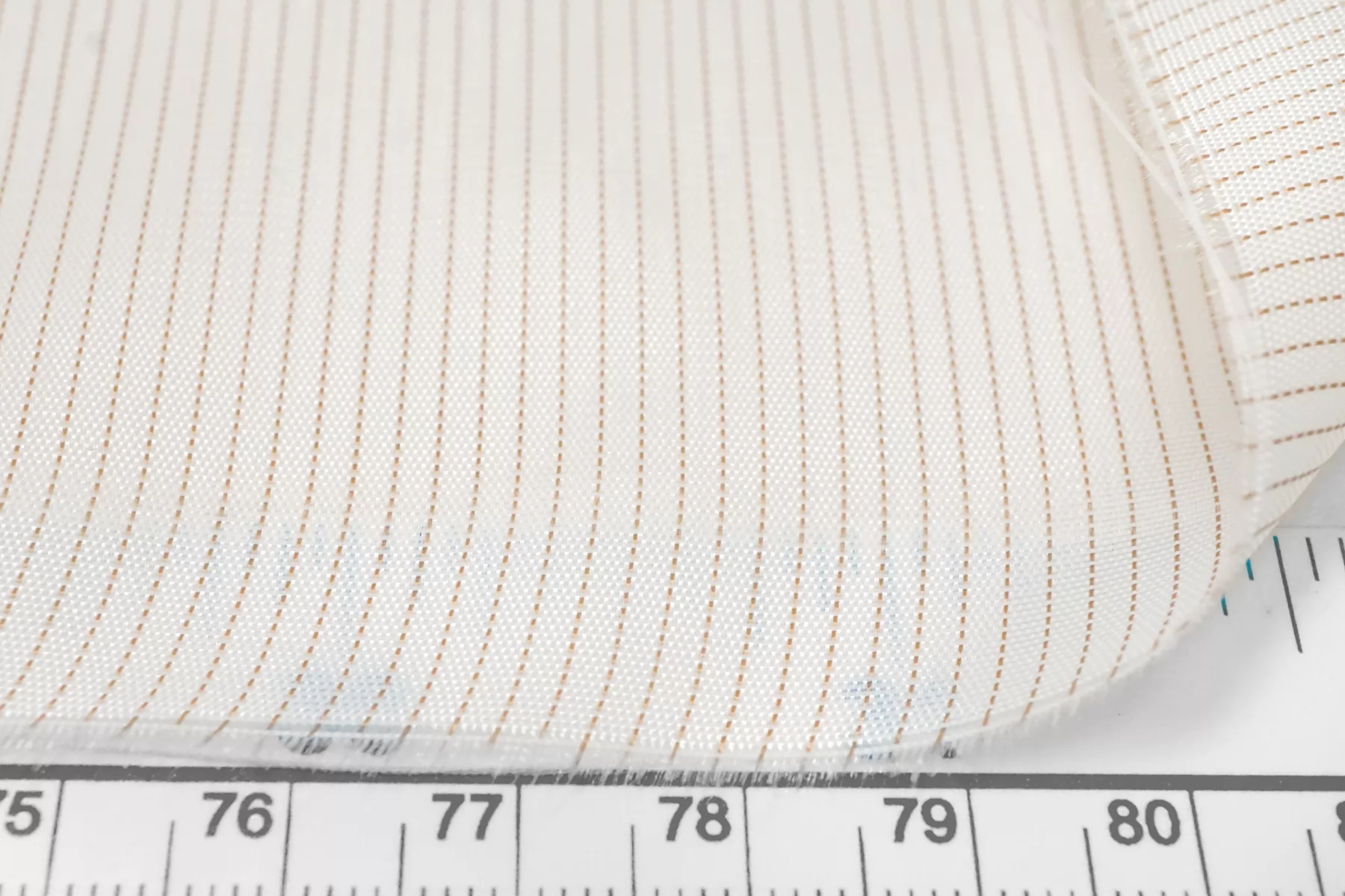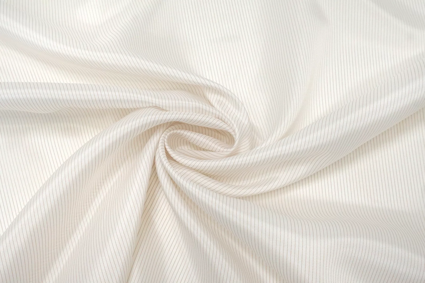 Подкладочная вискоза с ацетатом в полоску (вдоль кромки), нити белого и бежевого цвета. Гладкая, тонкая, обладает легким лоском. Не тянется. Мнется. Подойдет как подкладочный материал к костюмно-плательной группе, лёгким курткам. Обязательно учитывайте возможную усадку 5-10%