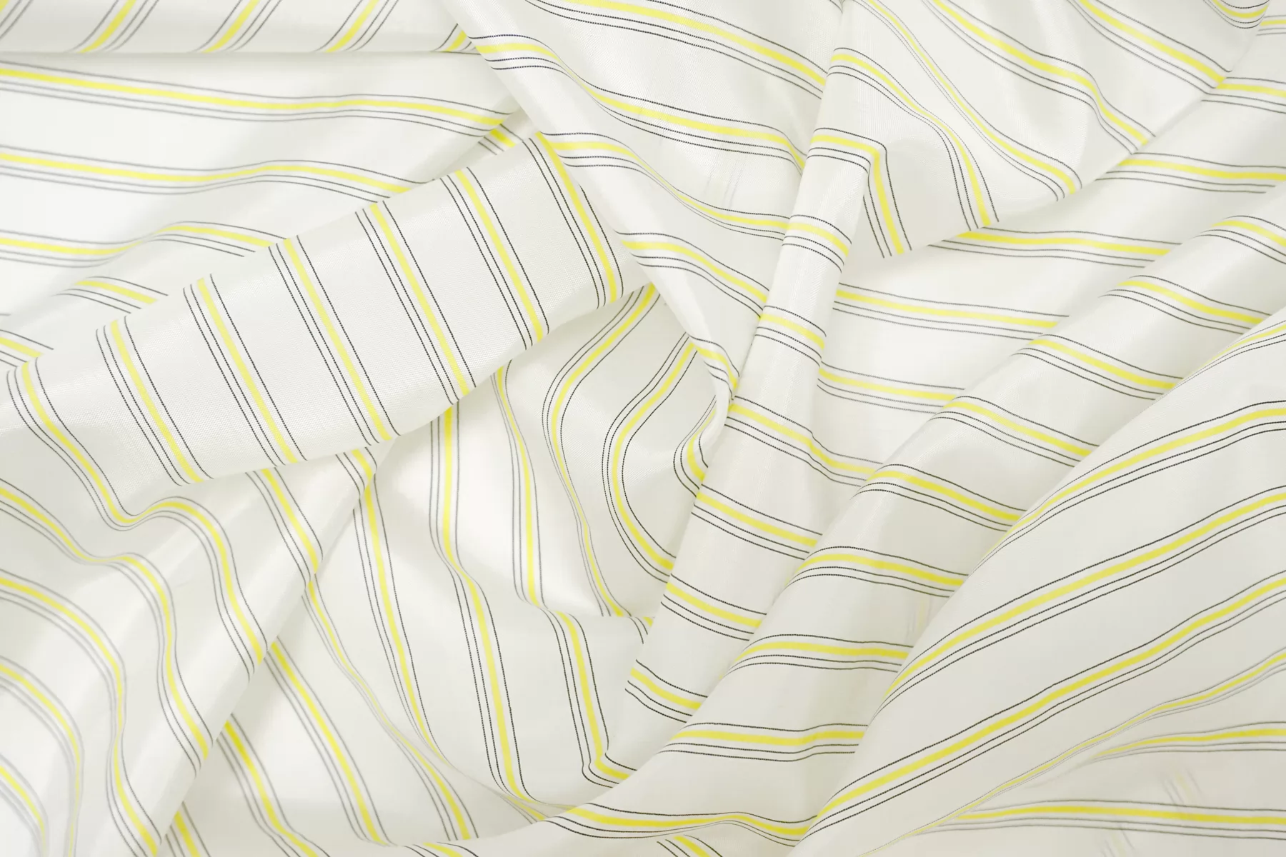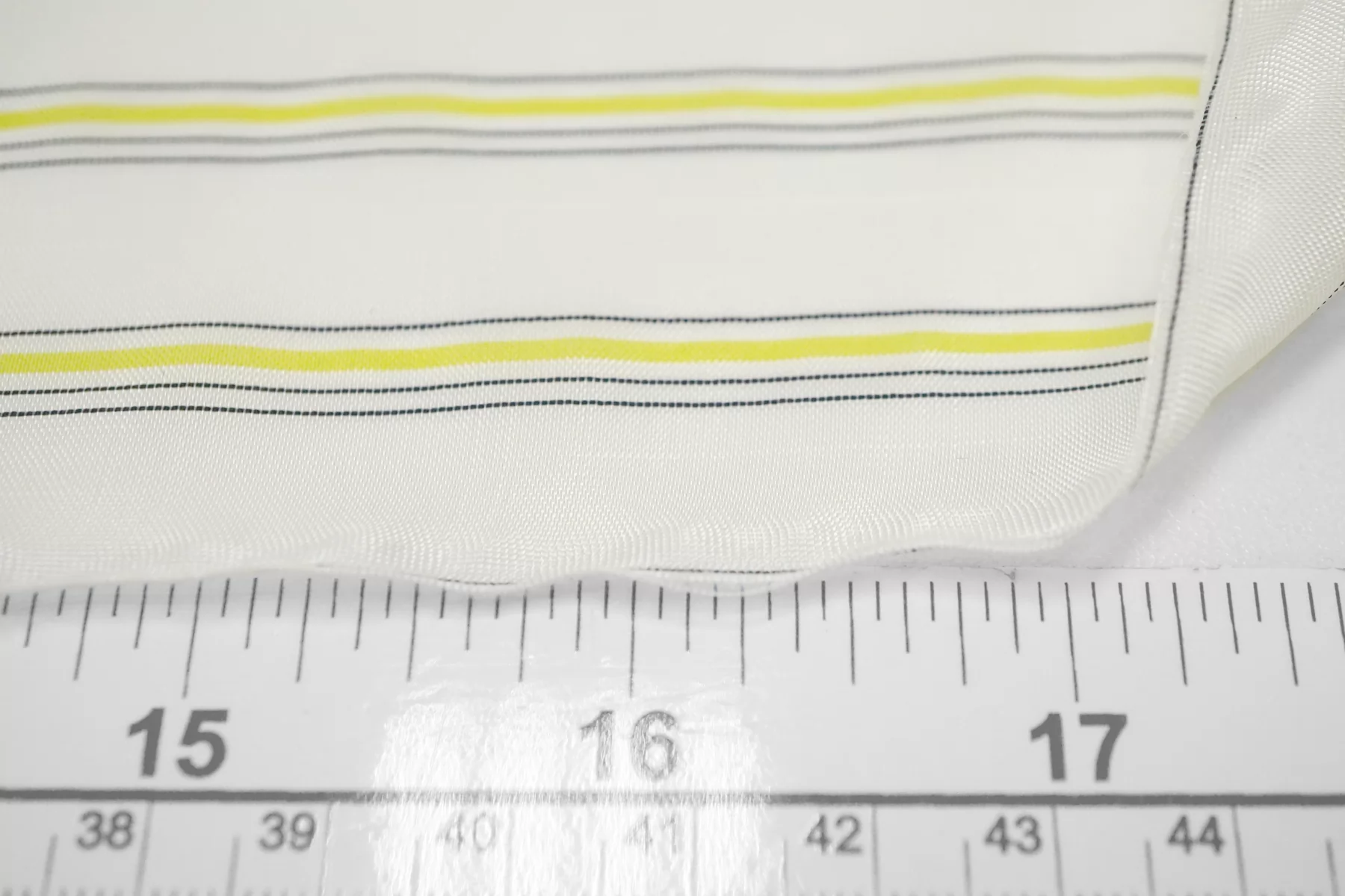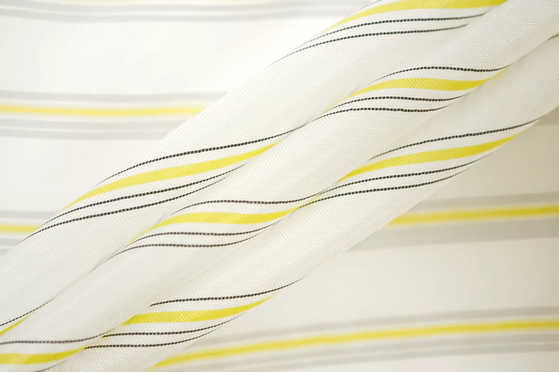 Подкладочная вискоза с ацетатом в полоску (поперёк кромки), нити белого, жёлтого и чёрного цвета. Гладкая, тонкая, обладает легким лоском. Не тянется. Мнется. Подойдет как подкладочный материал к костюмно-плательной группе, лёгким курткам. Обязательно учитывайте возможную усадку 5-10%