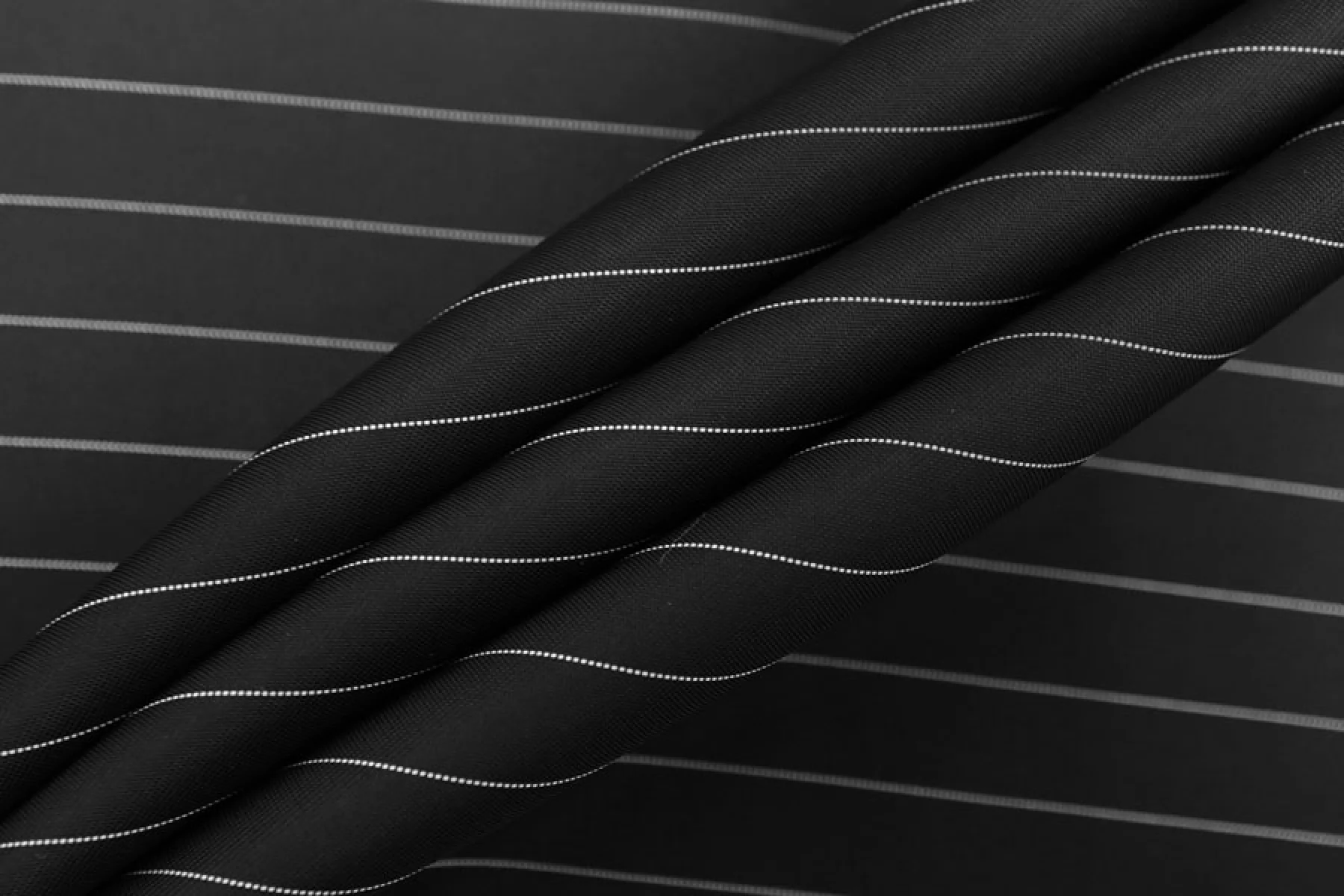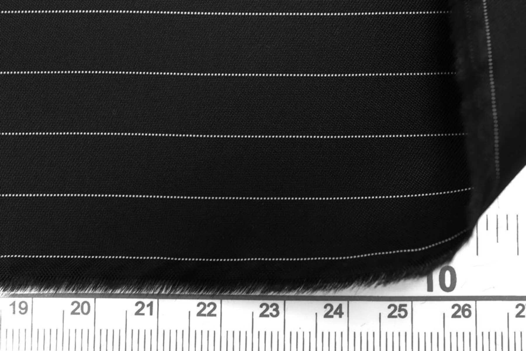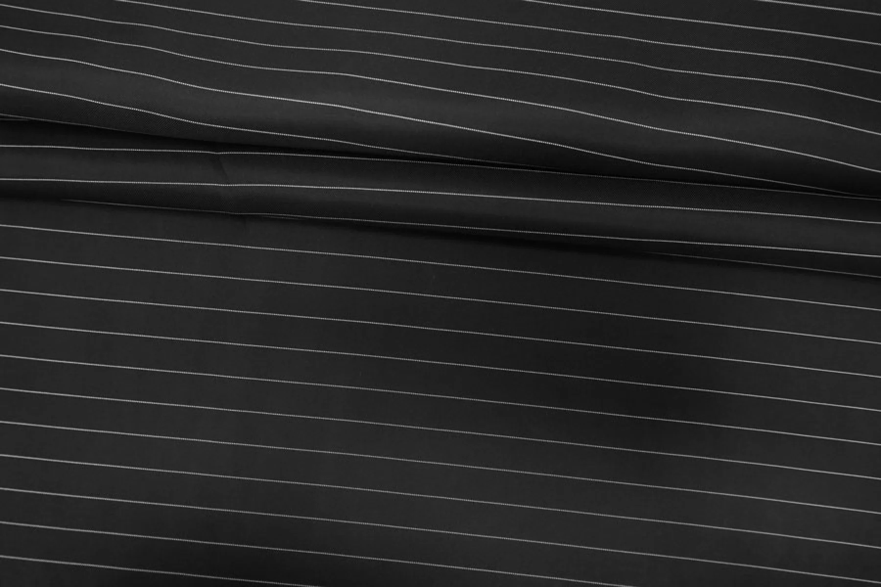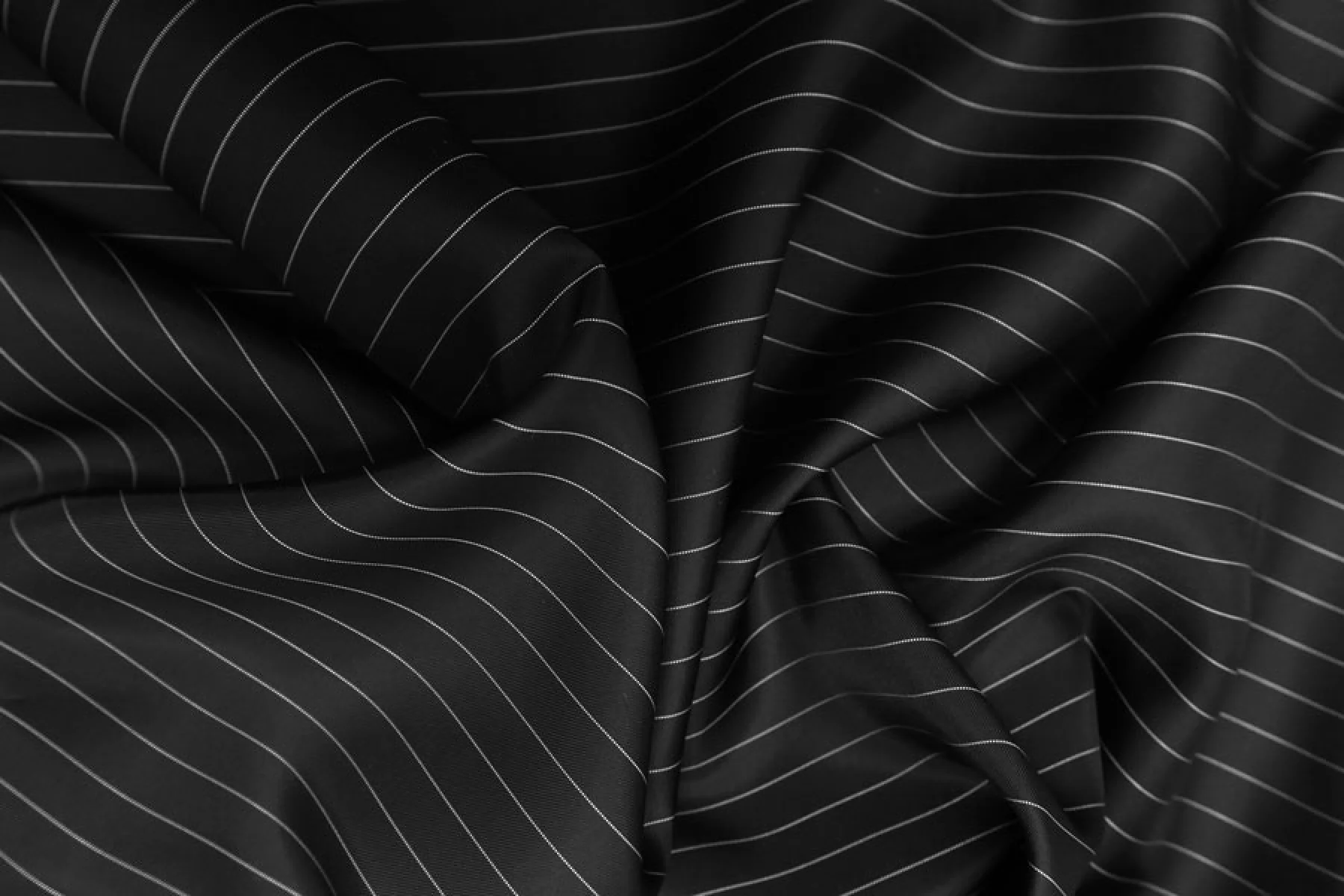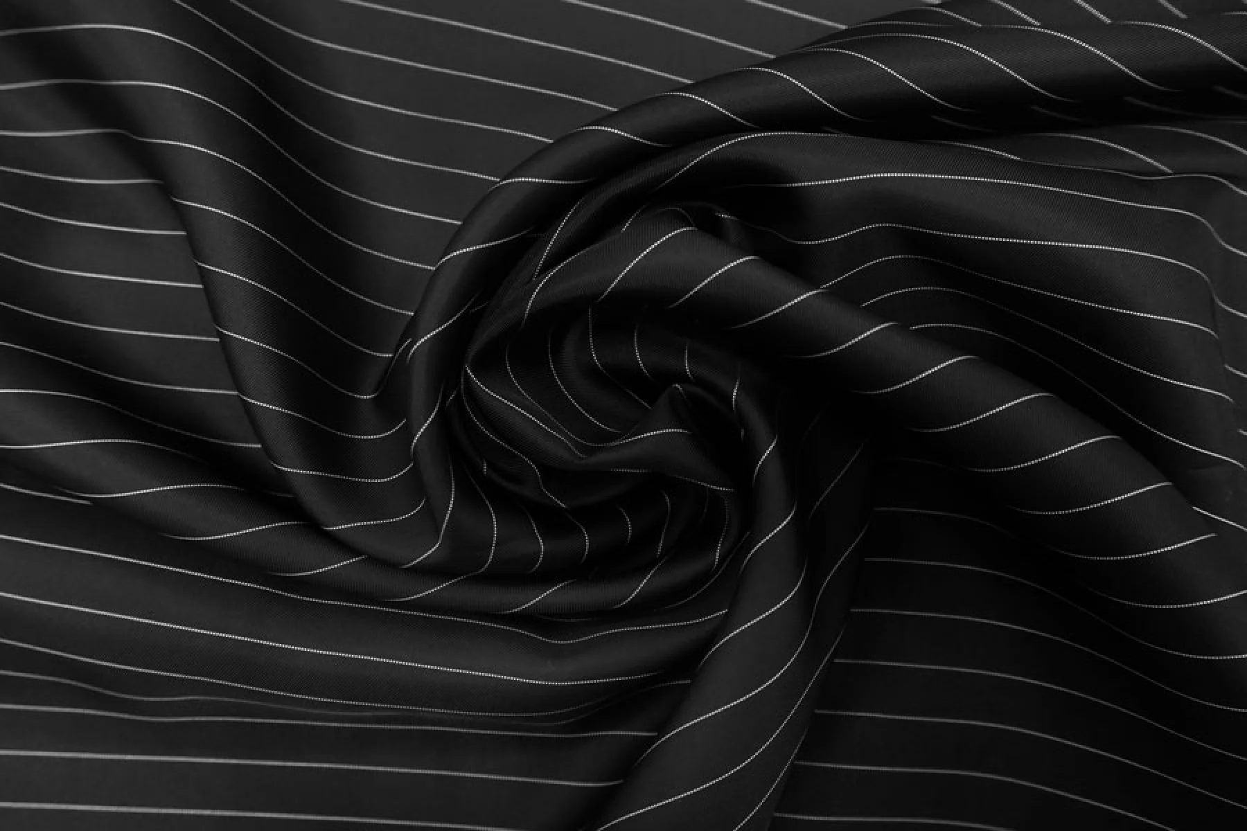 Подкладочная итальянская вискоза черного цвета в белую тонкую полоску, плетение диагональное. Шелковистая, обладает легким блеском, тонкая. Подойдет на подкладку к костюмной группе, демисезонным пальто, курткам.
