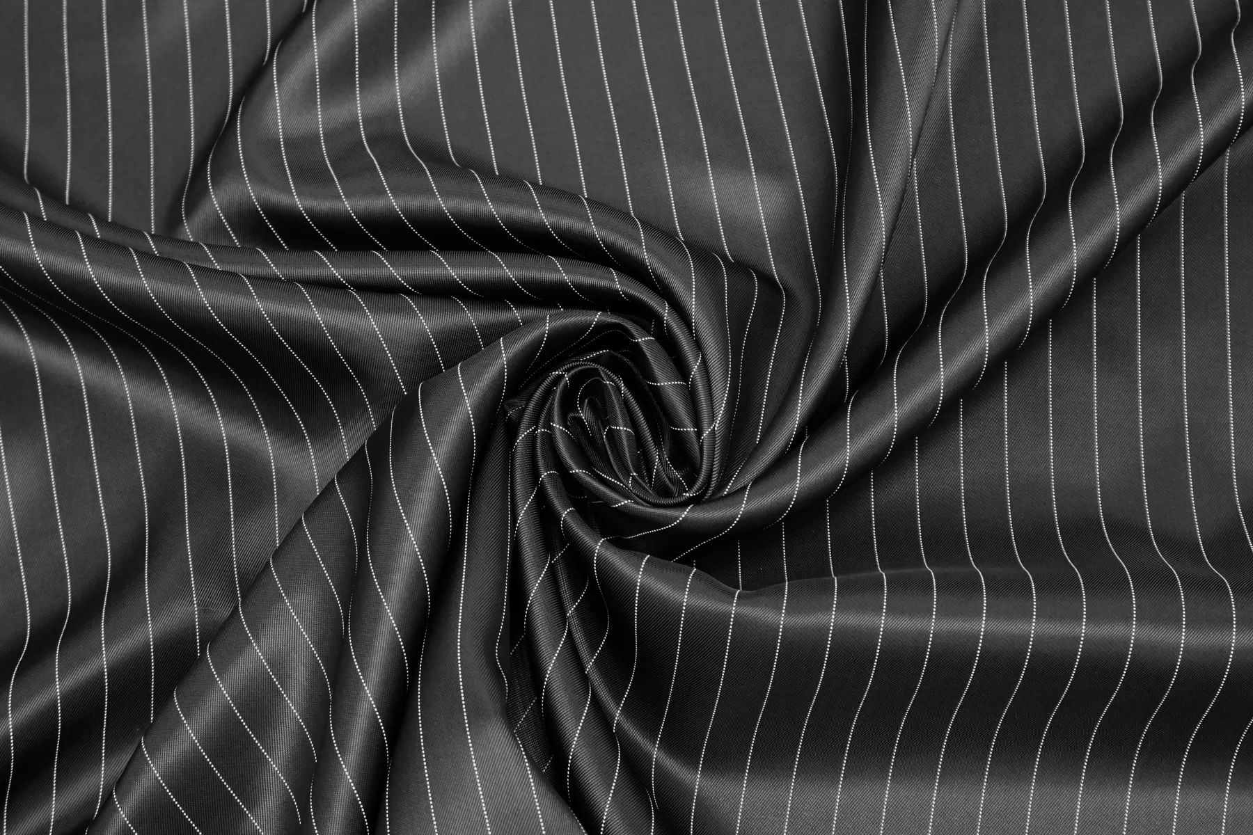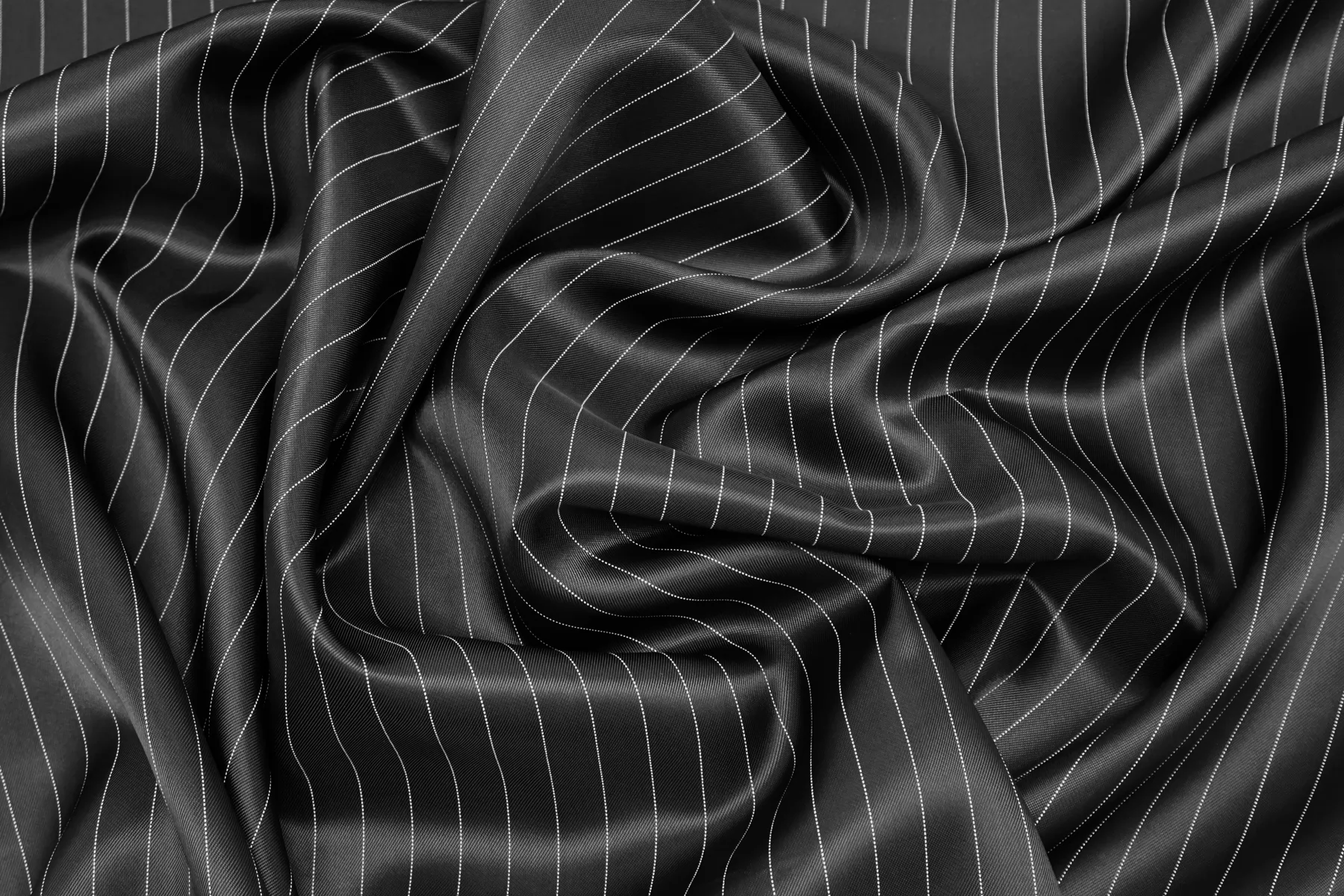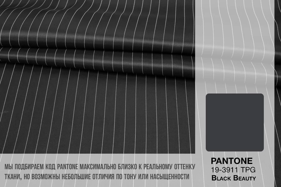 Подкладочная итальянская вискоза темно-серого цвета в тонкую белую полоску (вдоль кромки), плетение саржевое. Шелковистая, обладает легким блеском, тонкая. Подойдет на подкладку к костюмной группе, демисезонным пальто, курткам.
