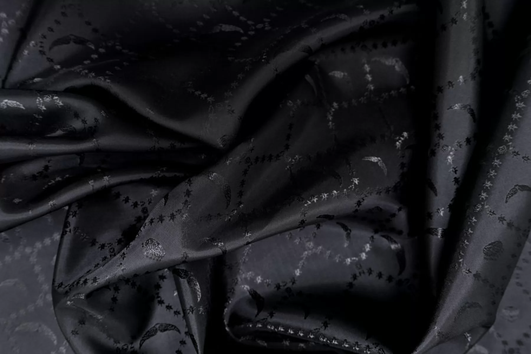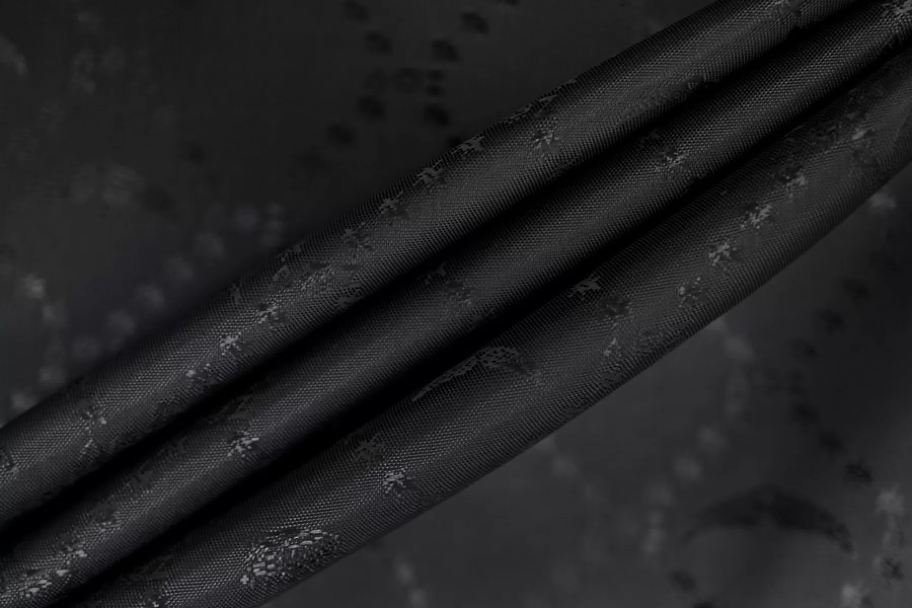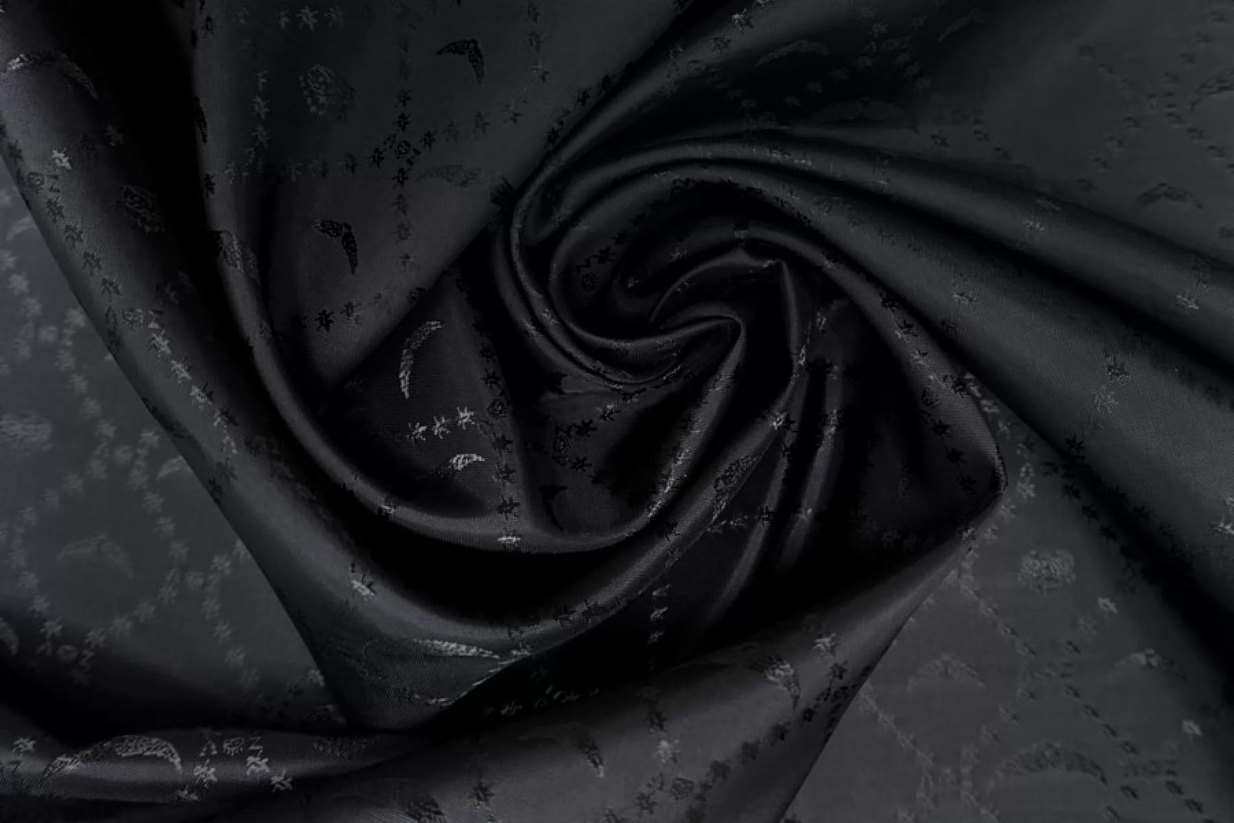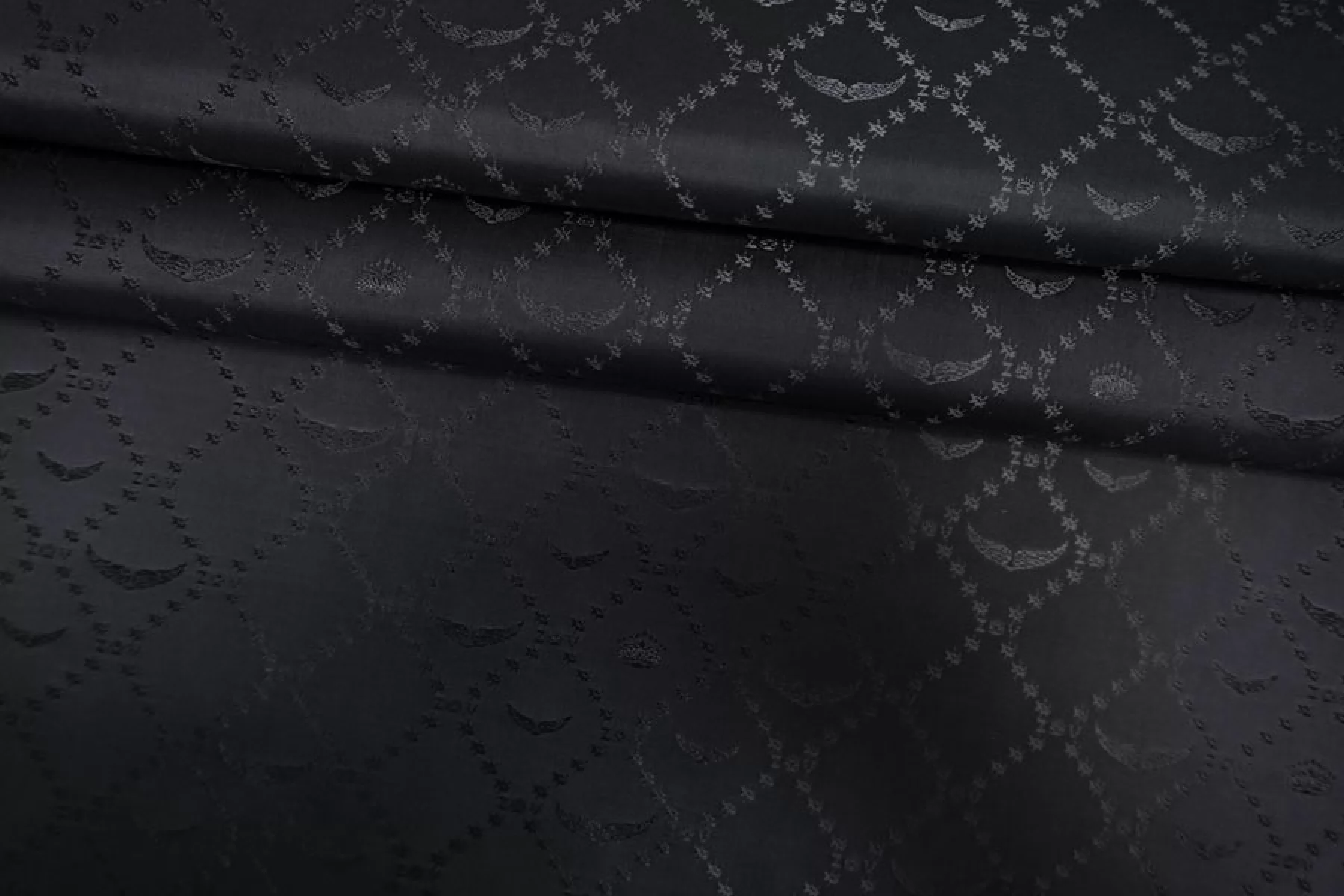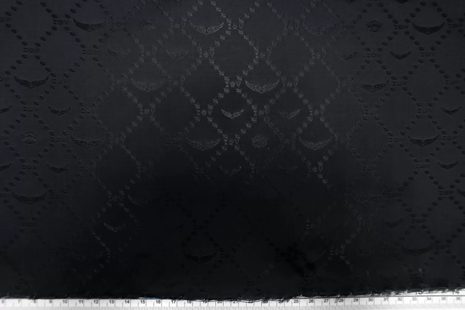 Подкладочная вискоза очень тёмного синего цвета от бренда Zadig & Voltaire, в основе полотняное плетение, с жаккардовым узором. Тактильно приятная, мягкая. Достаточно тонкая и легкая. Не тянется. Немного мнется. Отличный вариант подкладки к костюмно-плательной группе. Обязательно учитывайте возможную усадку 5-10%