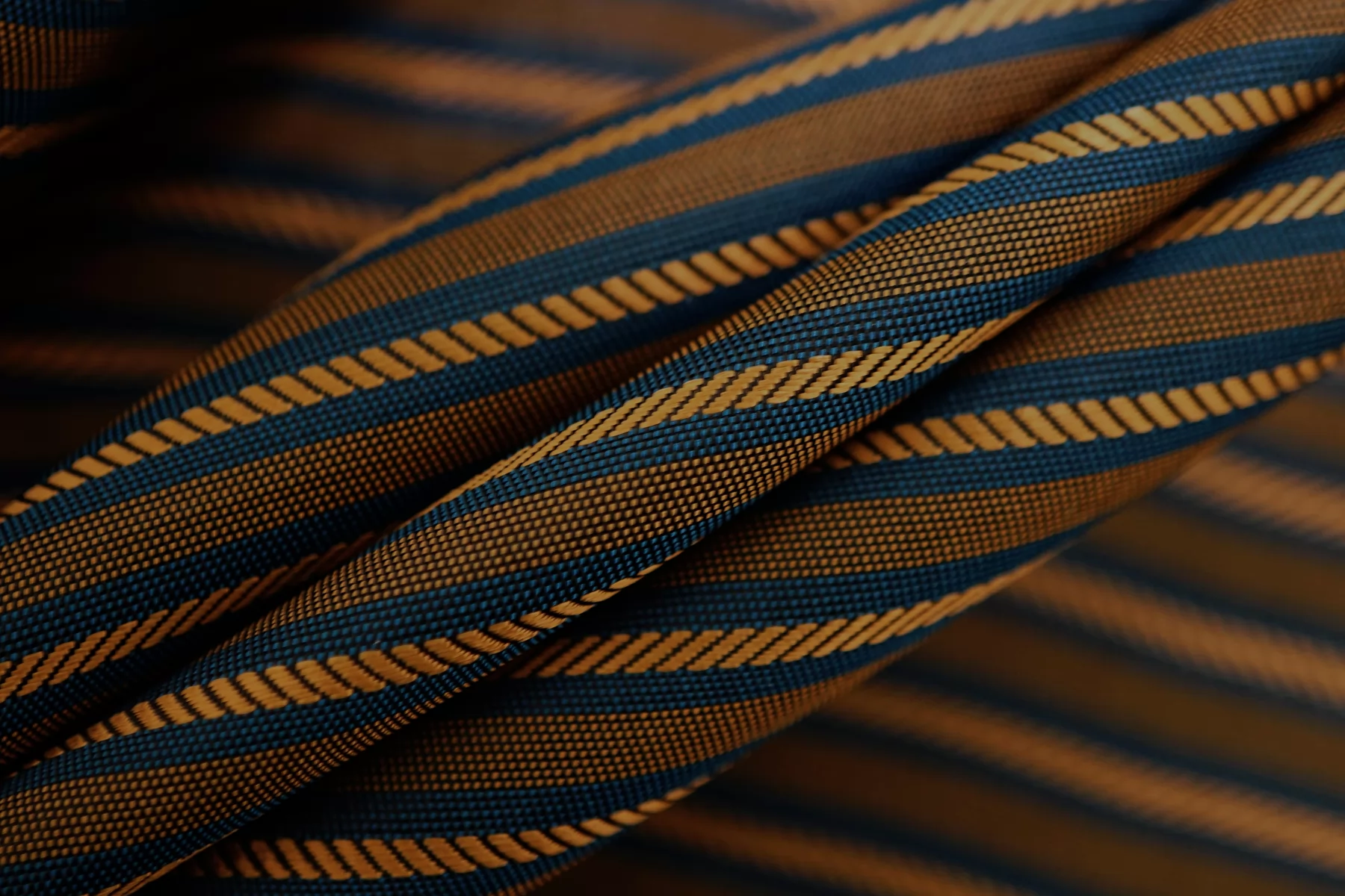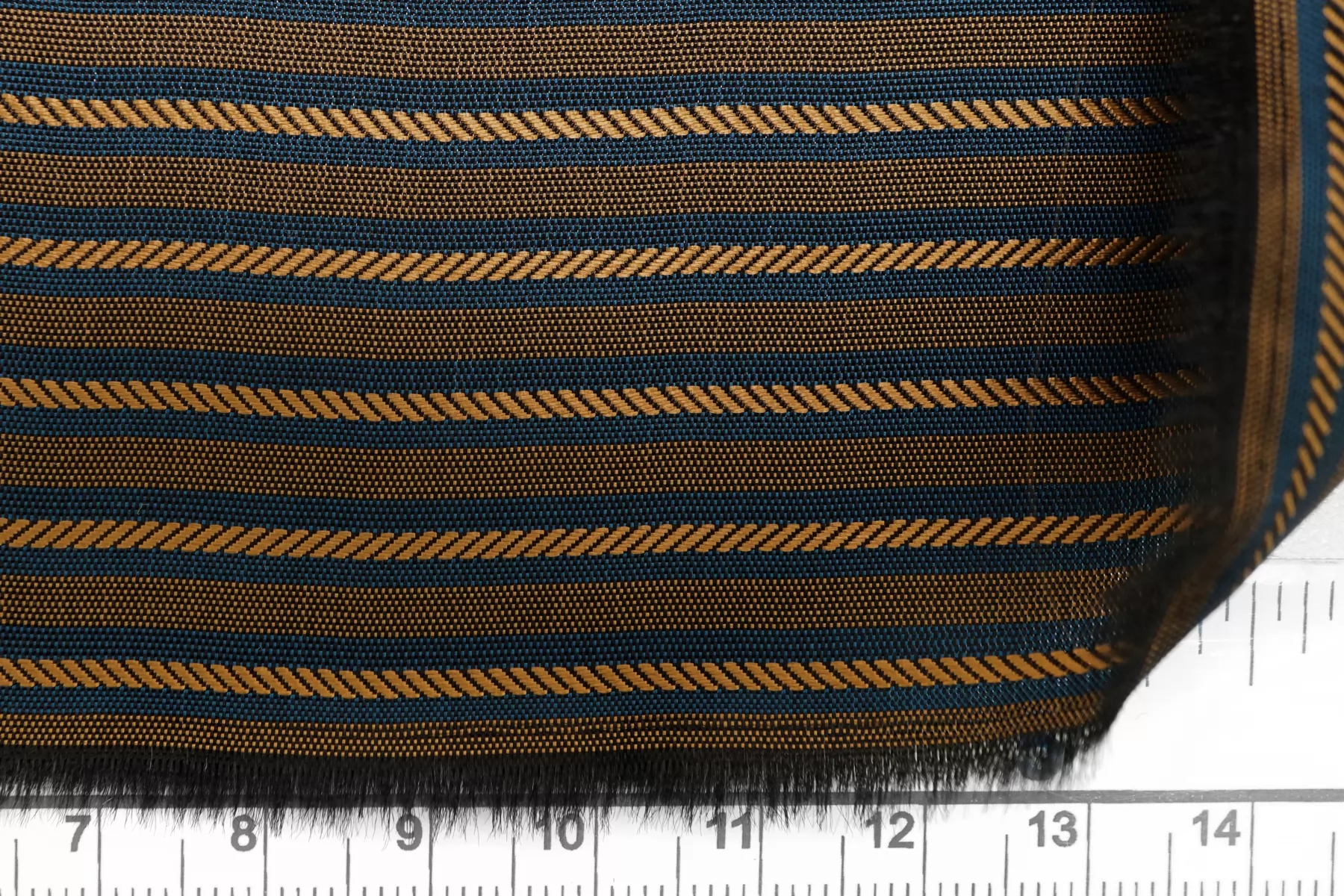 Подкладочная жаккардовая вискоза с ацетатом с выработкой-полоской (поперек кромки), нити бронзово-коричневого, тёмно-бирюзового и чёрного цвета. Тактильно приятная, мягкая, скользящая. Обладает красивым лоском. Не тянется. Прекрасно подойдет к костюмно-плательной группе, легким демисезонным пальто и курткам. Обязательно учитывайте возможную усадку 5-10%