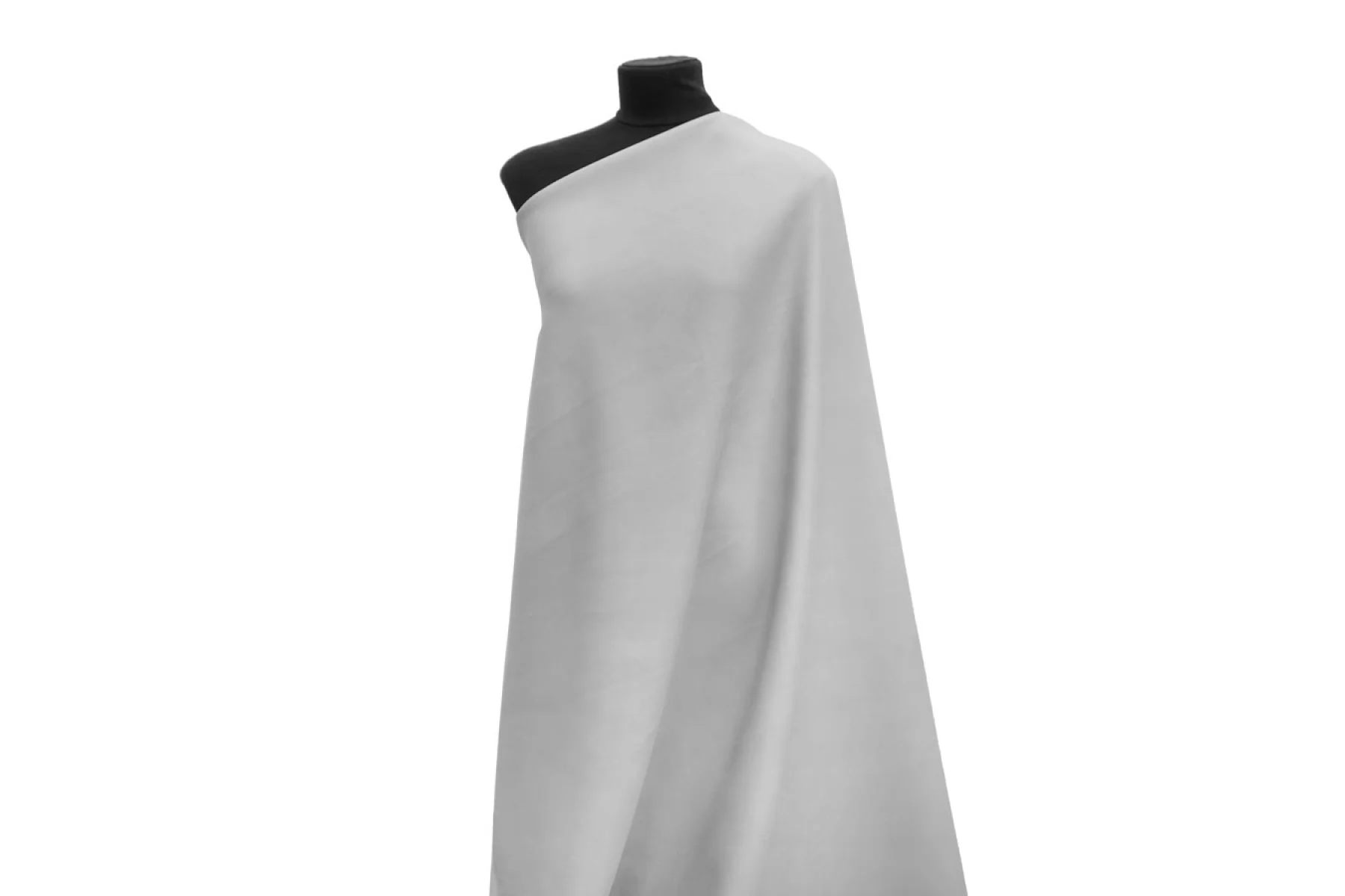 Плотный двойной хлопок в стильном оттенке серого льда. Материал достаточно толстый (1 мм), но при этом достаточно упругий и мягкий, напоминая по пластике неопрен, хорошо держит форму мягкими складками. Плетение диагональное. Ткань гладкая, мягкая, приятная наощупь. Идеально подойдет для пошива жакета, демисезонной юбки, брюк, платья и изделий с объемными складками.