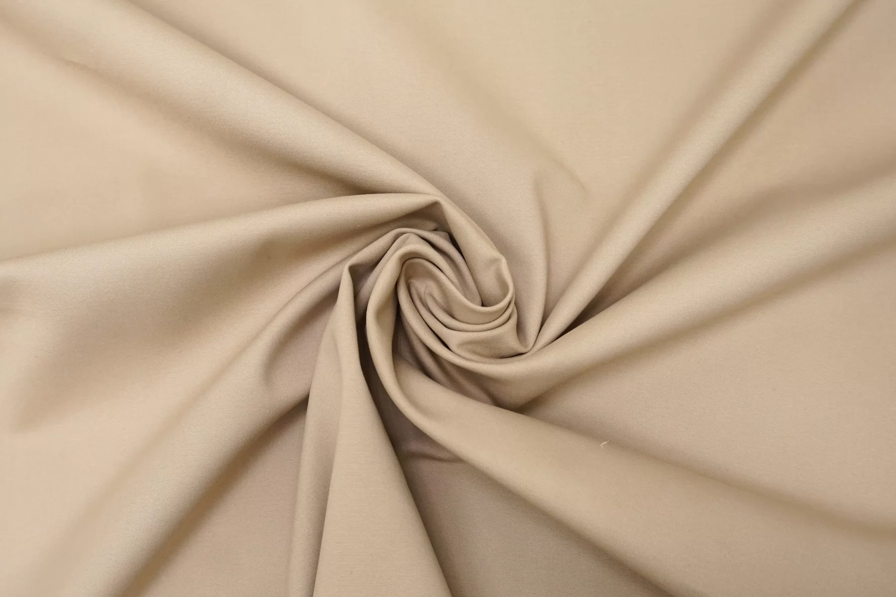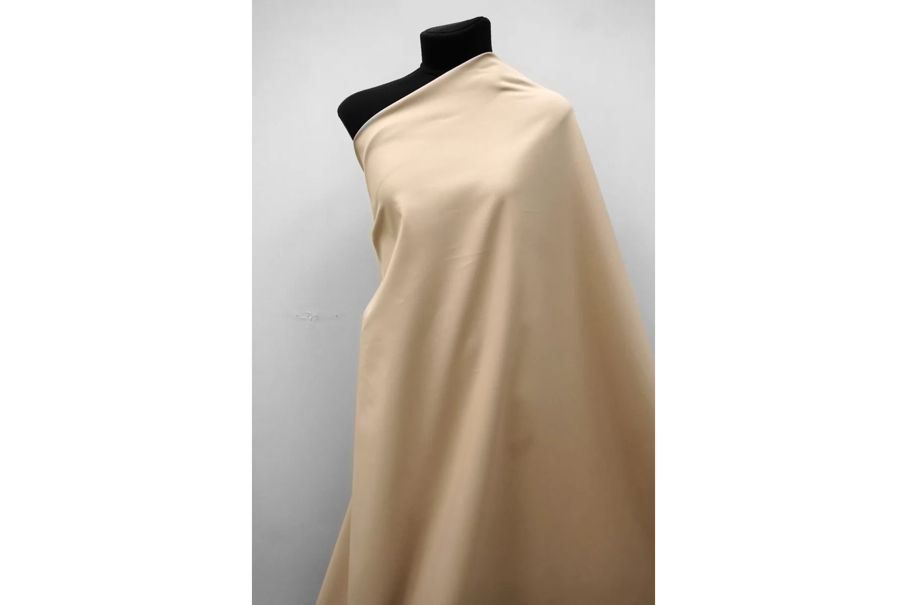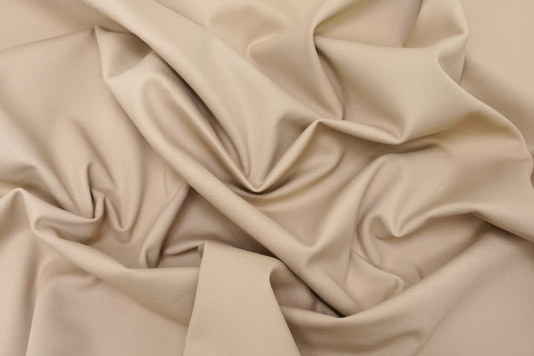 Отличного качества поликоттон бежевого цвета, полотняного плетения от бренда Max Mara. Тактильно очень приятный, мягкий, гладкий. Достаточно плотный, хорошо тянется. Не просвечивает. Немного мнется. Упругая пластика, форму держит. Шьем костюмы, платья, юбки, брюки и не только.