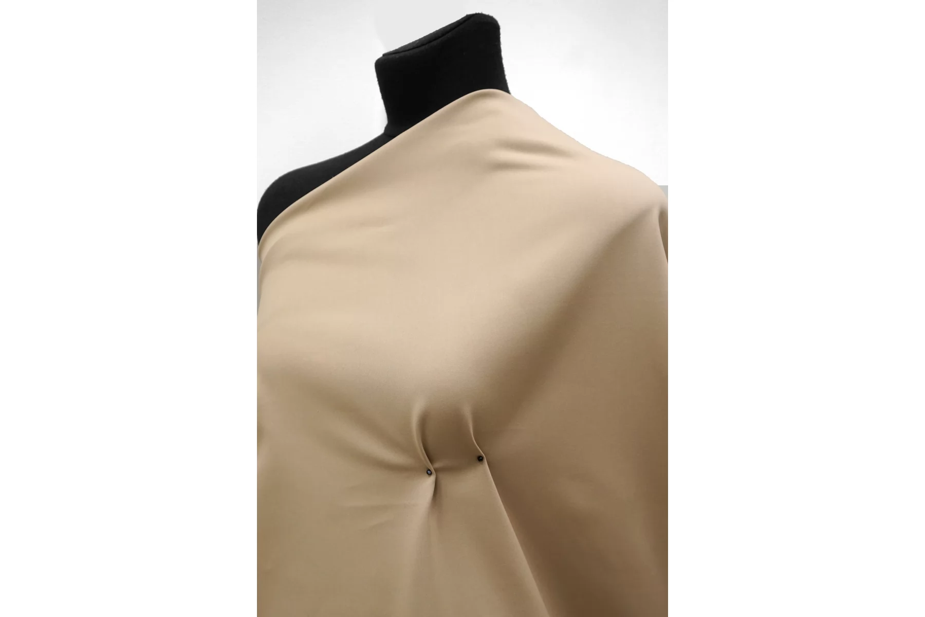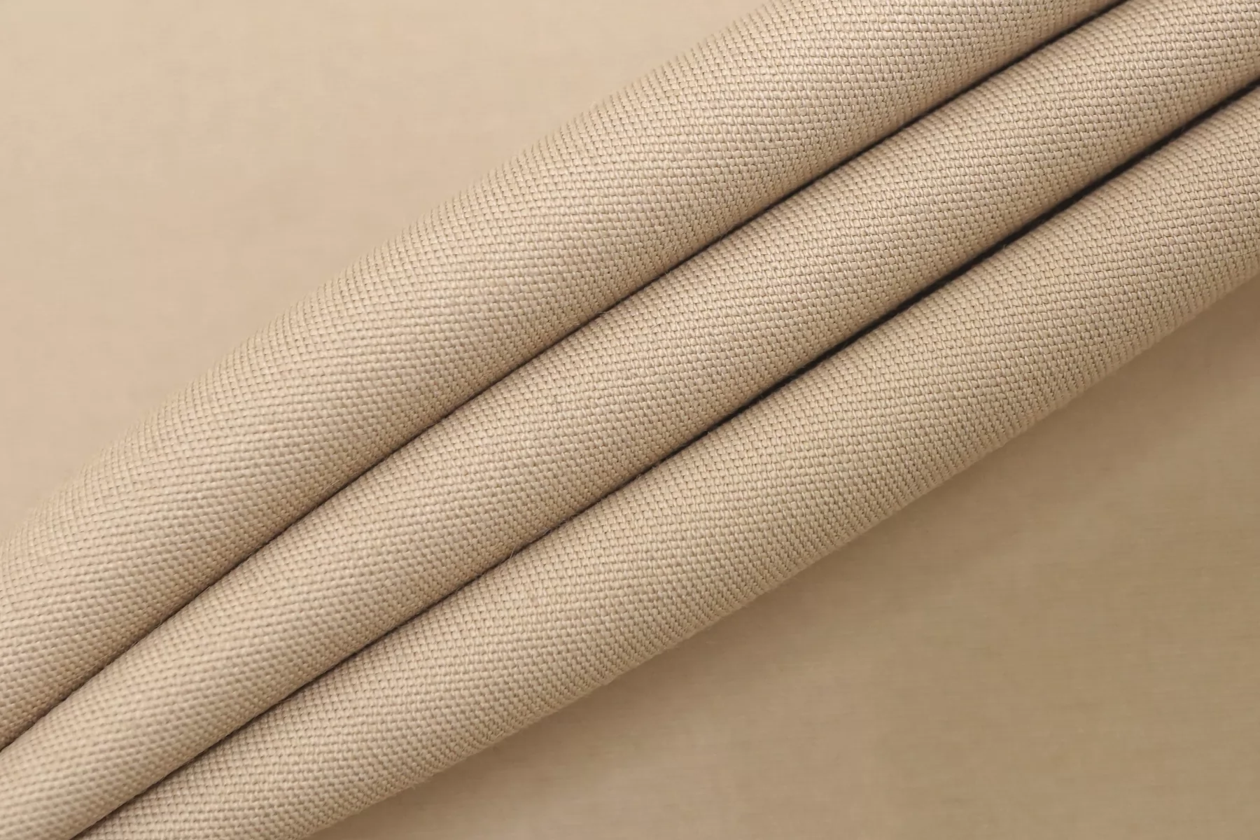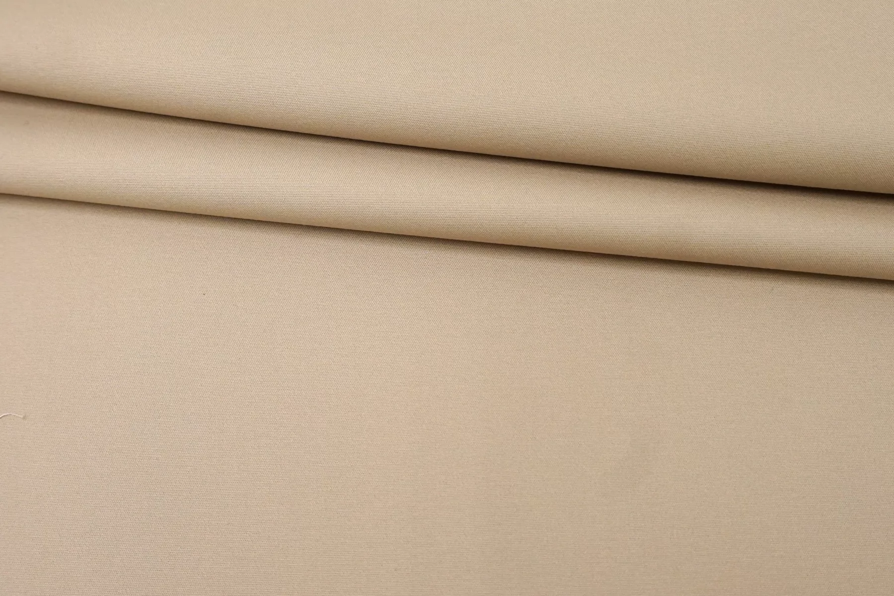 Отличного качества поликоттон бежевого цвета, полотняного плетения от бренда Max Mara. Тактильно очень приятный, мягкий, гладкий. Достаточно плотный, хорошо тянется. Не просвечивает. Немного мнется. Упругая пластика, форму держит. Шьем костюмы, платья, юбки, брюки и не только.