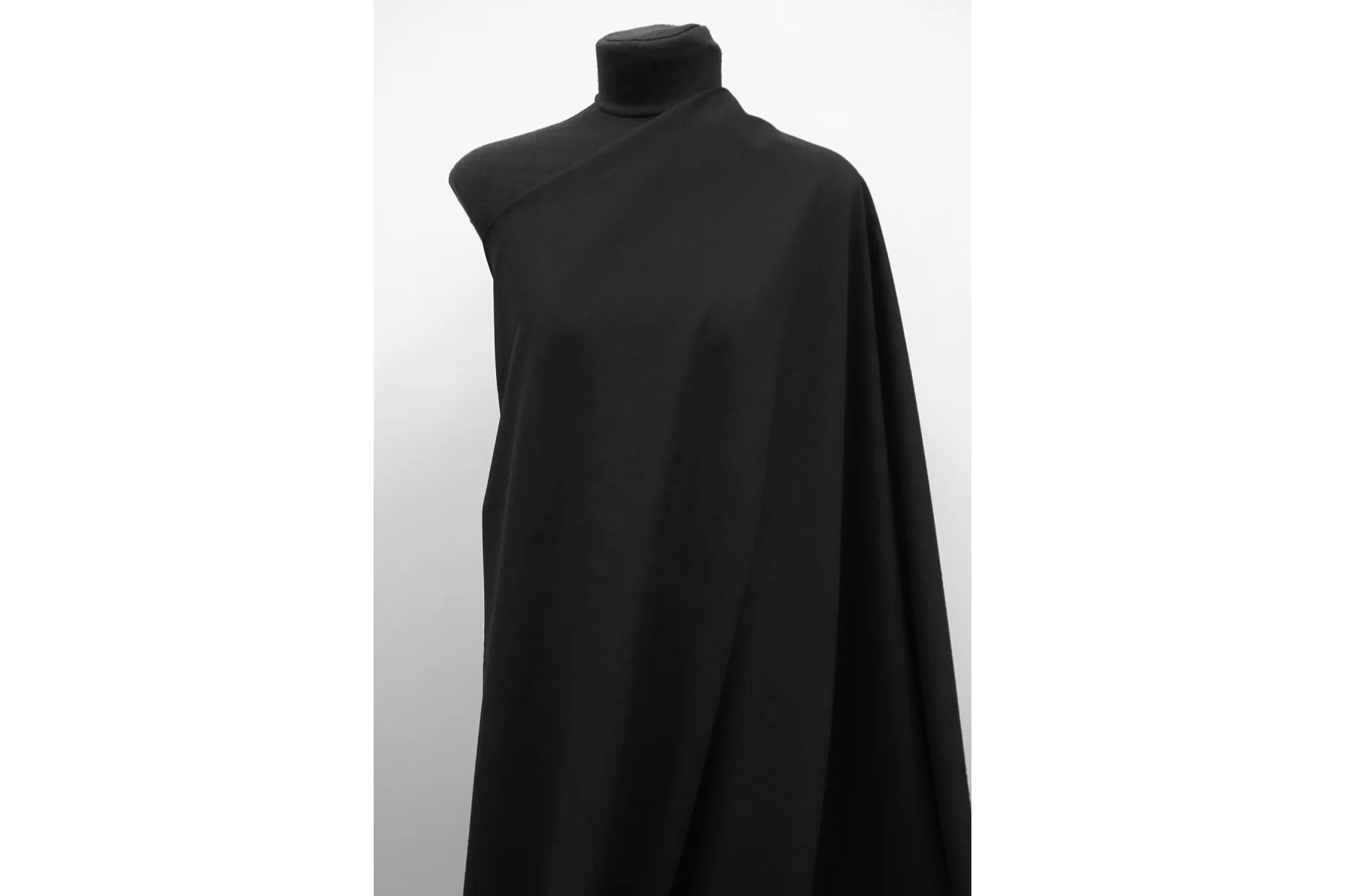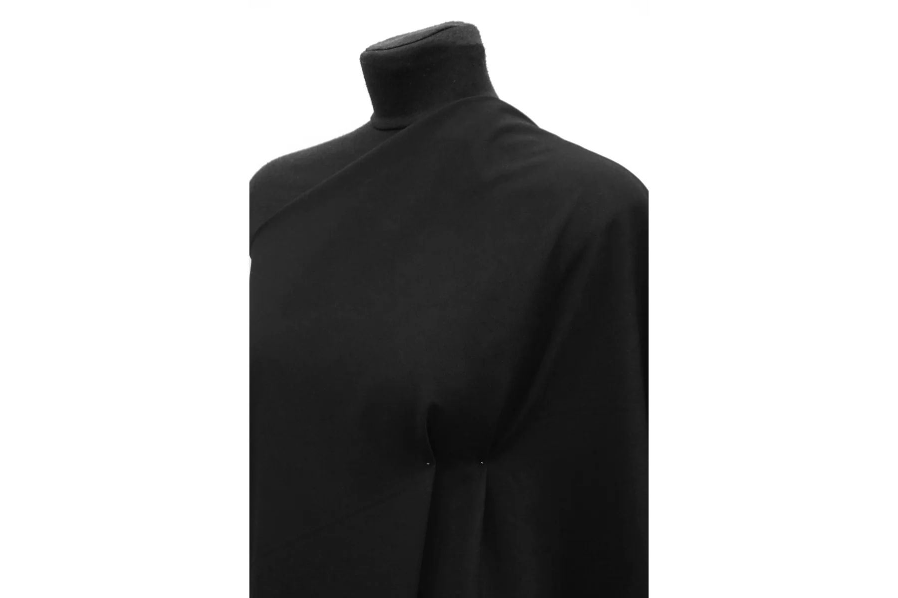Костюмно-плательная поливискоза от бренда Max Mara в чёрном цвете, полотняного плетения. Пластичная, мягкая и приятная тактильно. Не мнется. Не просвечивает. Тянется по всем направлениям. Поливискоза отличается хорошей износостойкостью и прочностью. Уход деликатный. Шьем платья, костюмные варианты, брюки, мягкие жакеты и не только.
