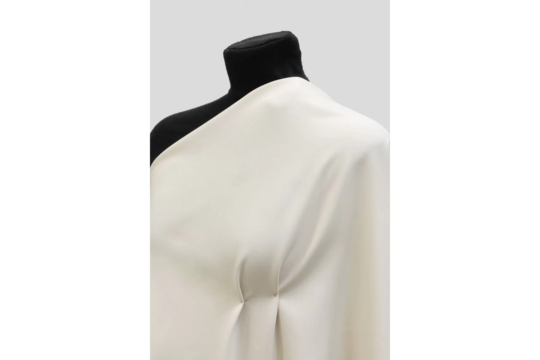 Костюмно-плательная поливискоза от бренда Max Mara в молочном цвете, диагонального плетения. Пластичная, мягкая и приятная тактильно. Не мнется. Не просвечивает. Тянется по всем направлениям. Поливискоза отличается хорошей износостойкостью и прочностью. Уход деликатный. Шьем платья, брюки, шорты, юбки, костюмы мягкой формы.