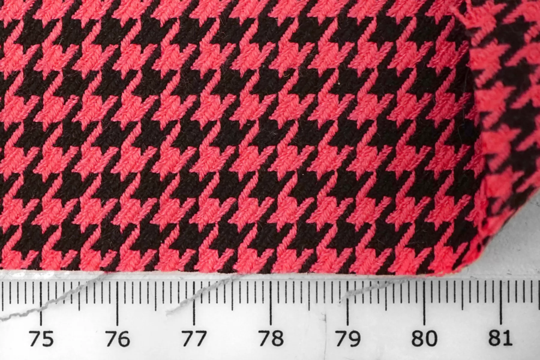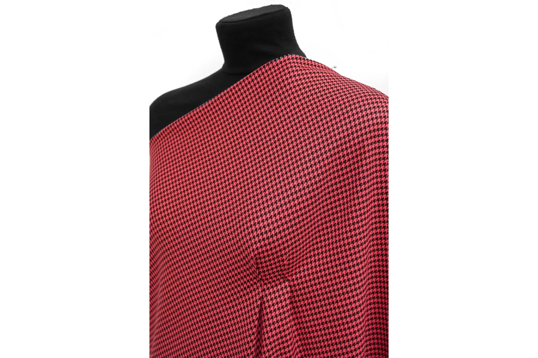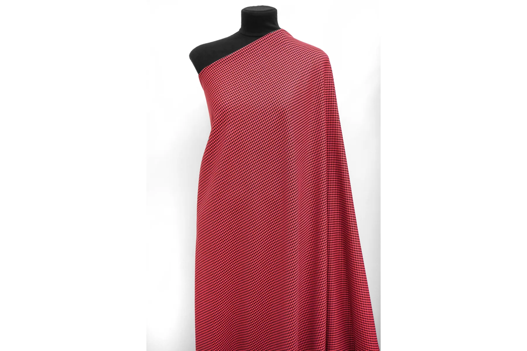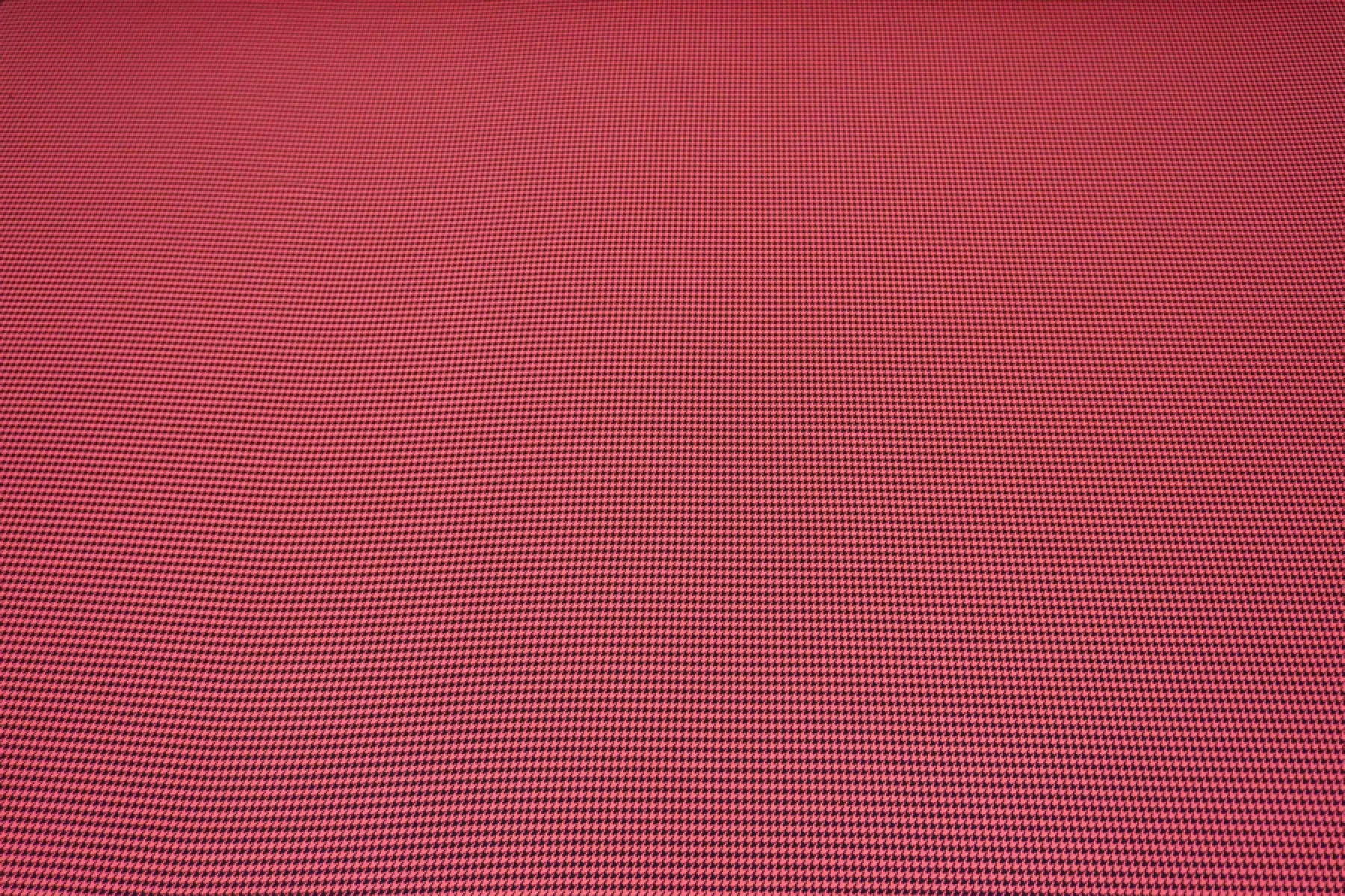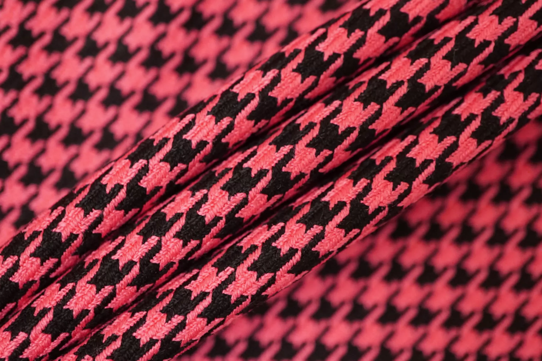 Прекрасная костюмно-плательная вискоза с добавлением полиэстера с принтом в виде мелкой гусиной лапке в ярко розовом и черном цвете. Тактильно мягкая и гладкая. С красивым лоском. Совсем слегка тянется. Форму держит, пластична. Края осыпаются. Не просвечивает. Отличный вариант на яркие костюмы, жакеты, юбки, платья.