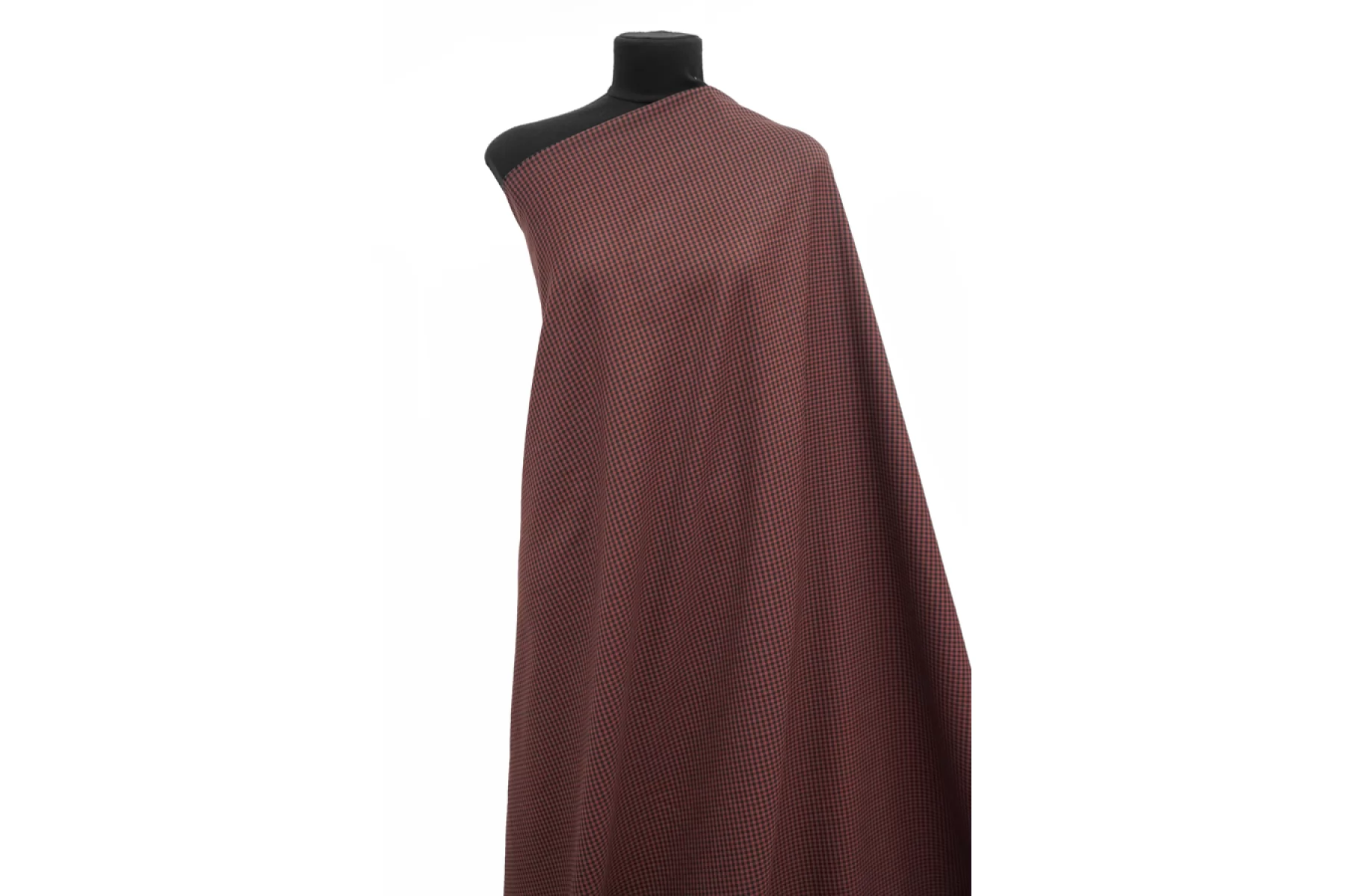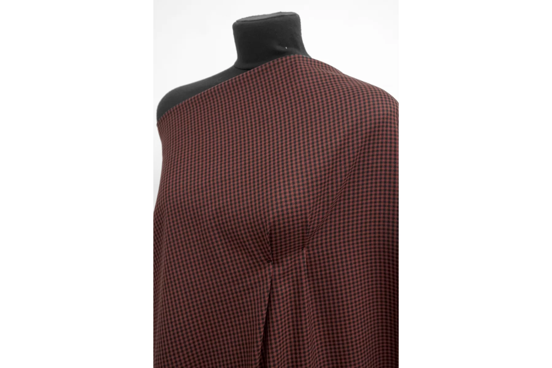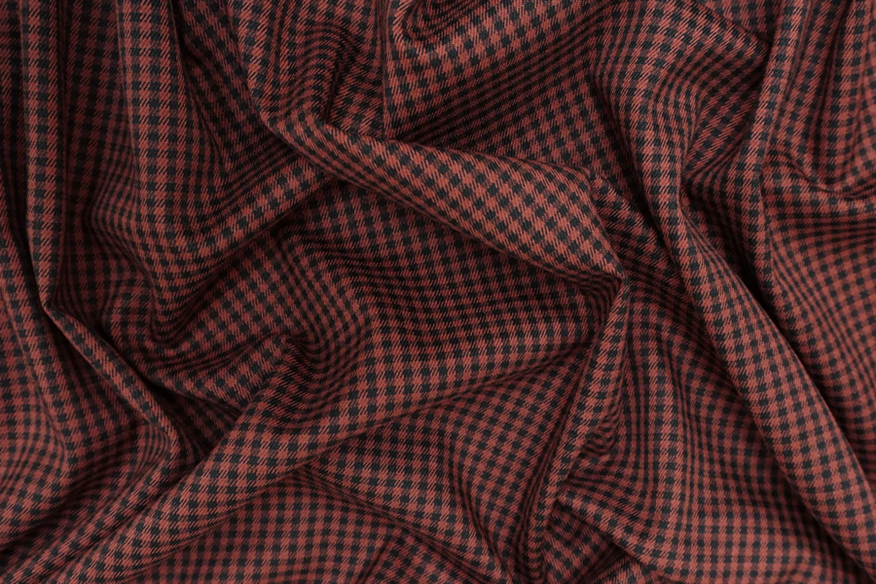 Отличная костюмно-плательная вискоза в мелкую клетку, диагонального переплетения нитей оттенков красно-коричневого и черного. Тактильно приятная, мягкая. Обладает легким лоском. Не просвечивает. Неплохо тянется за счет небольшого содержания эластана. Практически не мнется. Хорошо драпируется и немного держит форму. Красива в своей пластике. Вариант для пошива костюма, платья, юбки, мягкого жакета и не только.