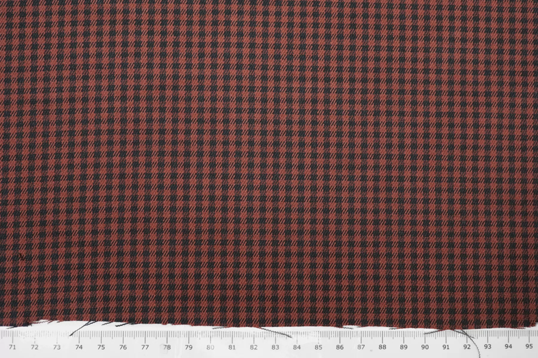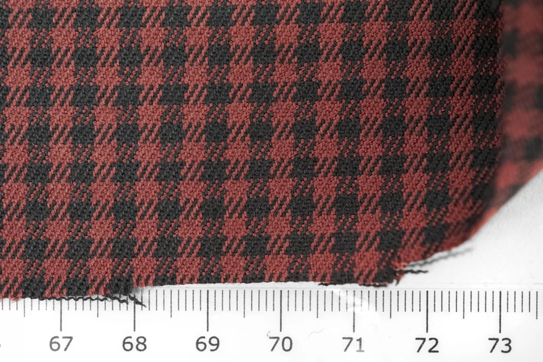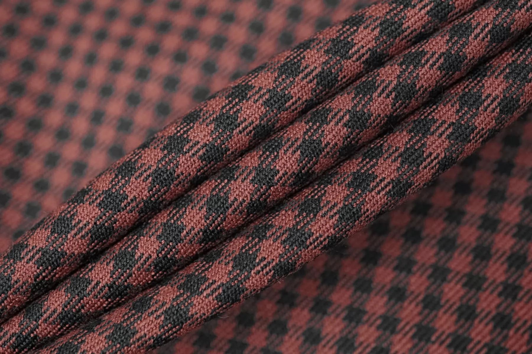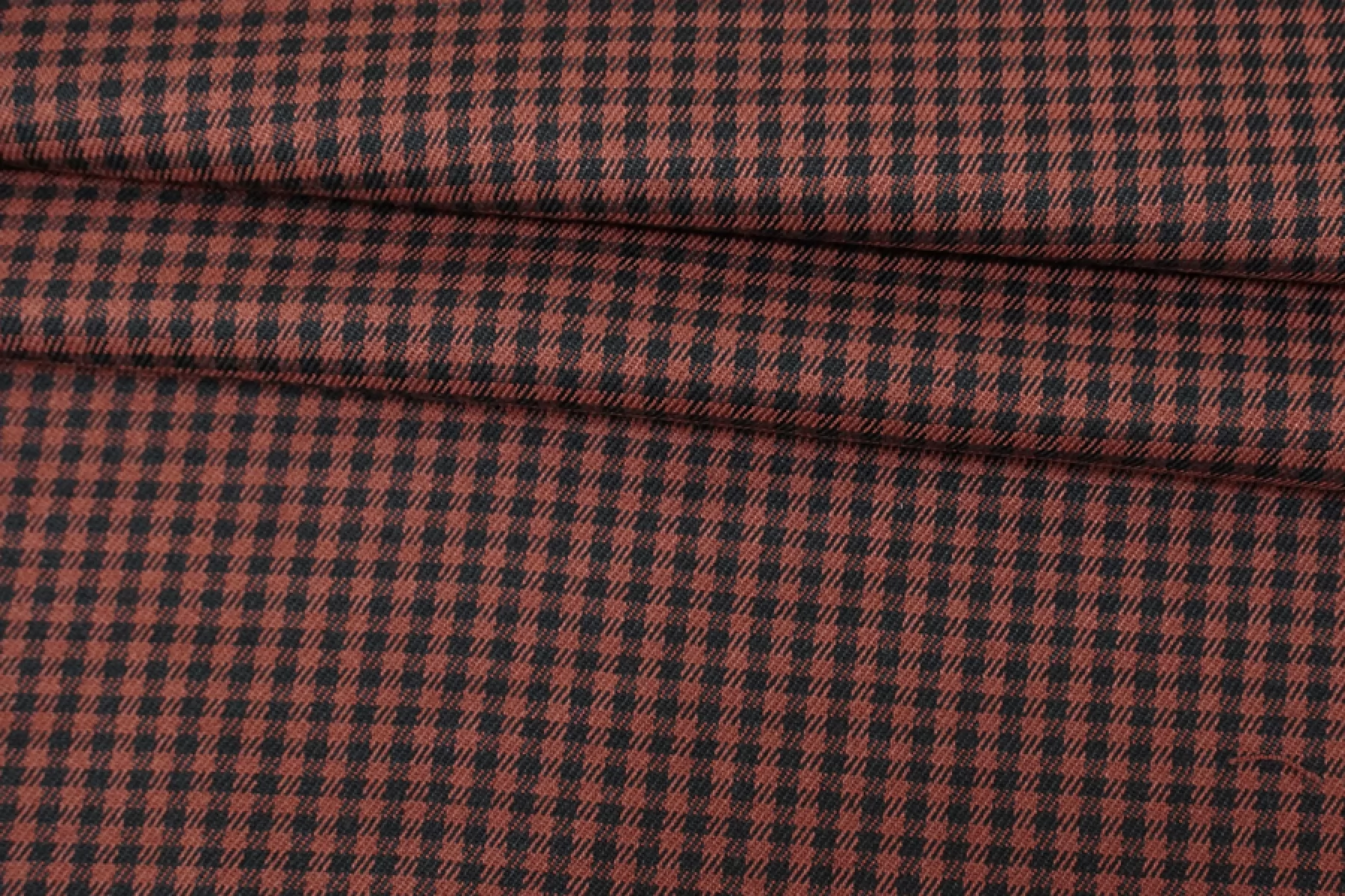 Отличная костюмно-плательная вискоза в мелкую клетку, диагонального переплетения нитей оттенков красно-коричневого и черного. Тактильно приятная, мягкая. Обладает легким лоском. Не просвечивает. Неплохо тянется за счет небольшого содержания эластана. Практически не мнется. Хорошо драпируется и немного держит форму. Красива в своей пластике. Вариант для пошива костюма, платья, юбки, мягкого жакета и не только.