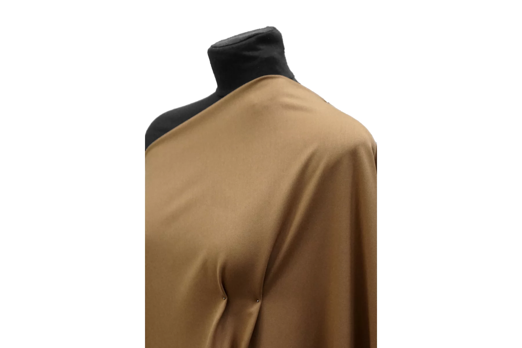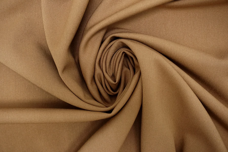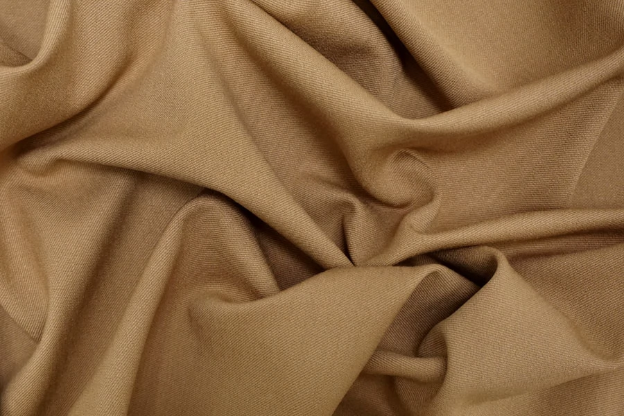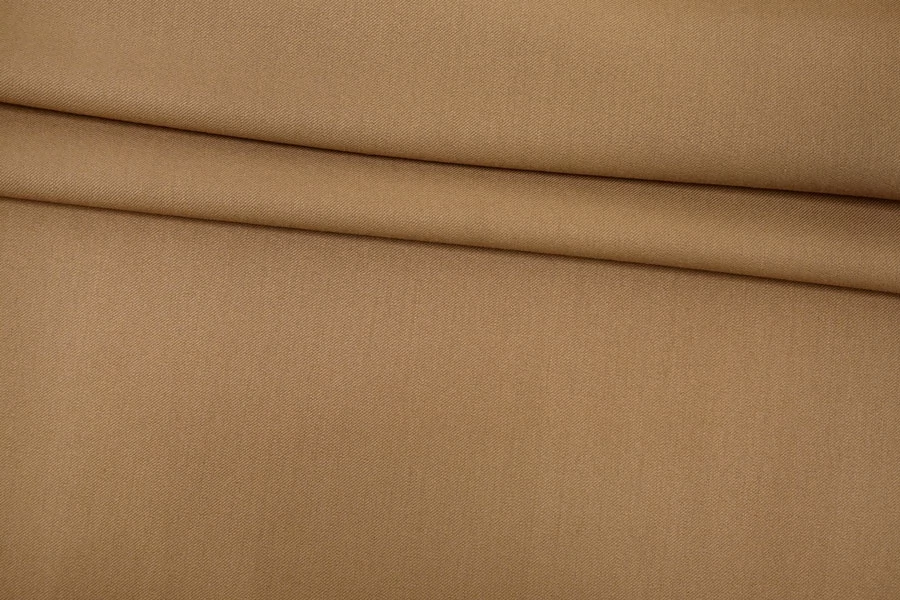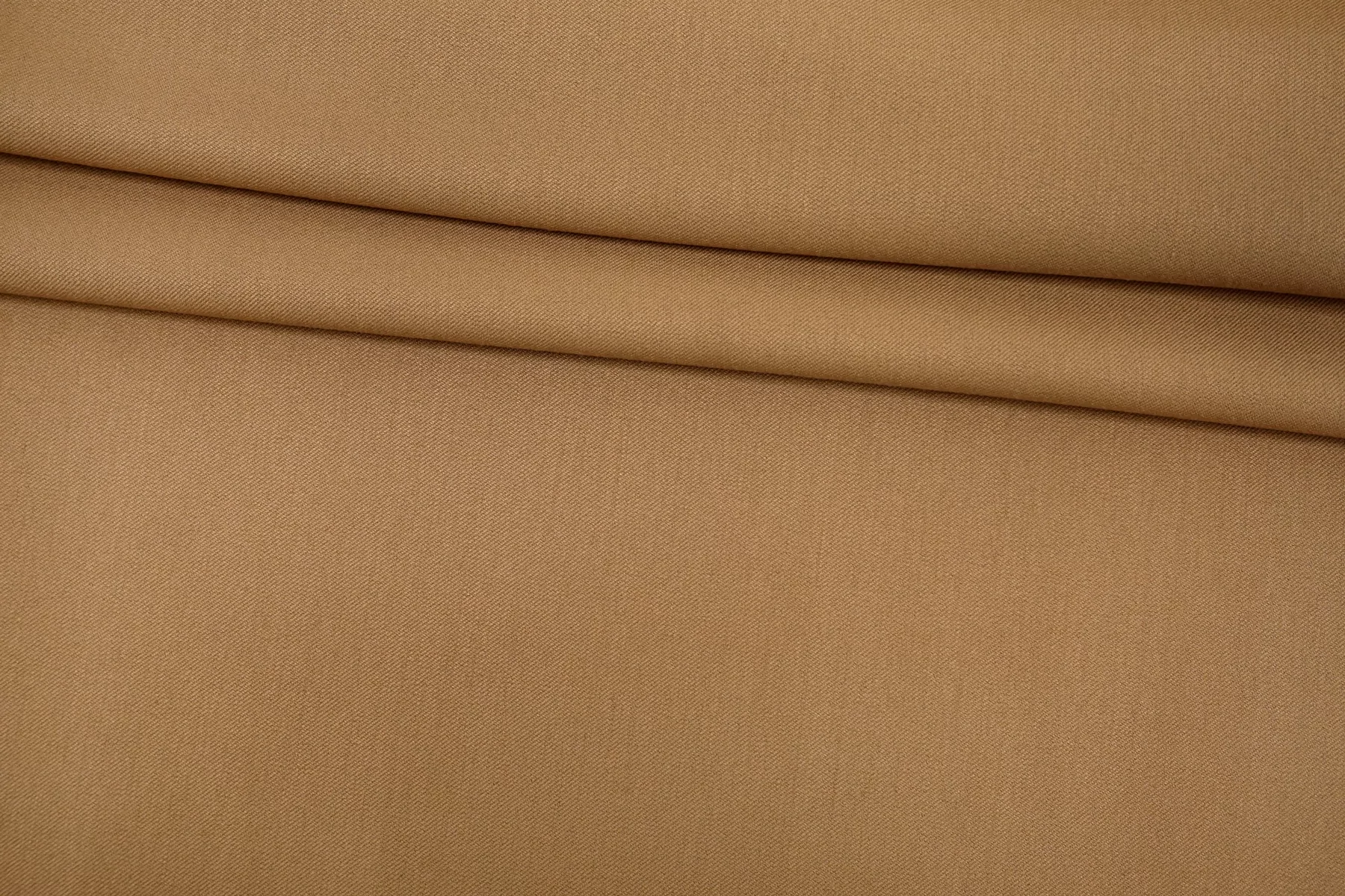 Костюмно-плательная поливискоза от бренда Max Mara в песочном оттенке кэмел (подтон тёплый), диагонального плетения. Пластичная, мягкая и приятная тактильно. Не мнется. Не просвечивает. Тянется по всем направлениям. Поливискоза отличается хорошей износостойкостью и прочностью. Уход деликатный. Шьем платья, брюки, юбки, костюмы мягкой формы.