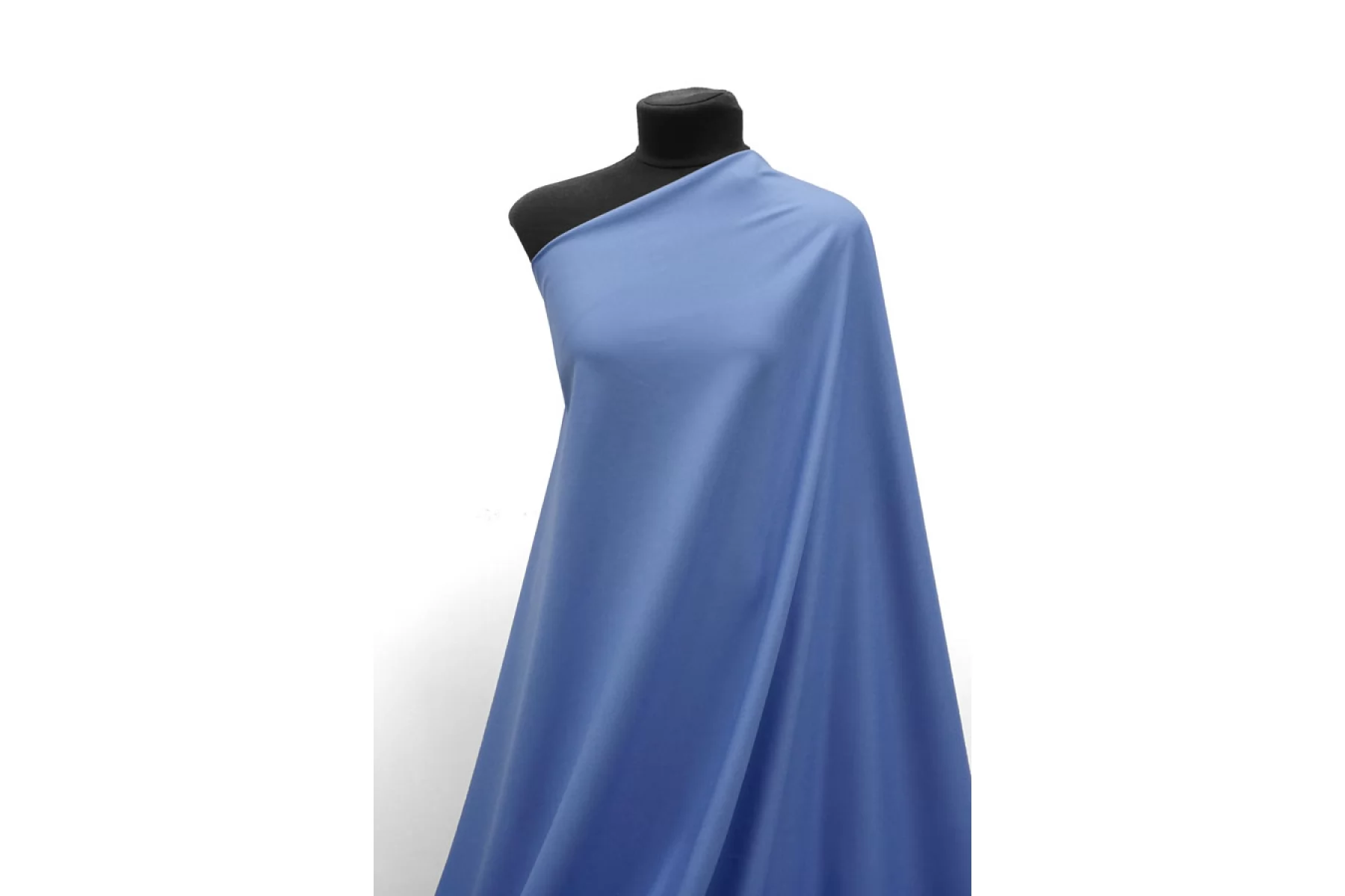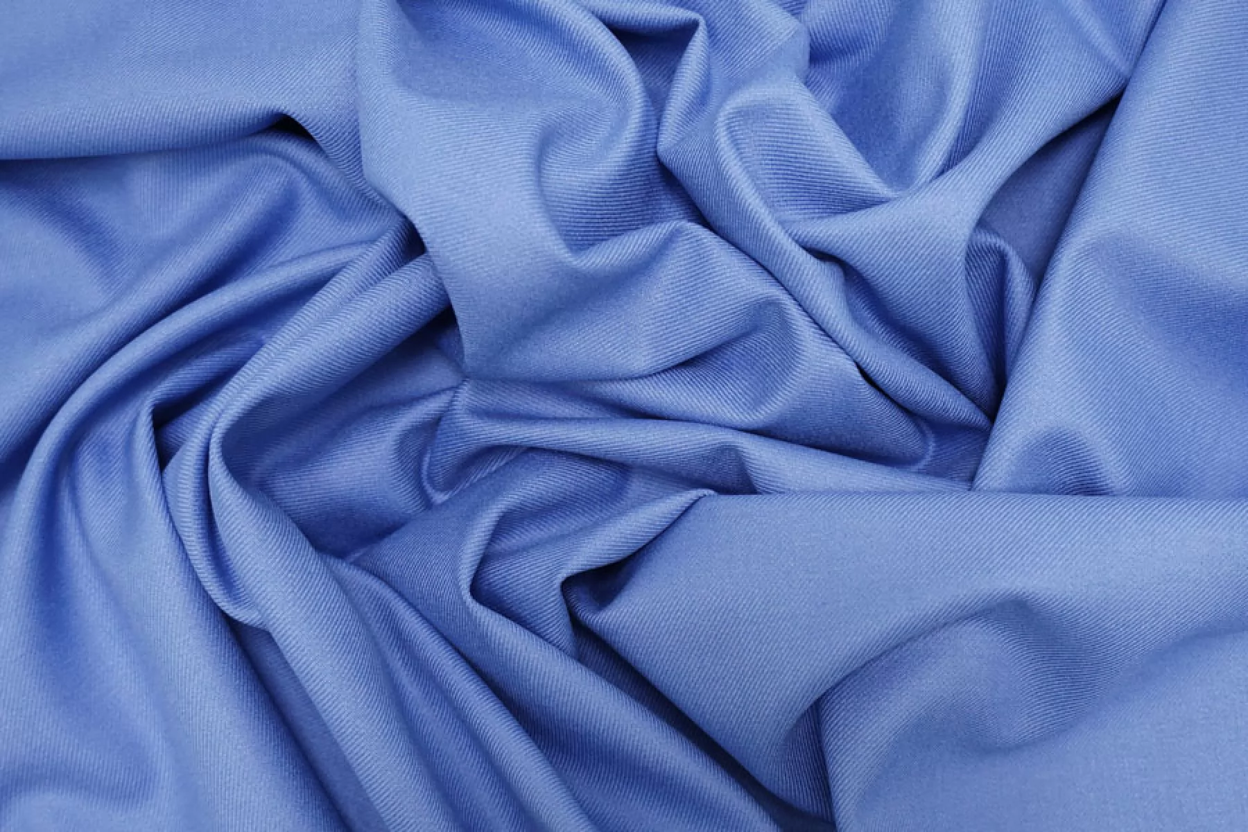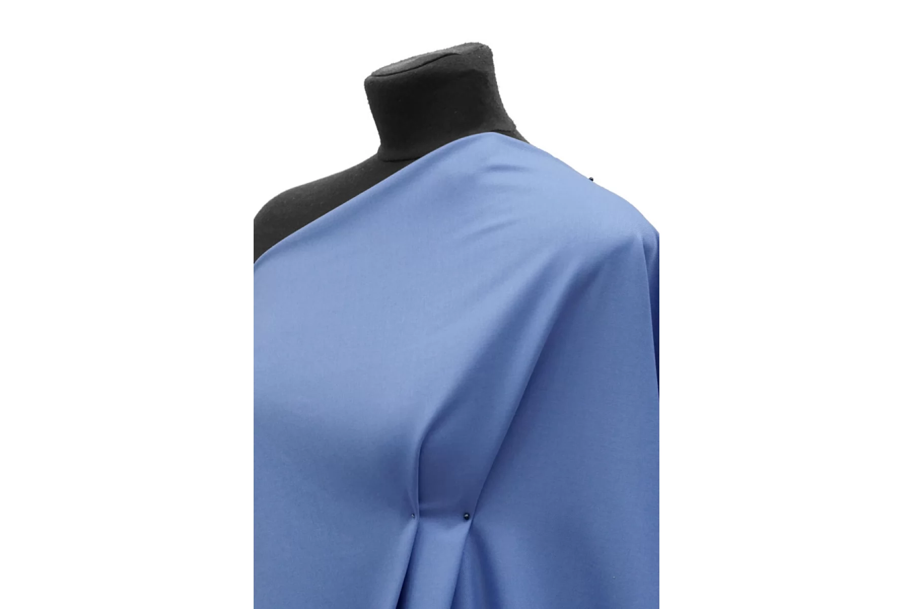 Костюмно-плательная поливискоза от бренда Max Mara в немного приглушённом голубом цвете, диагонального плетения. Пластичная, мягкая и приятная тактильно. Не мнется. Не просвечивает. Хорошо пружинит за счет эластана. Поливискоза отличается хорошей износостойкостью и прочностью. Уход деликатный. Шьем платья, костюмные варианты, брюки, мягкие жакеты и не только.