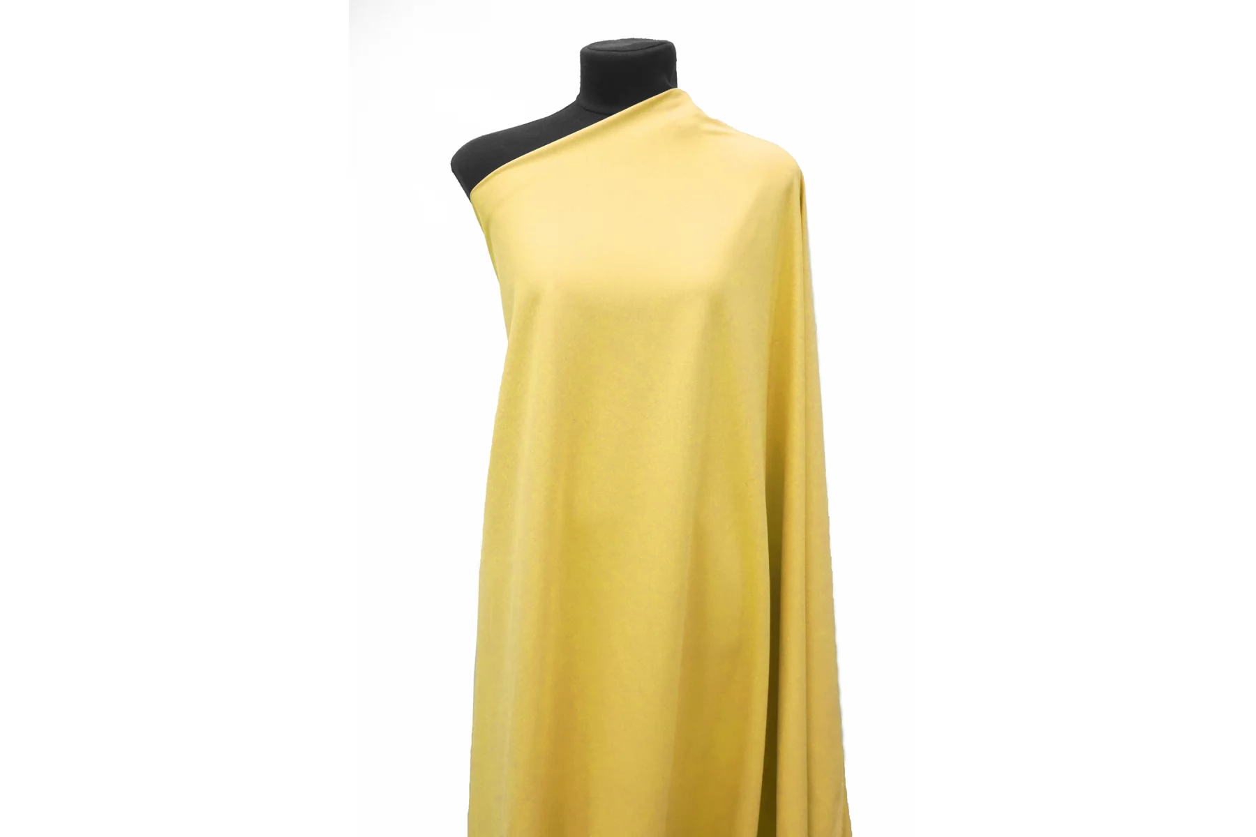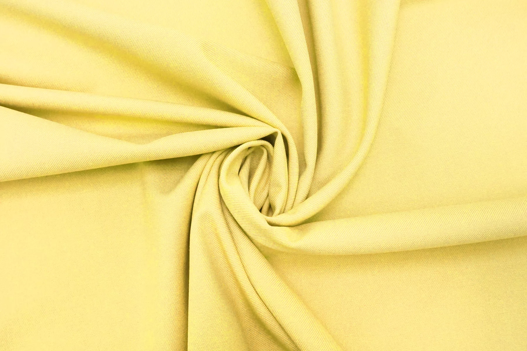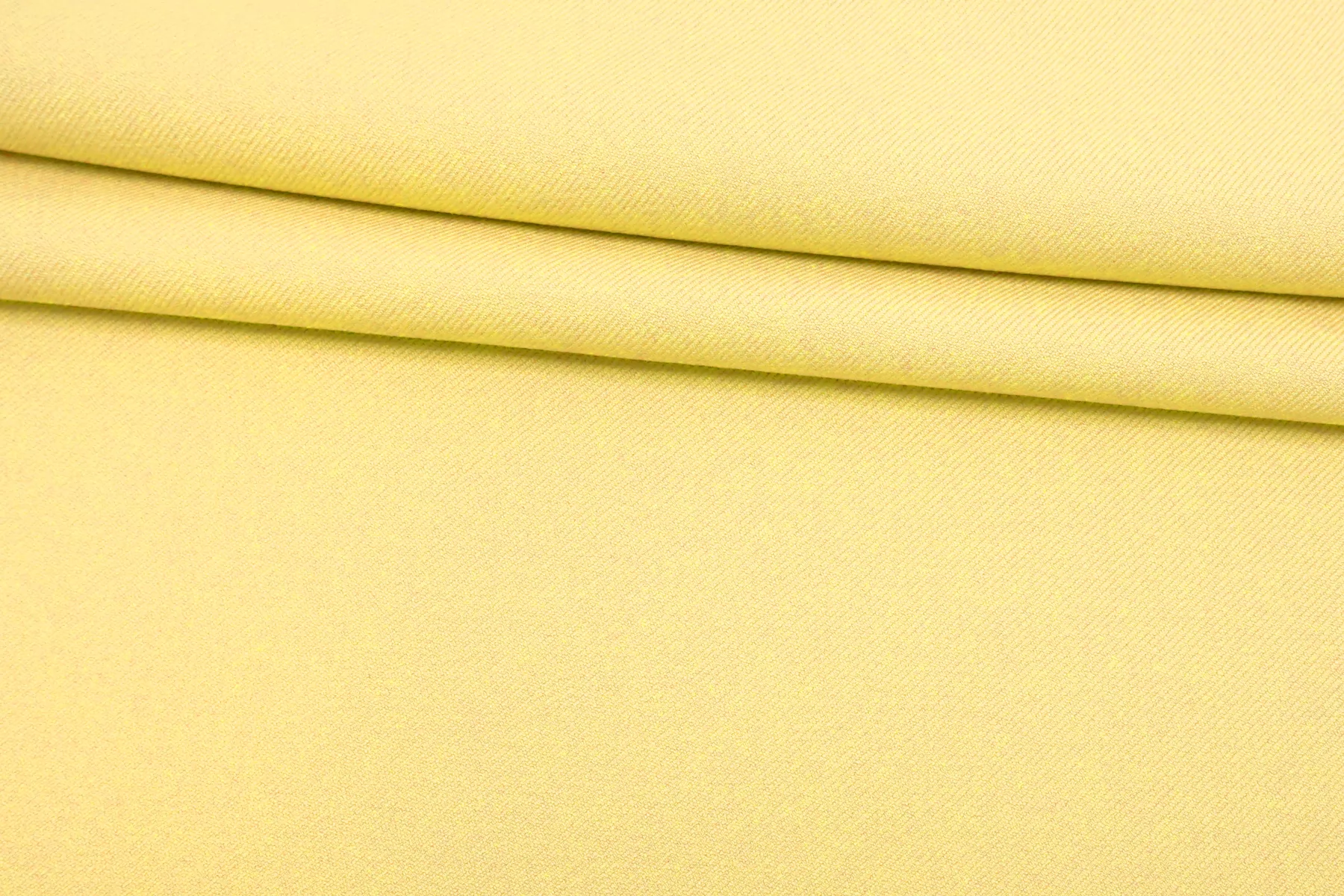 Костюмно-плательная поливискоза от бренда Max Mara в слегка высветленном жёлтом цвете, диагонального плетения. Пластичная, мягкая и приятная тактильно. Не мнется. Не просвечивает. Хорошо пружинит за счет эластана. Поливискоза отличается хорошей износостойкостью и прочностью. Уход деликатный. Шьем платья, костюмные варианты, брюки, мягкие жакеты и не только.