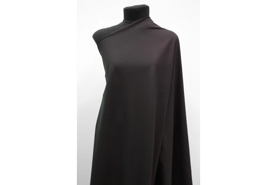 Костюмно-плательная поливискоза от бренда Max Mara в тёмно-коричневом цвете, диагонального плетения. Пластичная, мягкая и приятная тактильно. Не мнется. Не просвечивает. Хорошо пружинит за счет эластана. Поливискоза отличается хорошей износостойкостью и прочностью. Уход деликатный. Шьем платья, брюки, шорты, юбки, костюмы мягкой формы.