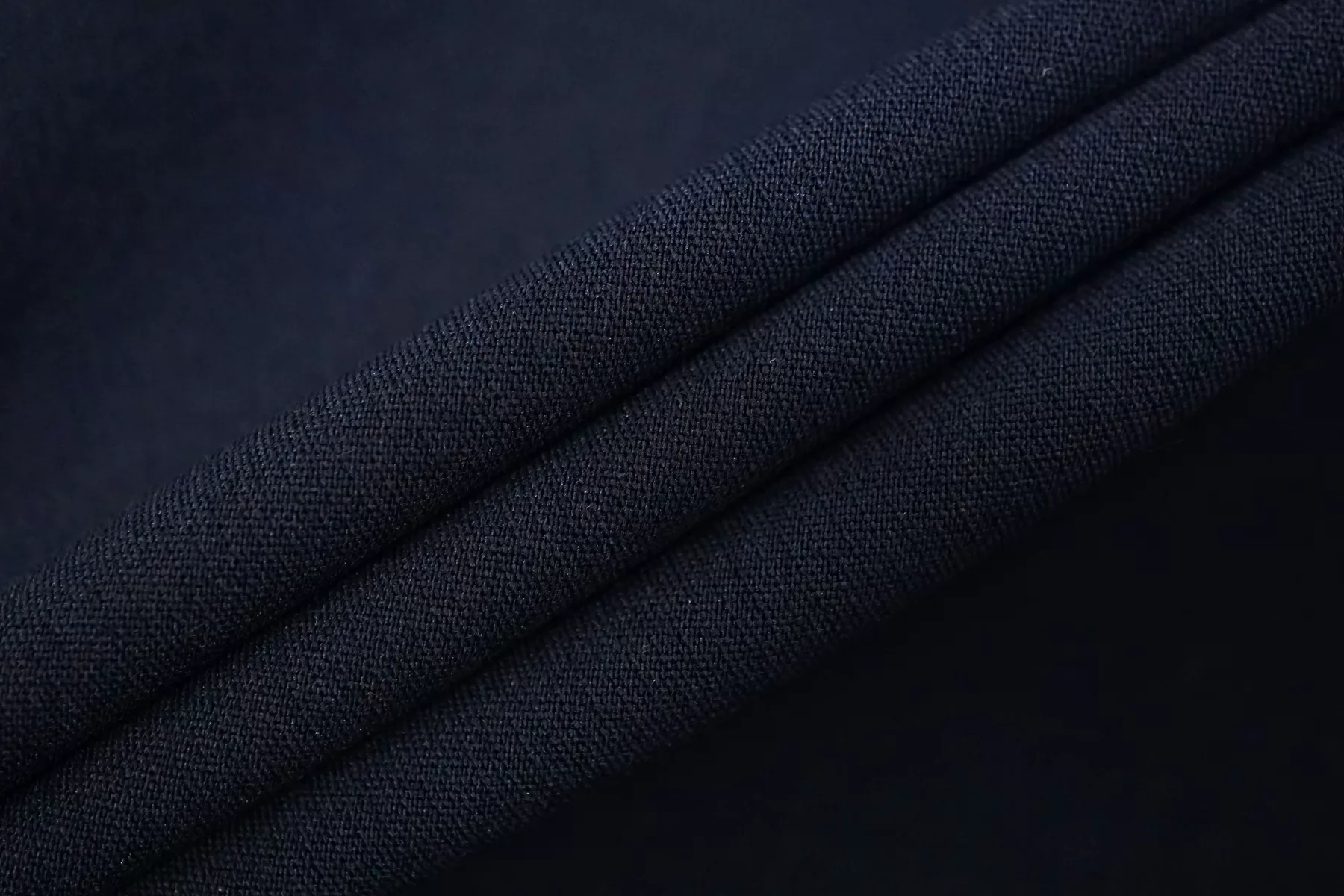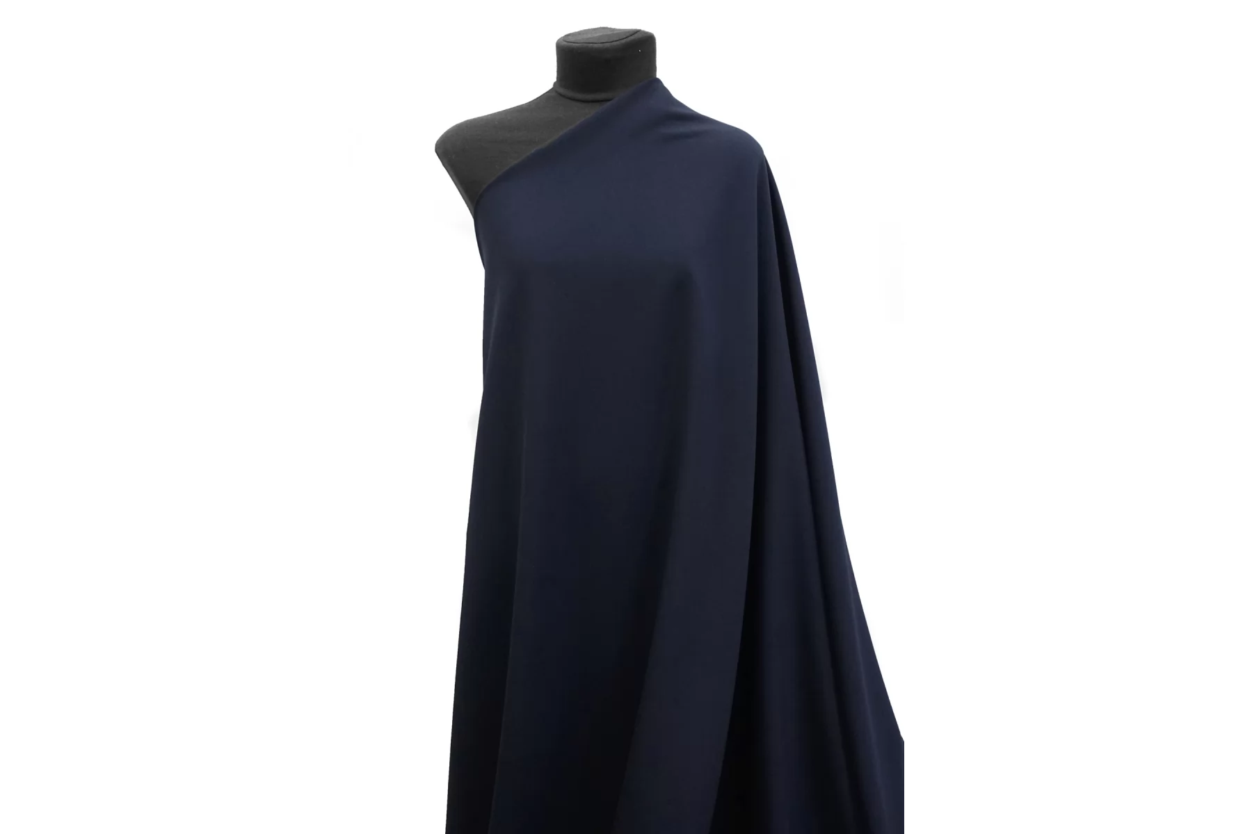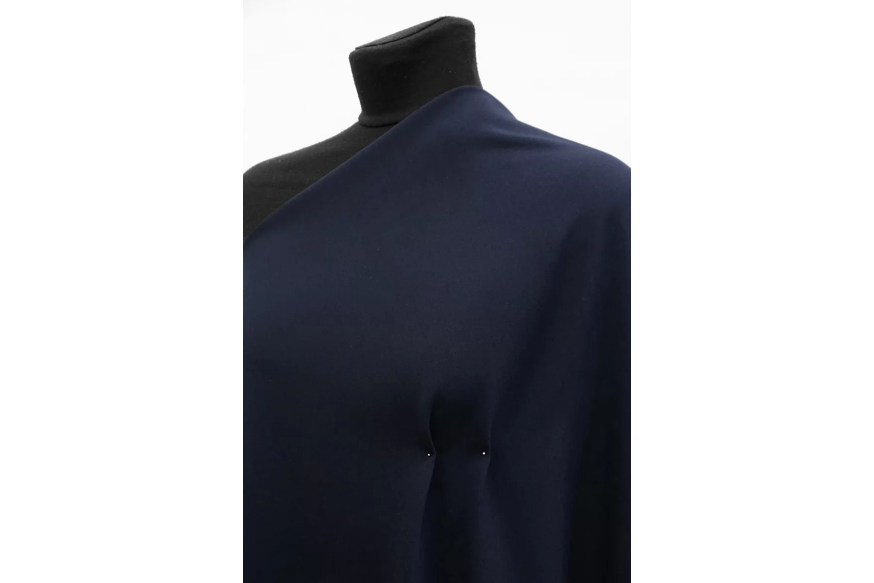 Костюмно-плательная поливискоза от бренда Max Mara в тёмно-синем цвете. Пластичная, мягкая и приятная тактильно. Не мнется. Не просвечивает. Тянется по утку и диагонали, немного растягивается по основе. Поливискоза отличается хорошей износостойкостью и прочностью. Уход деликатный. Шьем платья, брюки, юбки, костюмы мягкой формы.