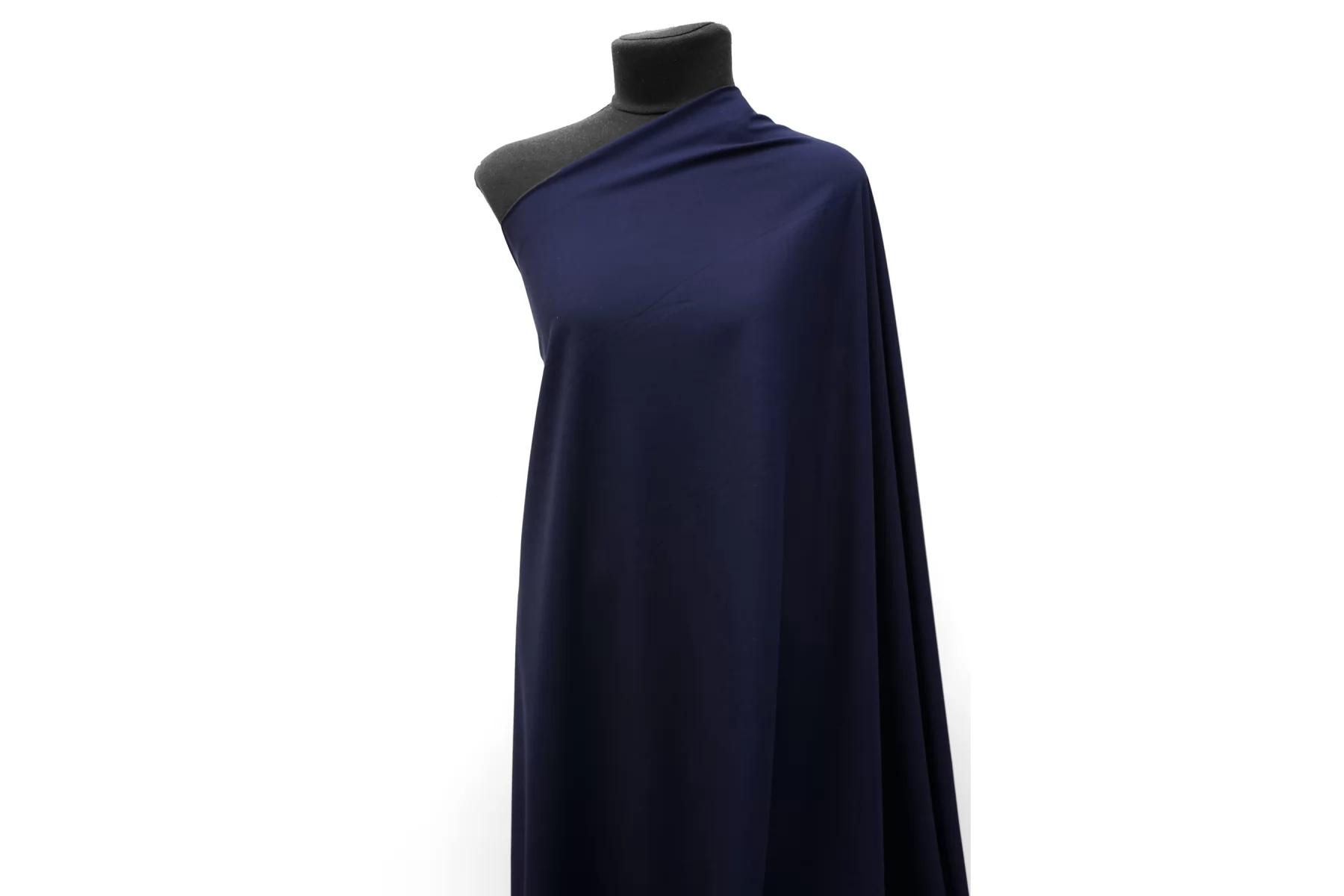 Костюмно-плательная поливискоза от бренда Max Mara в очень тёмном синем цвете. Пластичная, мягкая и приятная тактильно. Не мнется. Не просвечивает. Хорошо пружинит за счет эластана. Поливискоза отличается хорошей износостойкостью и прочностью. Уход деликатный. Шьем платья, костюмные варианты, брюки, мягкие жакеты и не только.