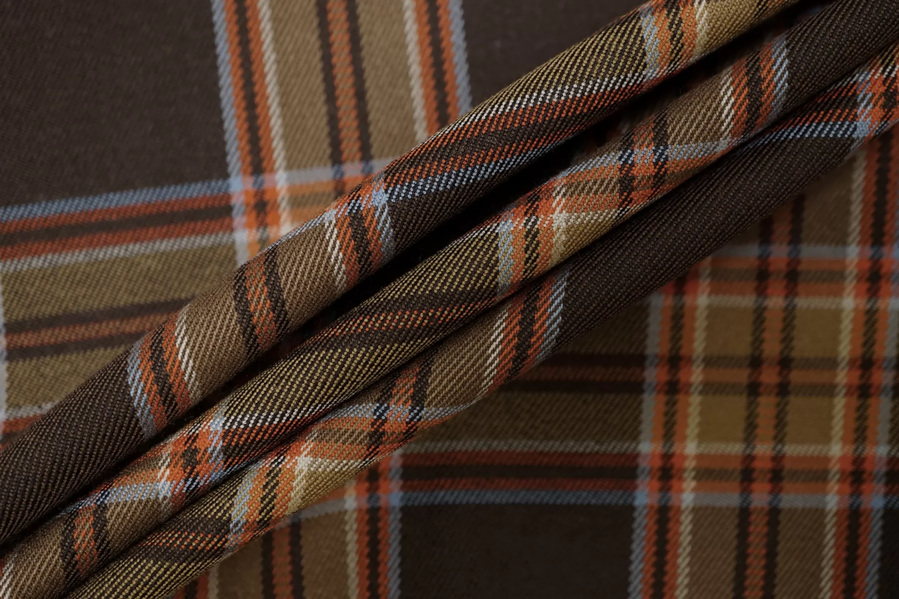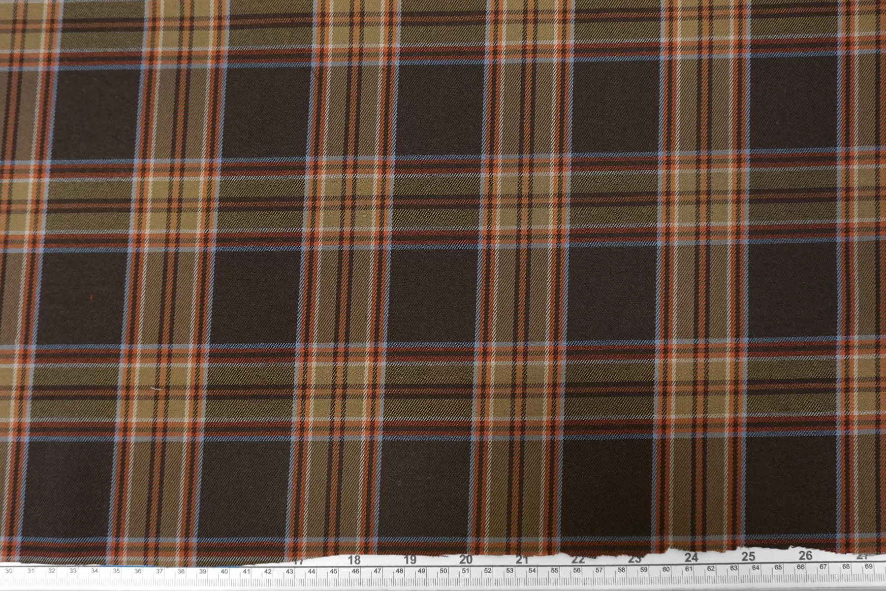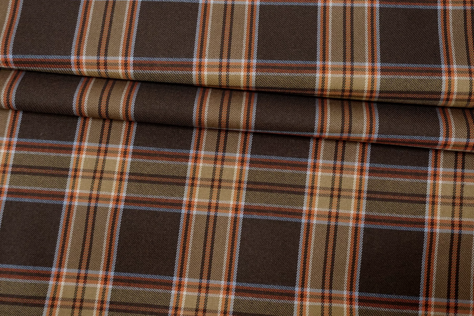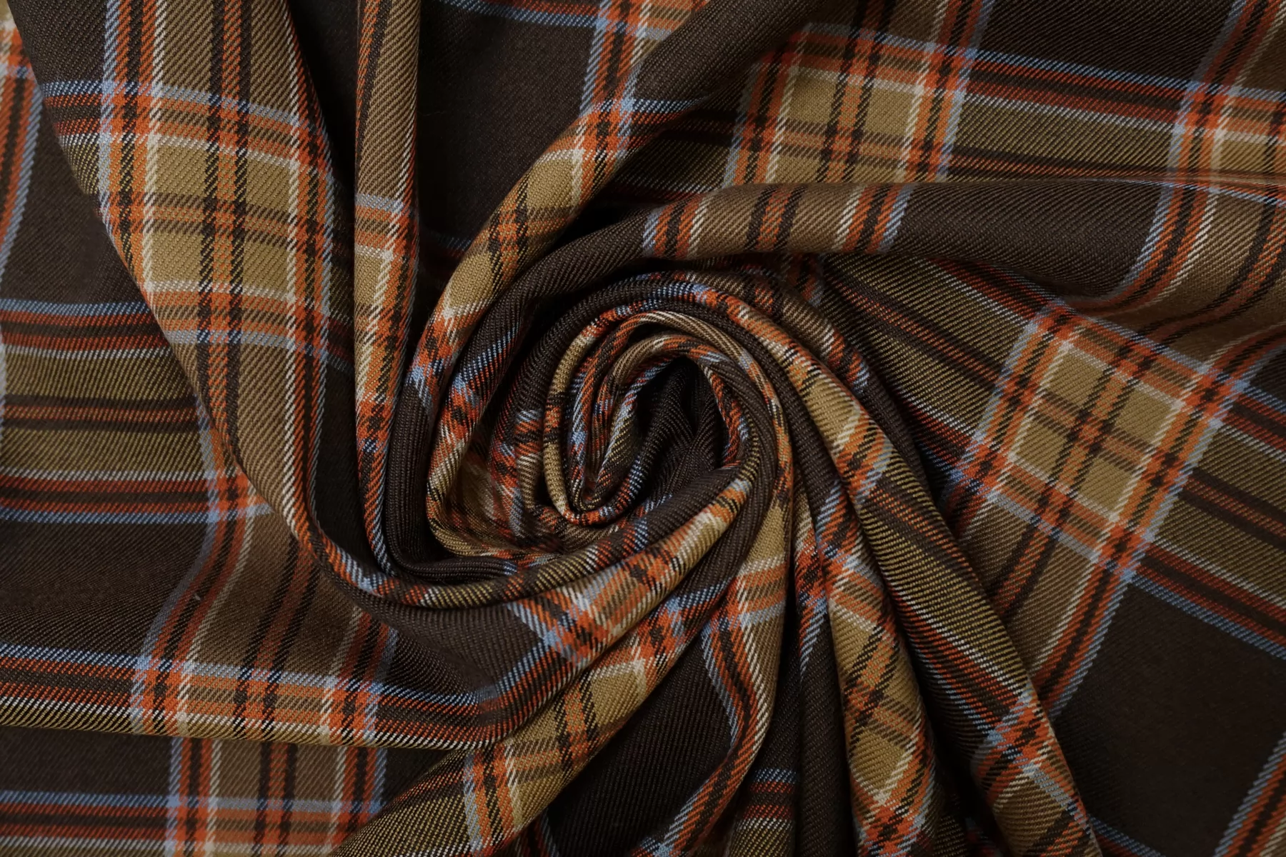 Отличная костюмно-плательная вискоза в клетку, диагонального переплетения, нити коричневого, голубого, оранжевого, чёрного цвета. Тактильно приятная, мягкая. Обладает легким лоском. Не просвечивает. Тянется за счет содержания эластана. Практически не мнется. Хорошо драпируется и немного держит форму. Красива в своей пластике. Вариант для пошива костюма, платья, юбки, мягкого жакета и не только.