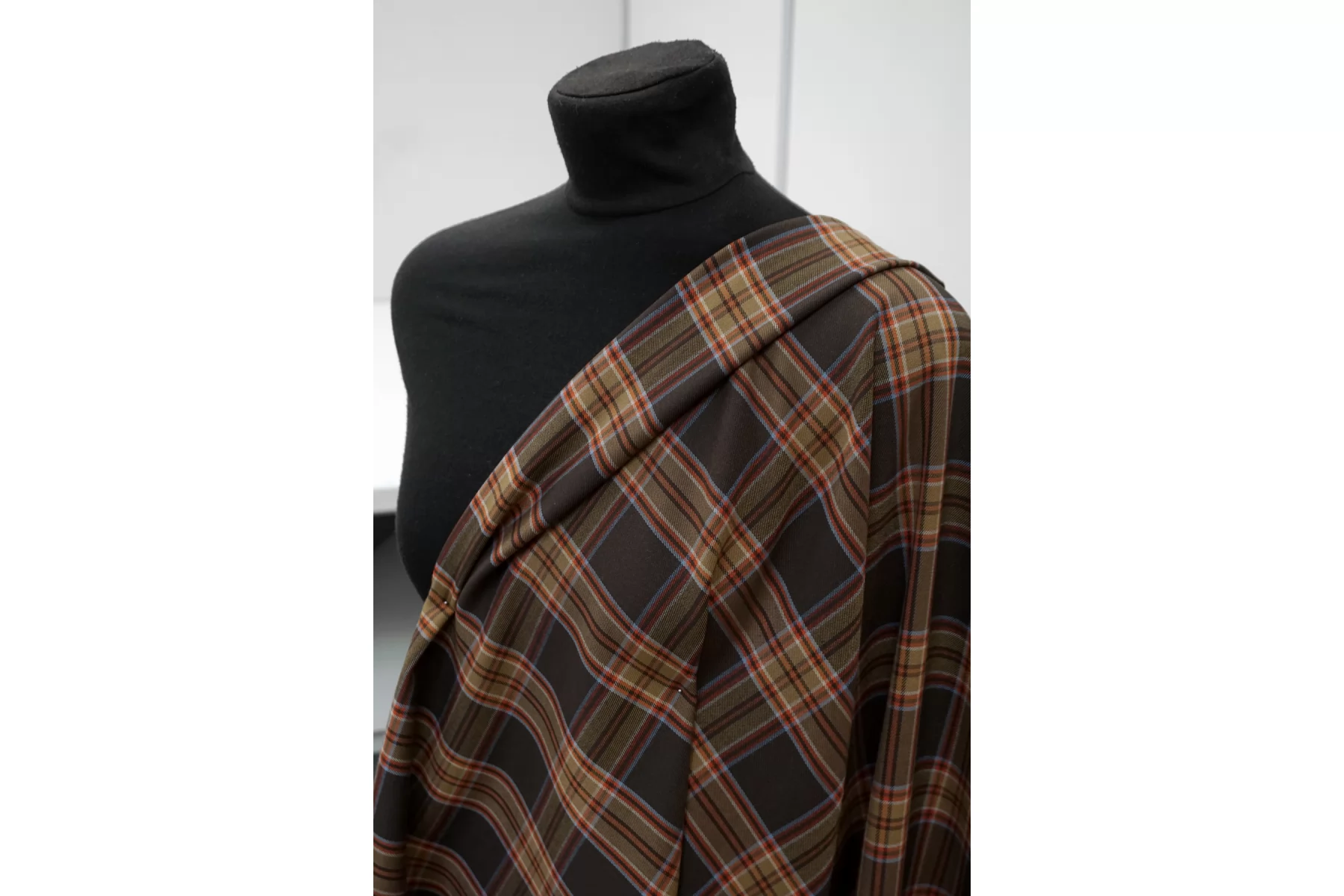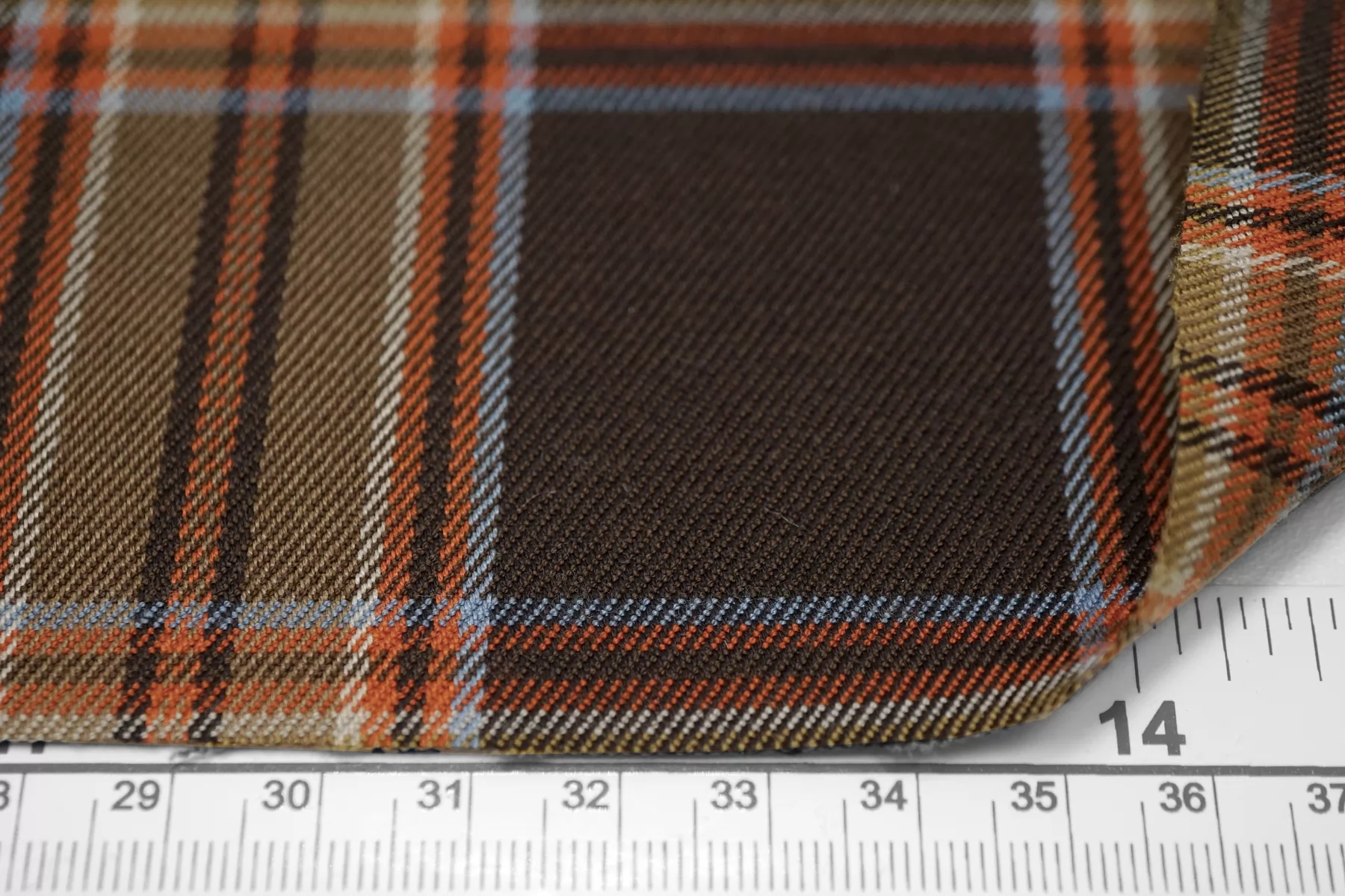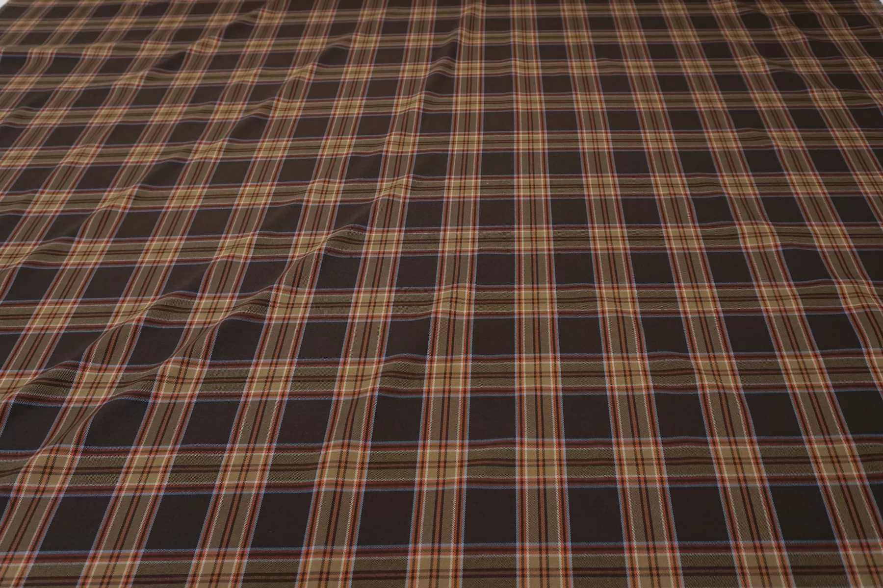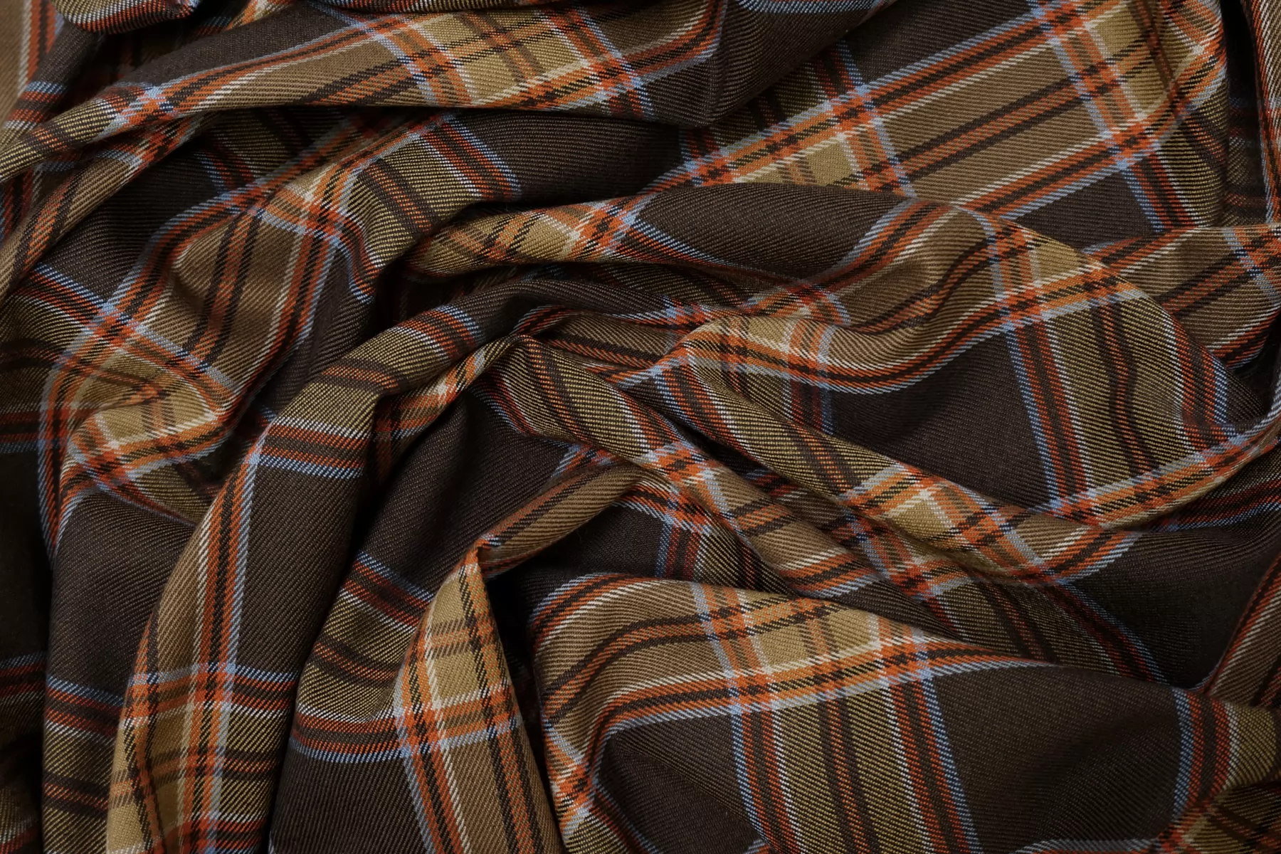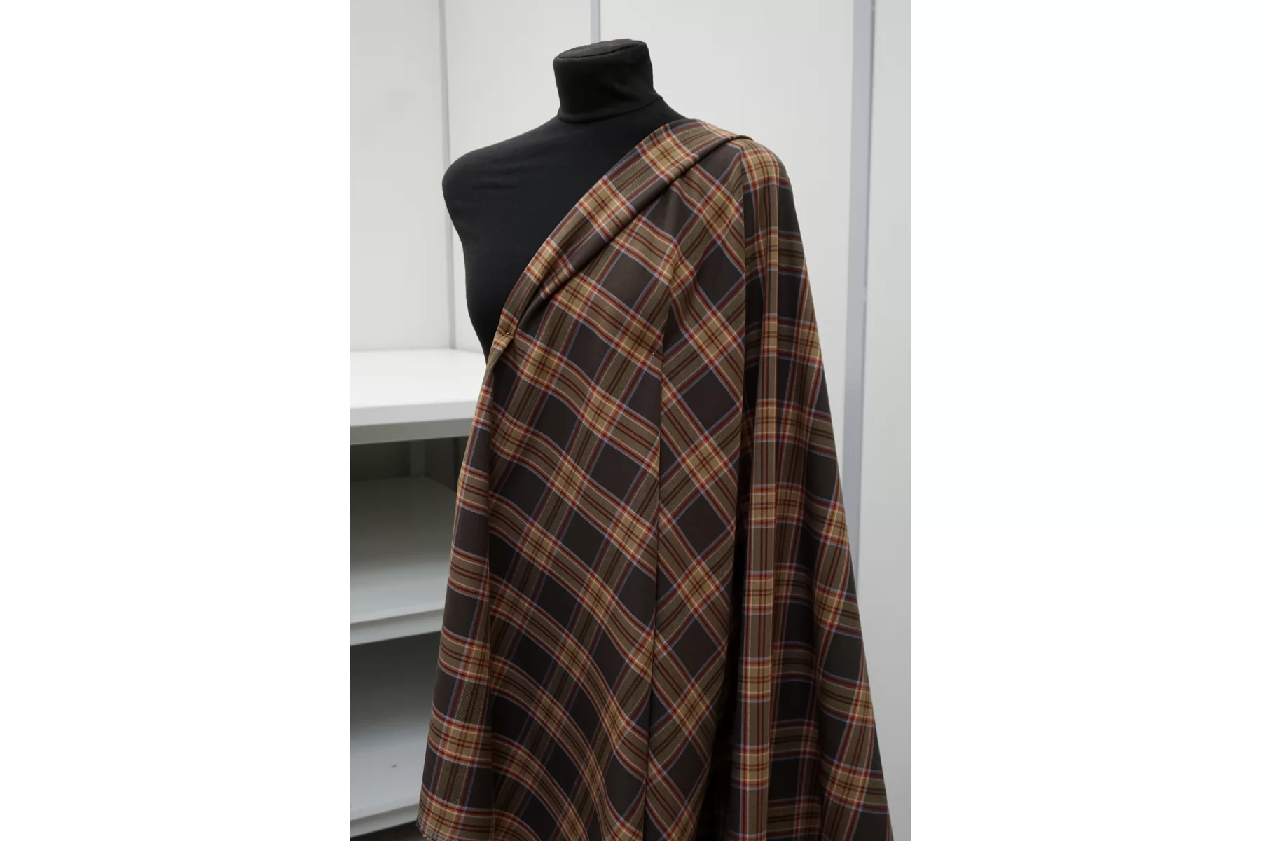 Отличная костюмно-плательная вискоза в клетку, диагонального переплетения, нити коричневого, голубого, оранжевого, чёрного цвета. Тактильно приятная, мягкая. Обладает легким лоском. Не просвечивает. Тянется за счет содержания эластана. Практически не мнется. Хорошо драпируется и немного держит форму. Красива в своей пластике. Вариант для пошива костюма, платья, юбки, мягкого жакета и не только.