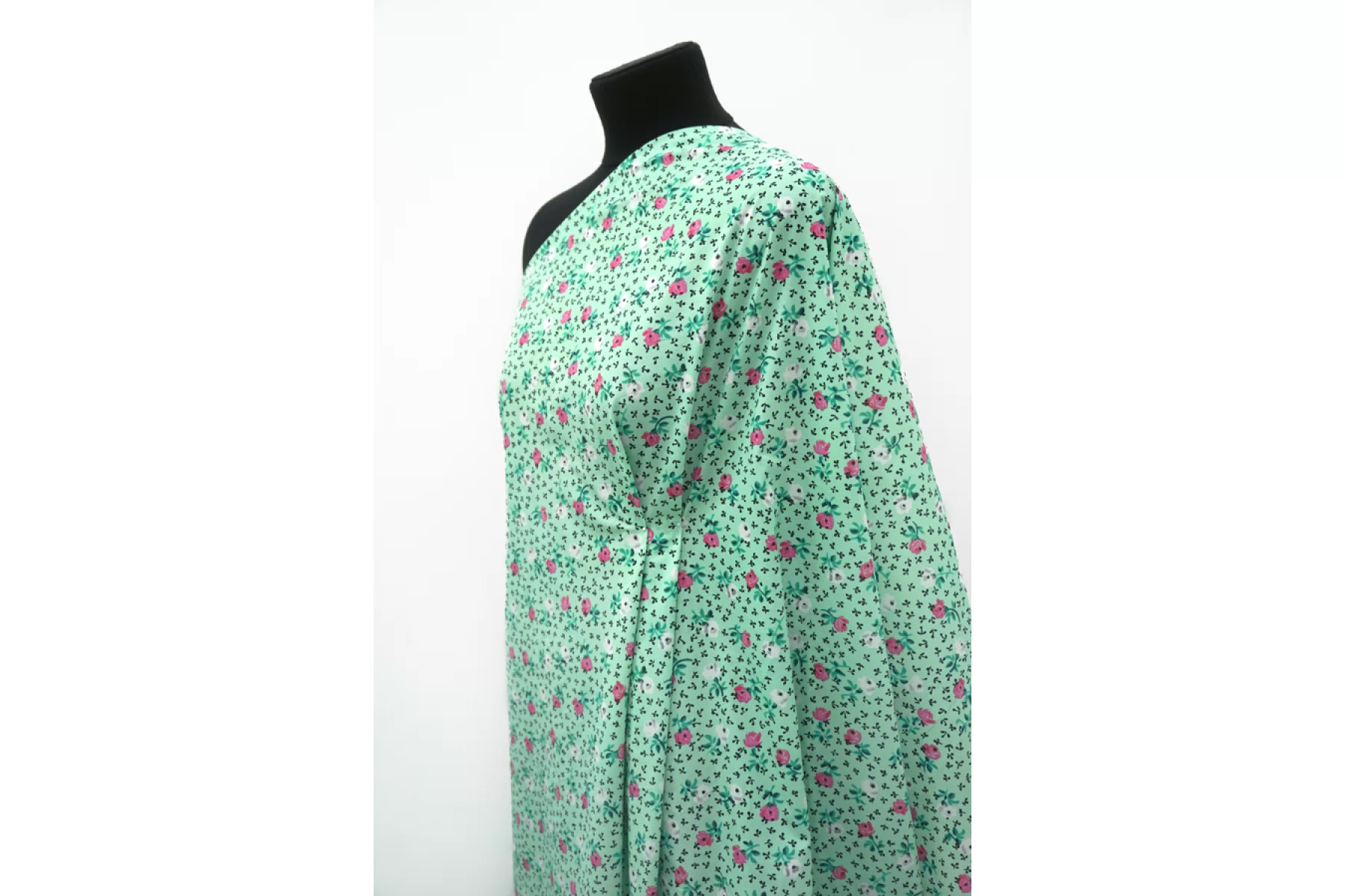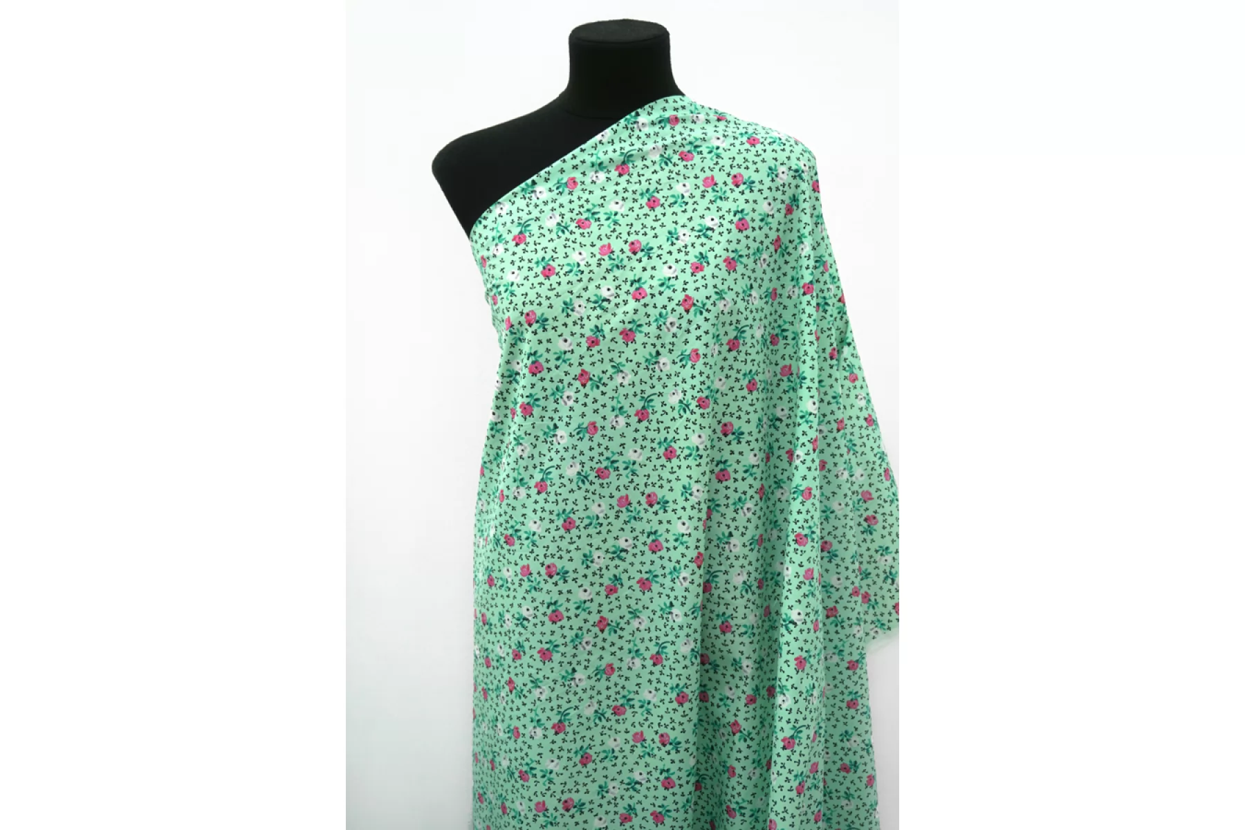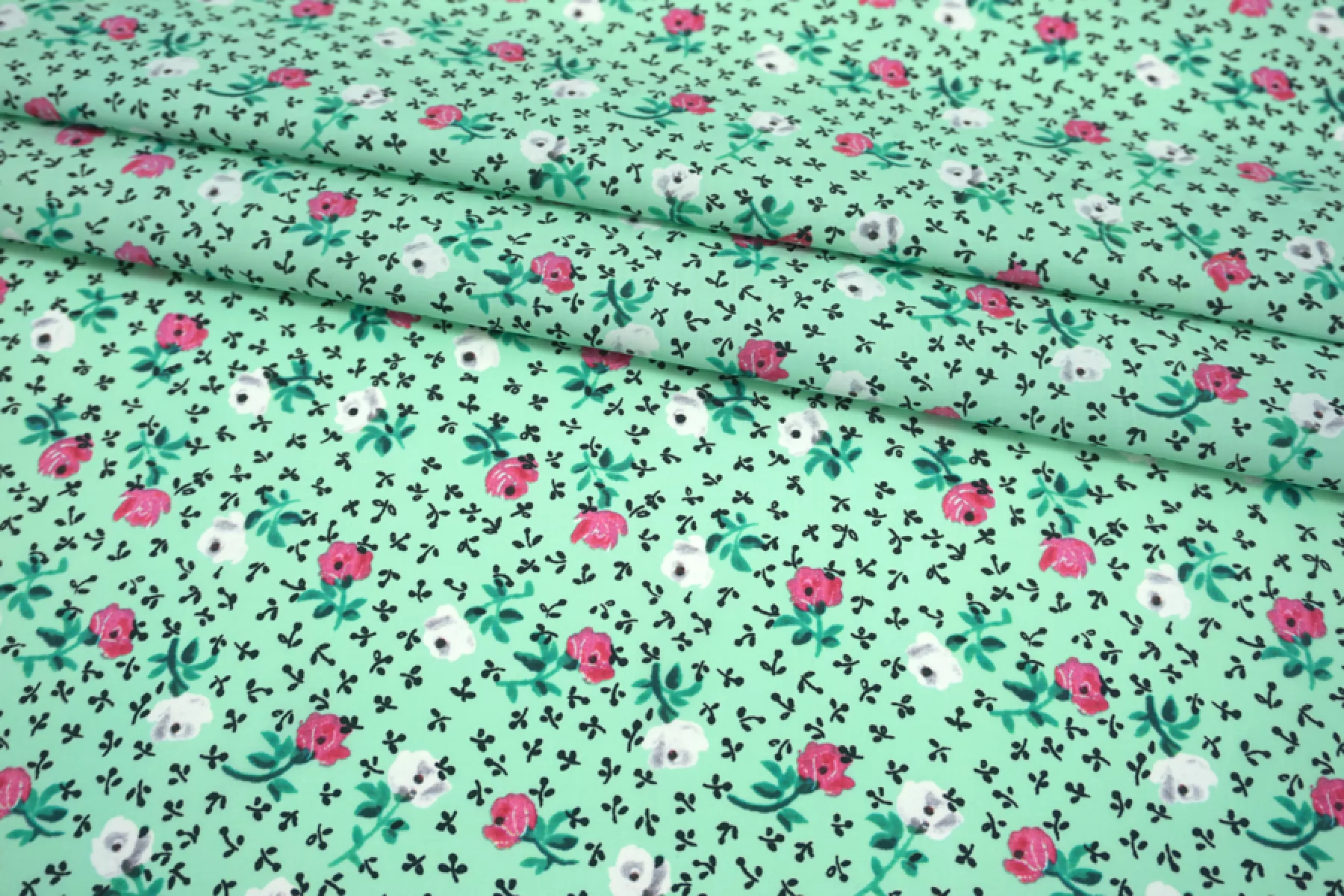 Итальянский мерсеризованный рубашечный поплин. Принт - мелкие розовые и белые цветочки на мятно-бирюзовом фоне. Тонкий, пластичный, приятный тактильно, легкий, не тянется. Подойдет для пошива платья, рубашки, юбки.