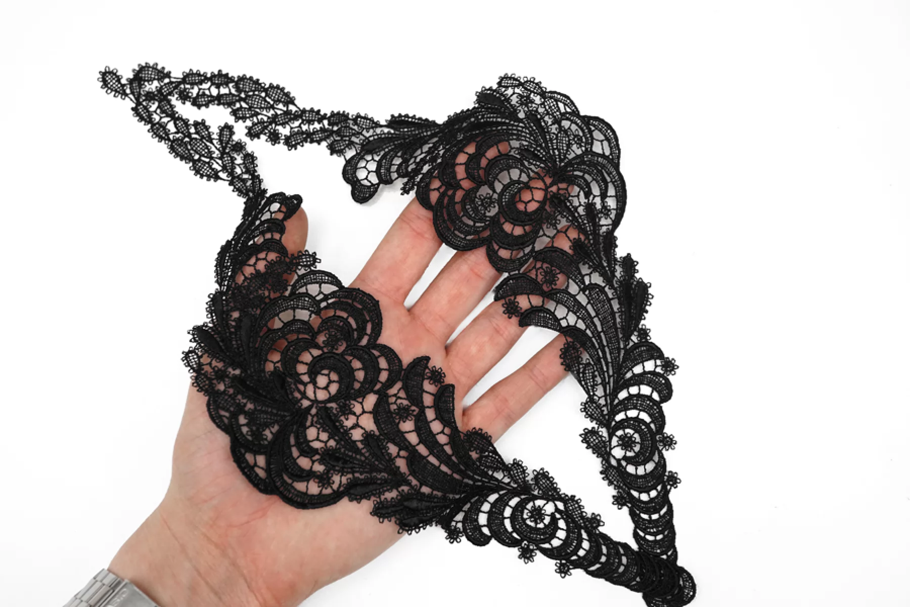 Пришивной кружевной элемент , черного цвета. Отлично подойдет для декорирования или отделки одежды, сумок или аксессуаров.