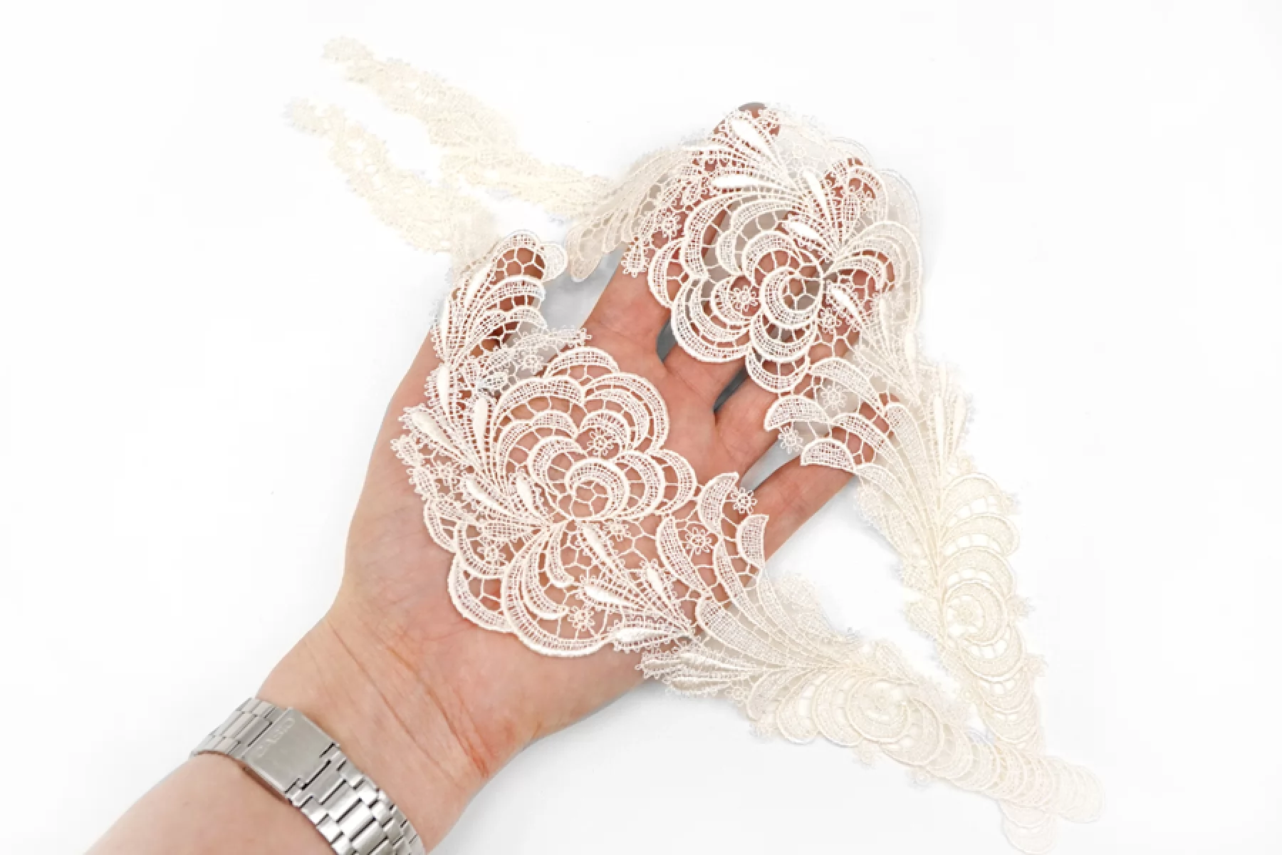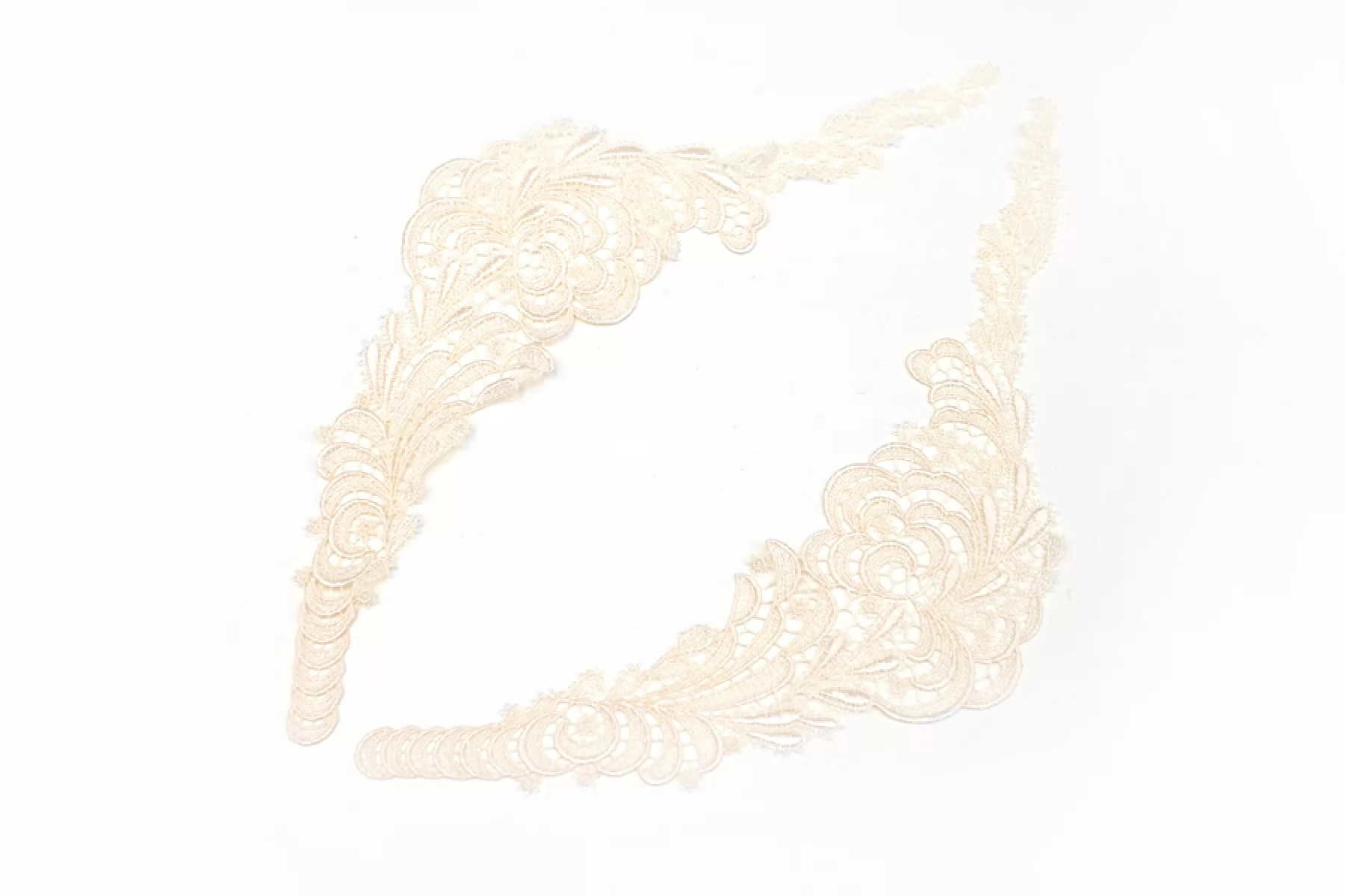 Пришивной кружевной элемент , молочного цвета. Отлично подойдет для декорирования или отделки одежды, сумок или аксессуаров.