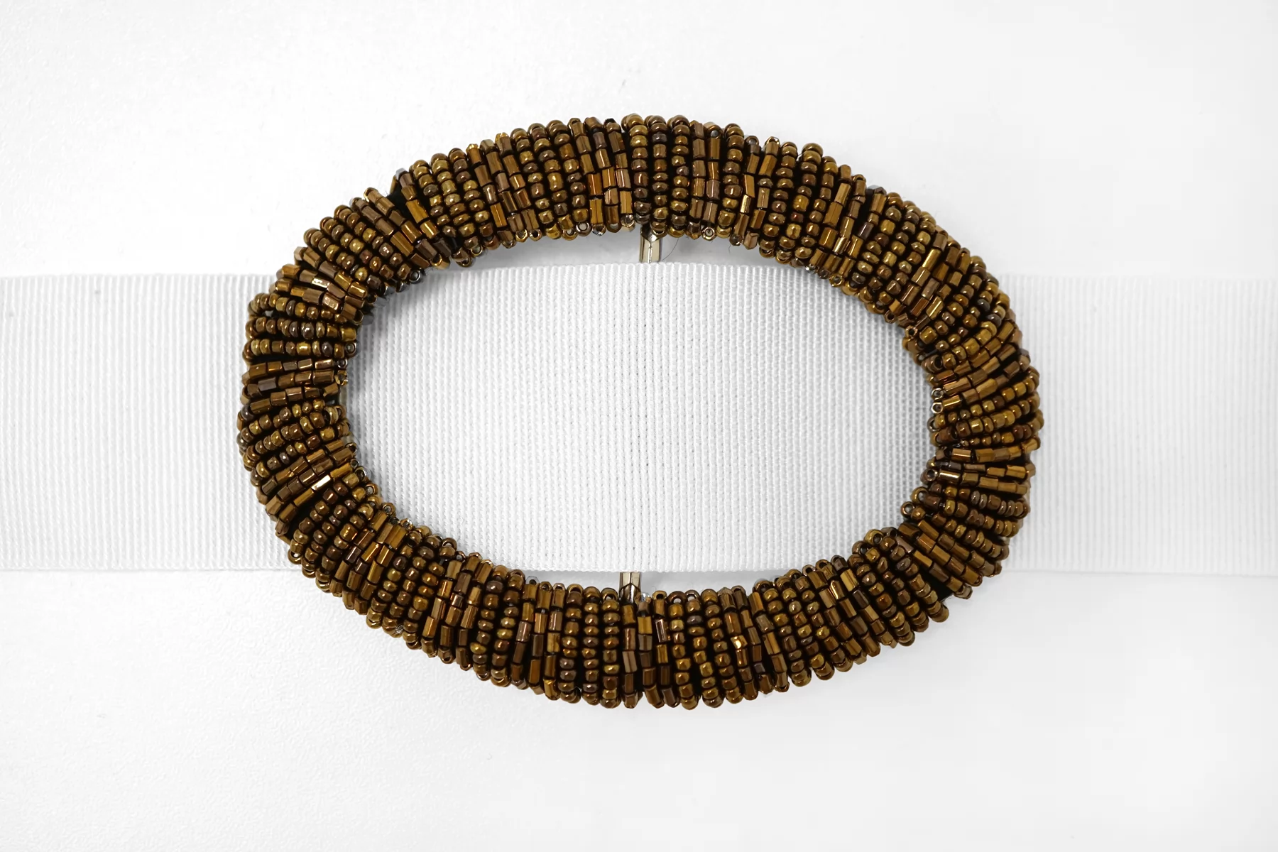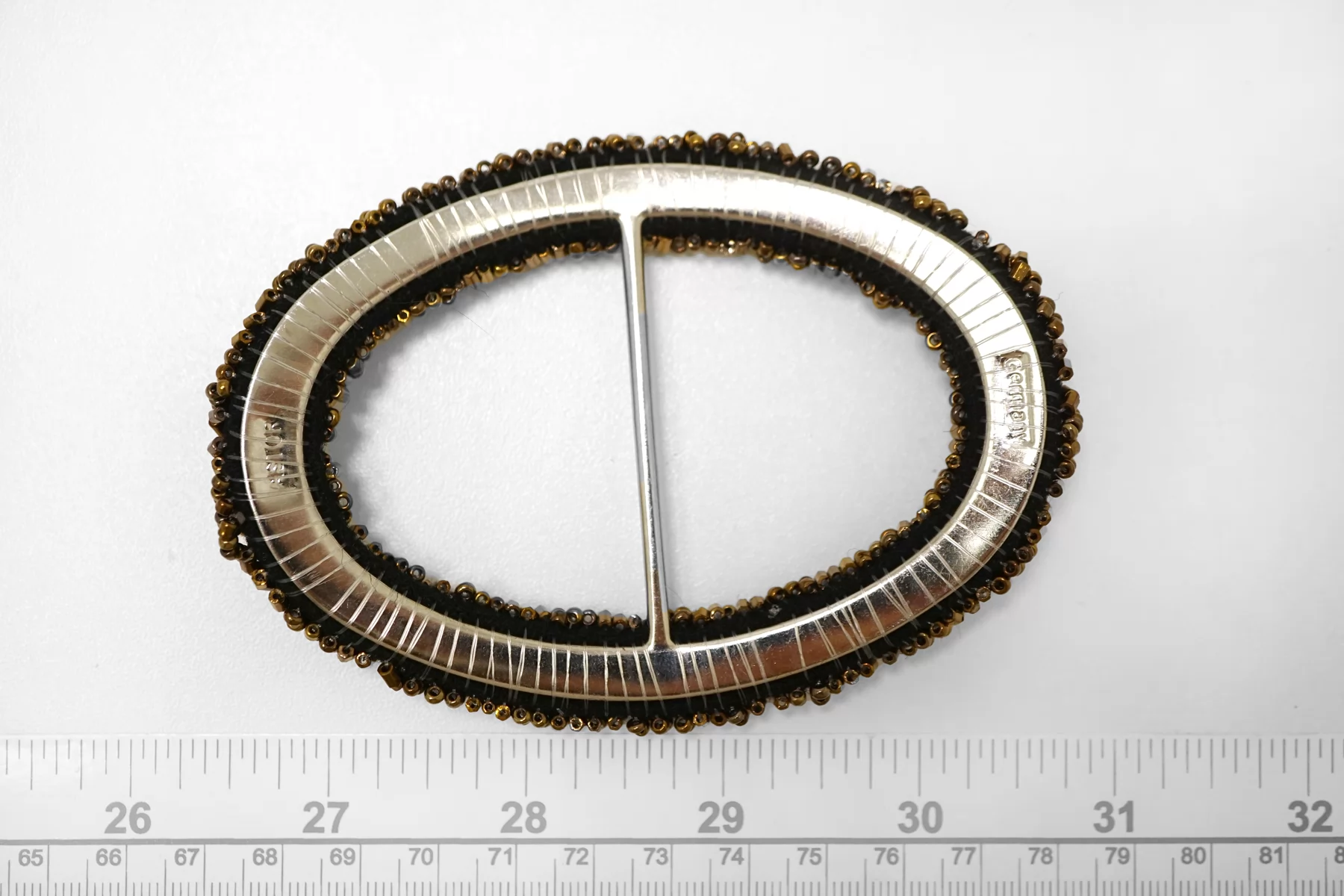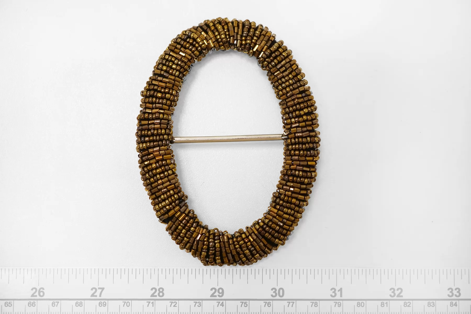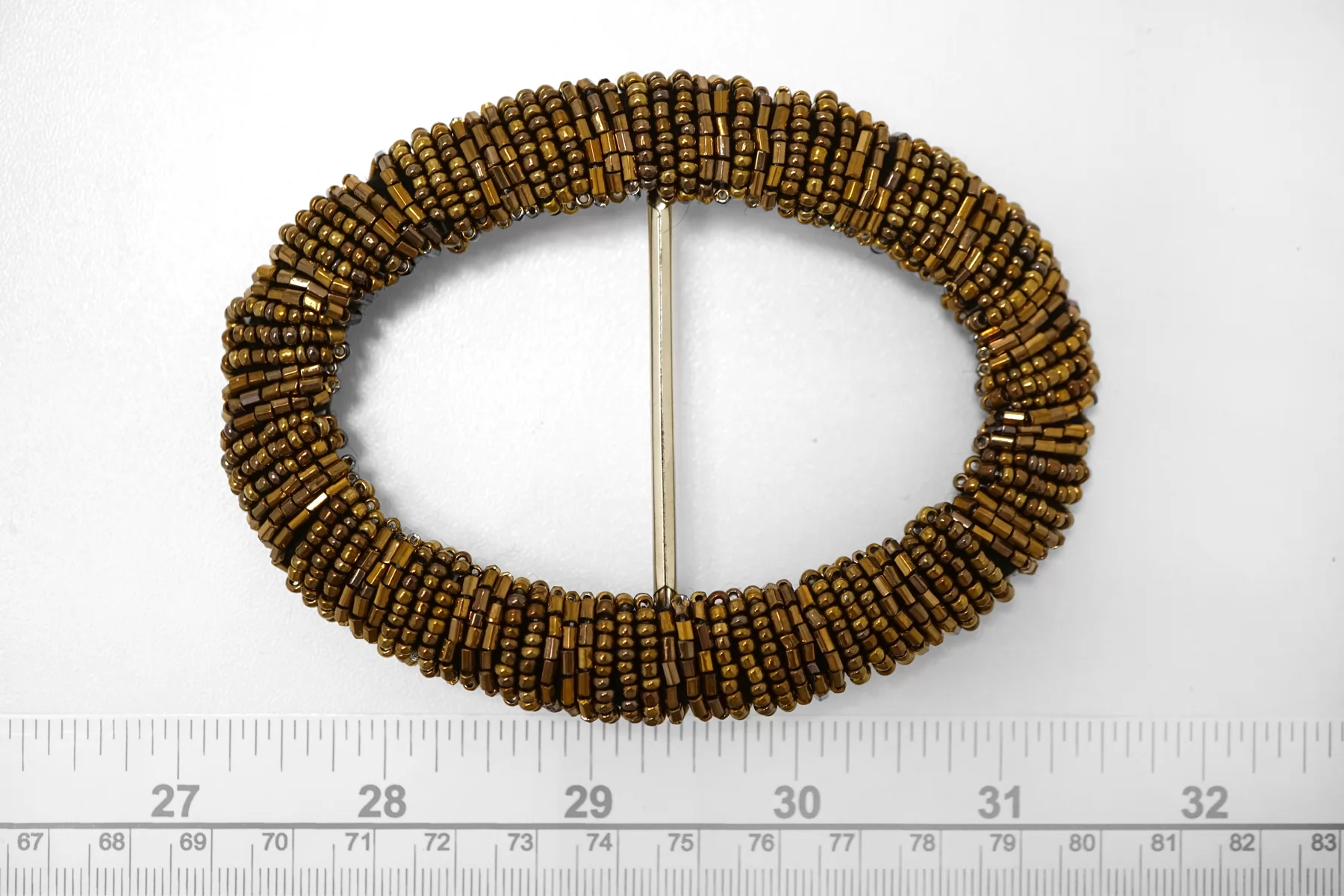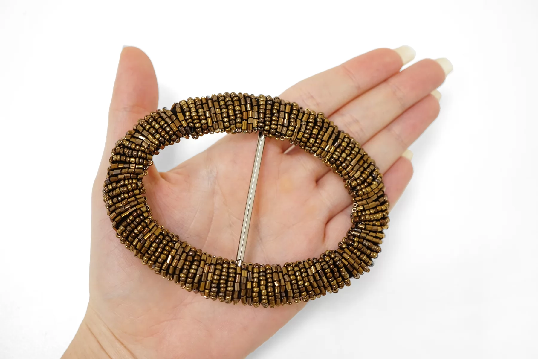 Овальная пряжка из металла расшитая бисером, бронзового цвета . Внутренний размер (для ремешка) - 45мм. Пряжка с металлическим язычком.