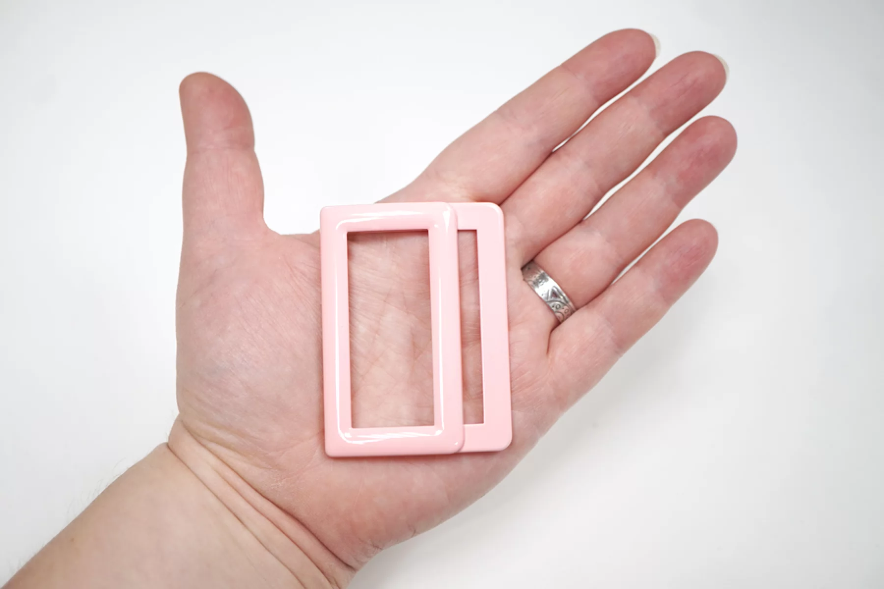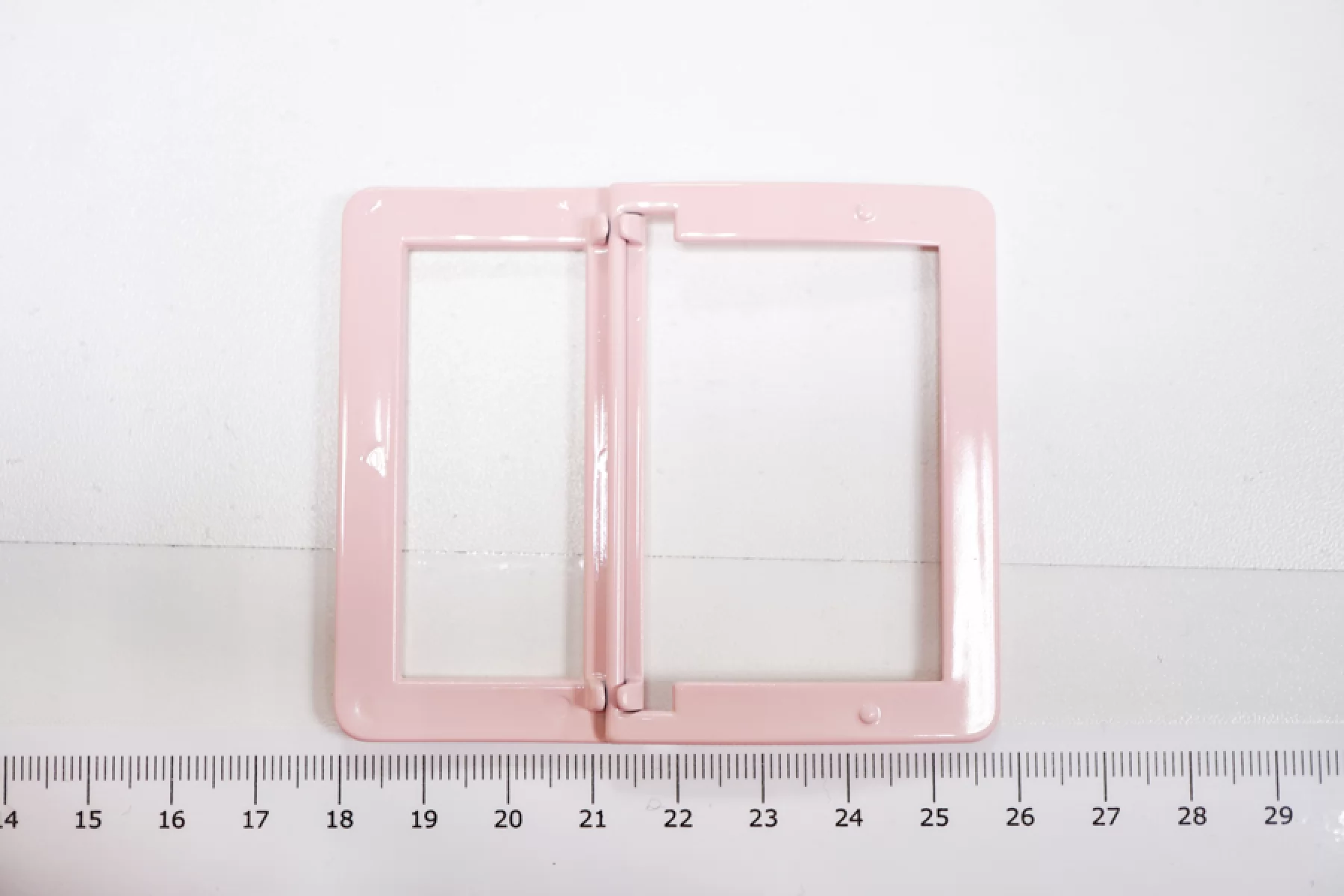 Прямоугольная двойная пряжка из металла розового цвета, размер 65х48 мм. Внутренний размер (для ремешка) - 60х20 мм.