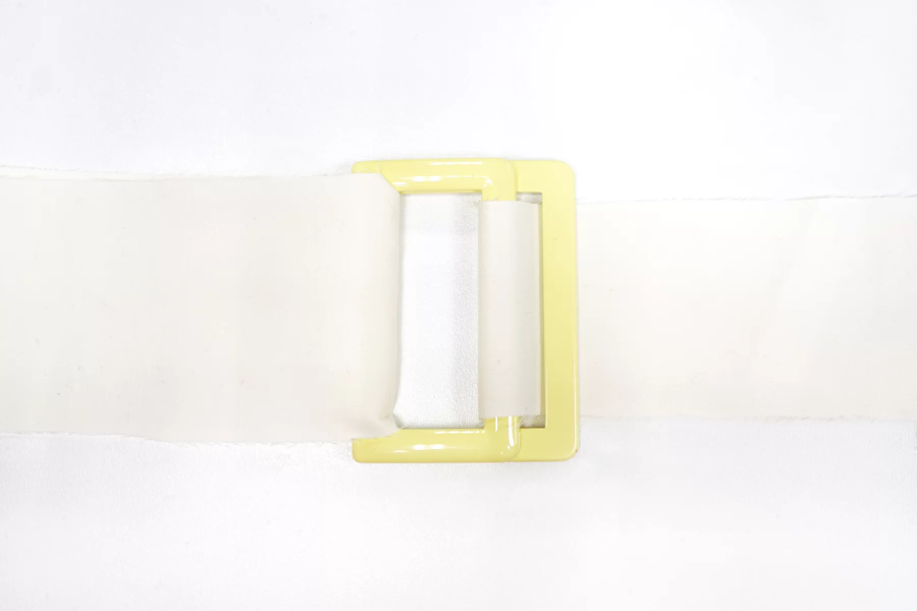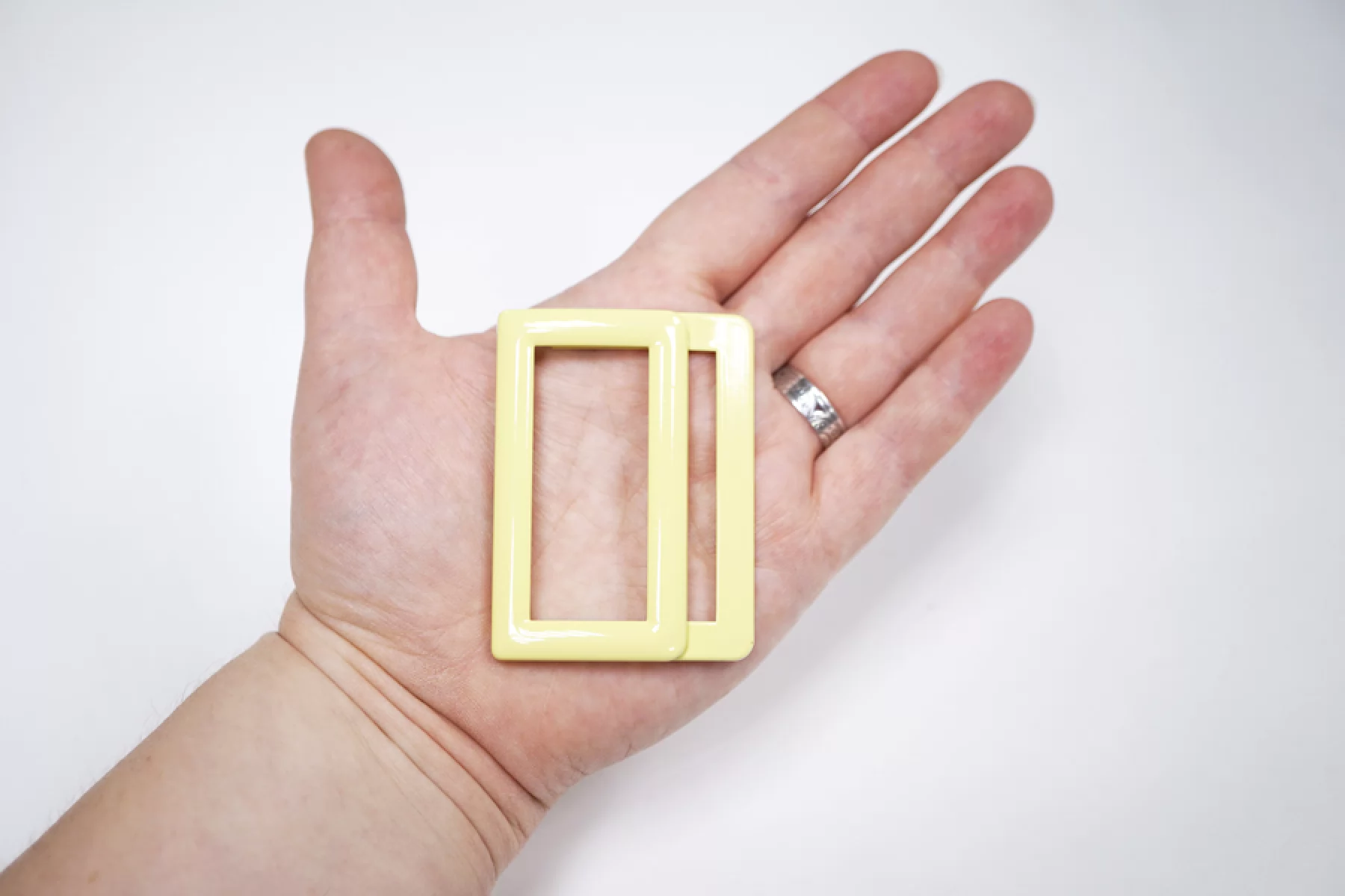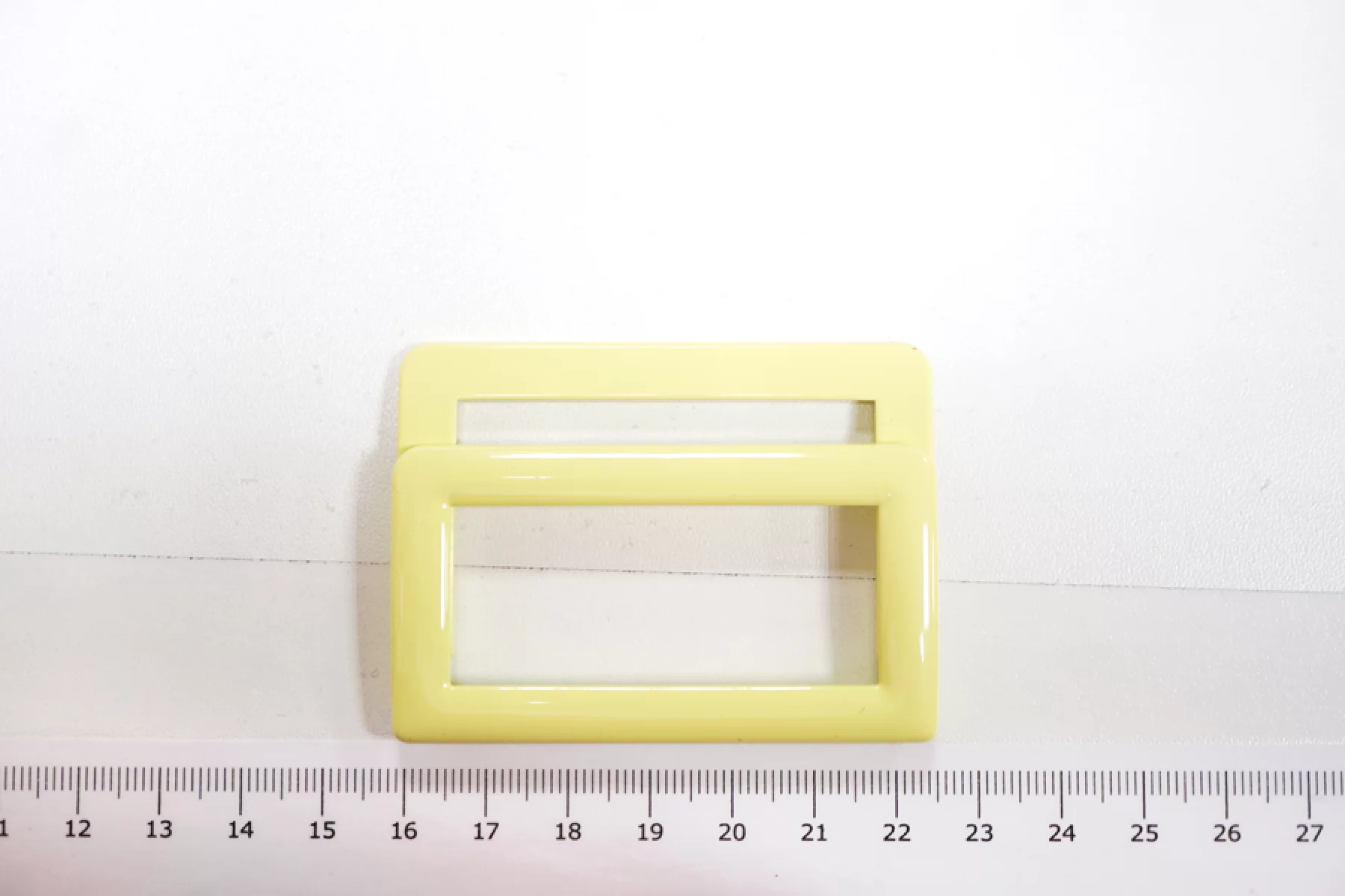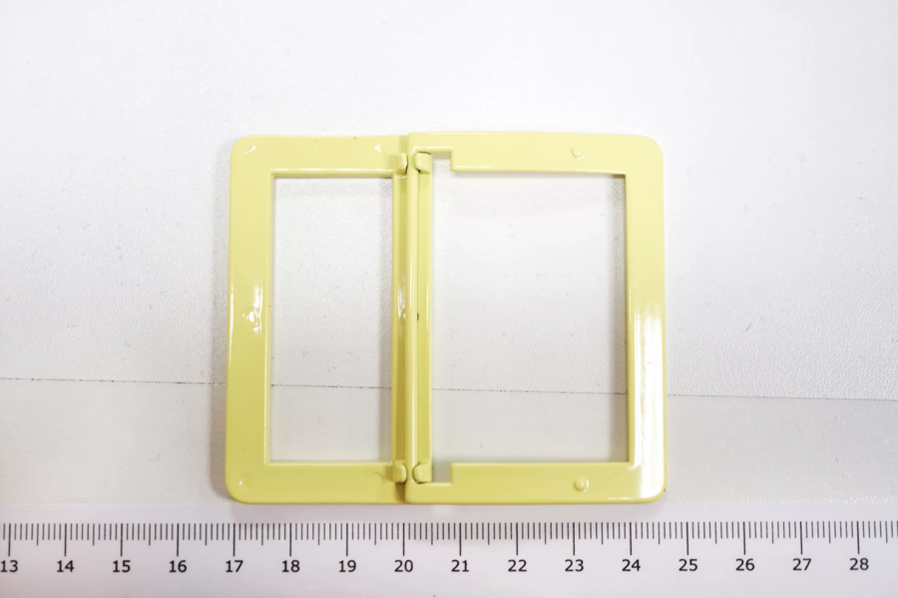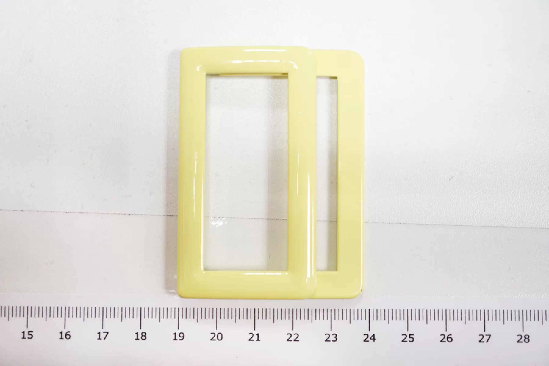Прямоугольная двойная пряжка из металла желтого цвета, размер 65х48 мм. Внутренний размер (для ремешка) - 60х20 мм.