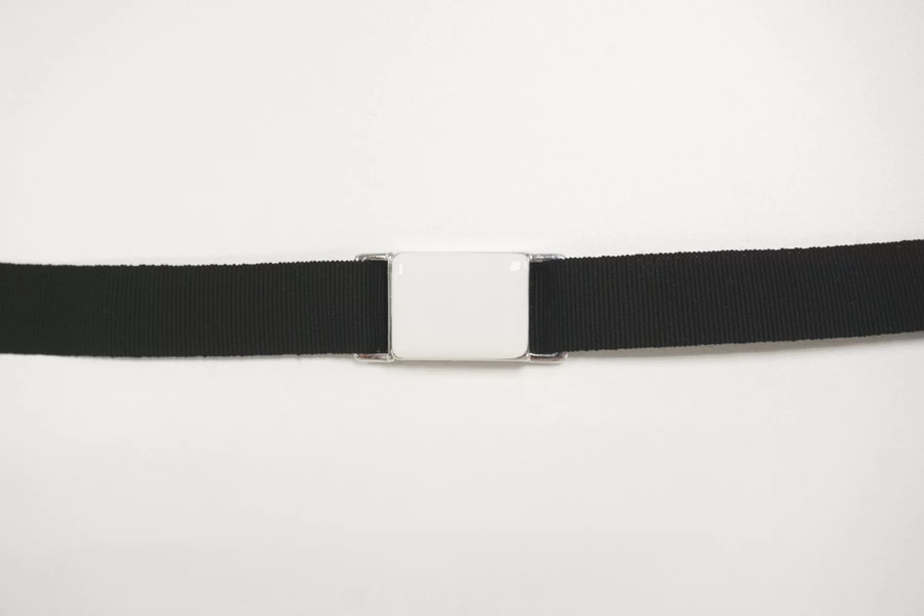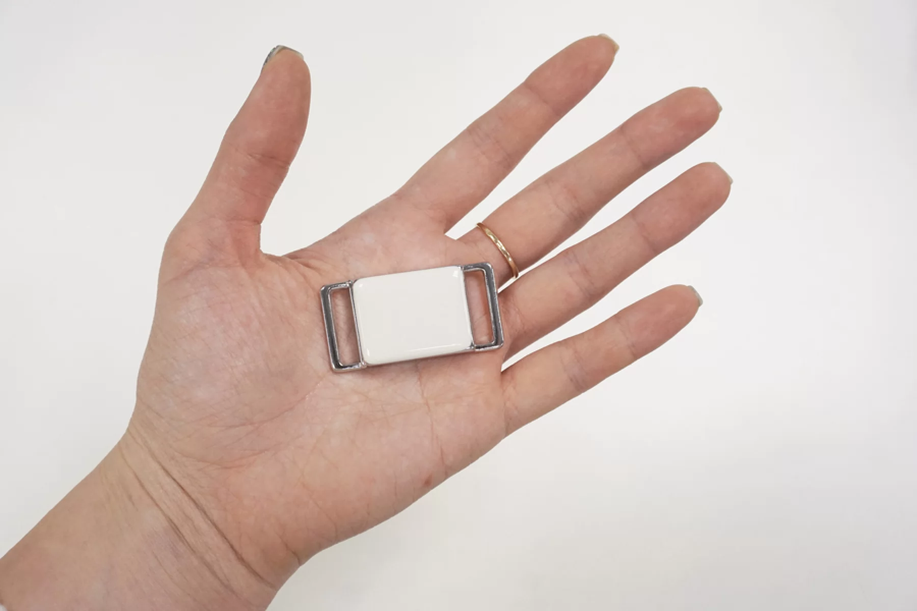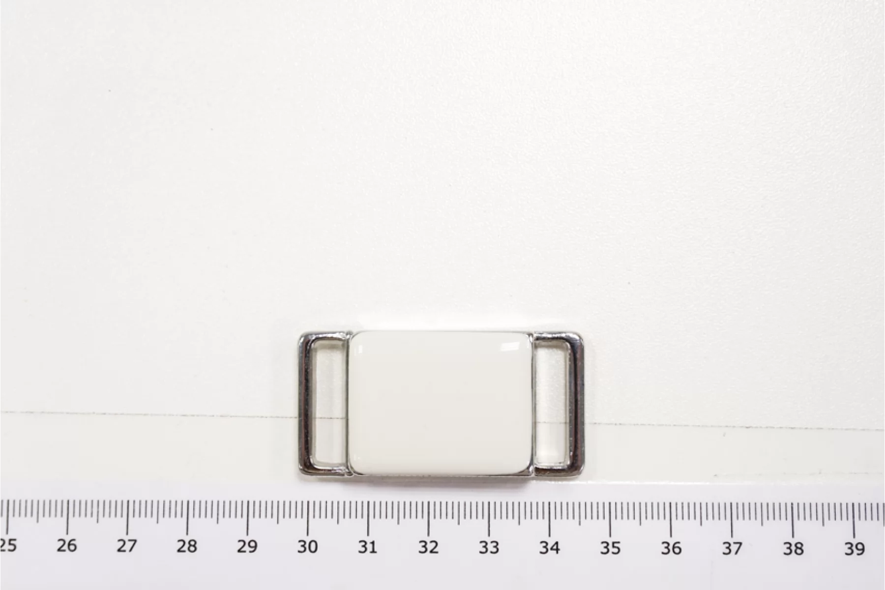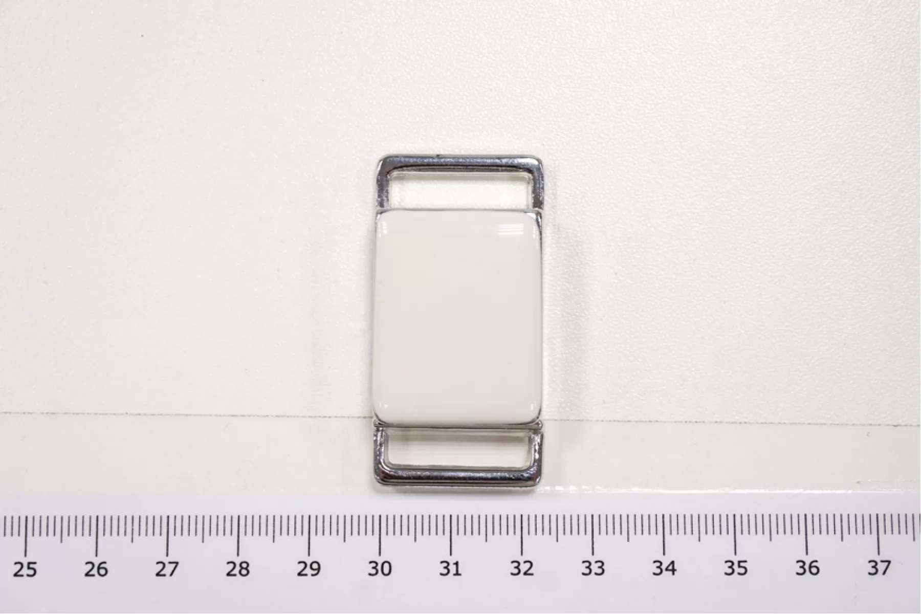 Прямоугольная пряжка из серебристого металла, покрытая эмалью белого цвета. Размер 40х42 мм мм. Внутренний размер (для ремешка) - 20х5 мм.