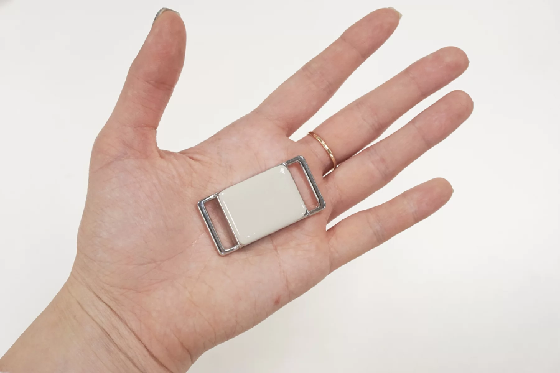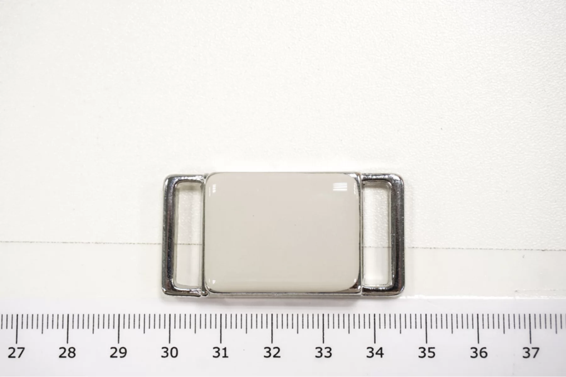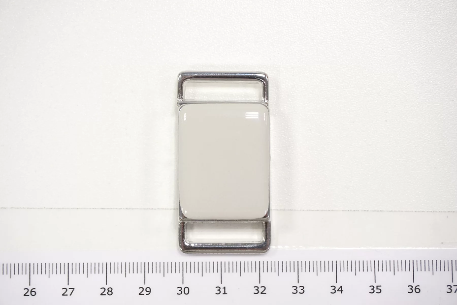 Прямоугольная пряжка из серебристого металла, покрытая эмалью бело-серого цвета. Размер 40х42 мм мм. Внутренний размер (для ремешка) - 20х5 мм.