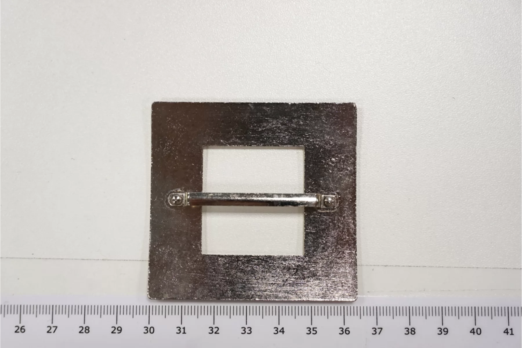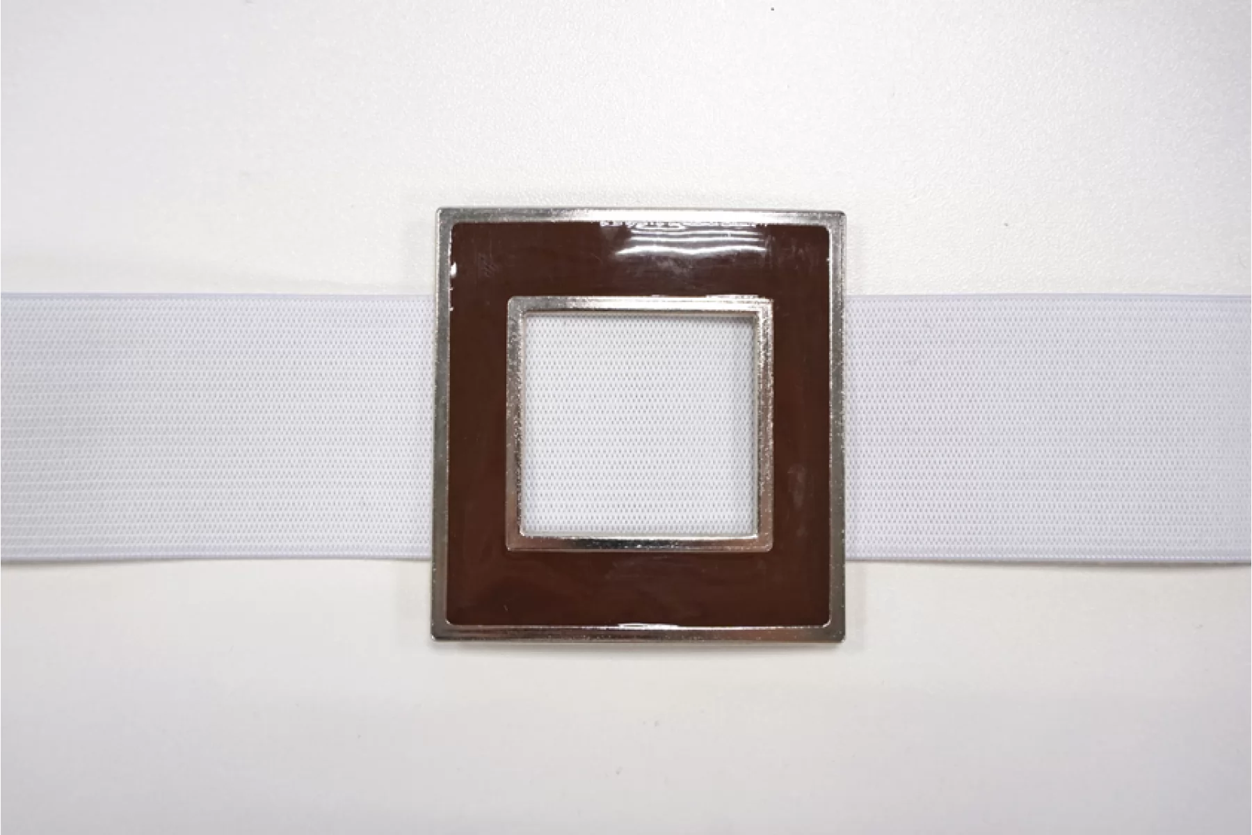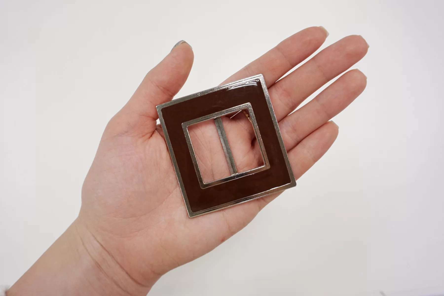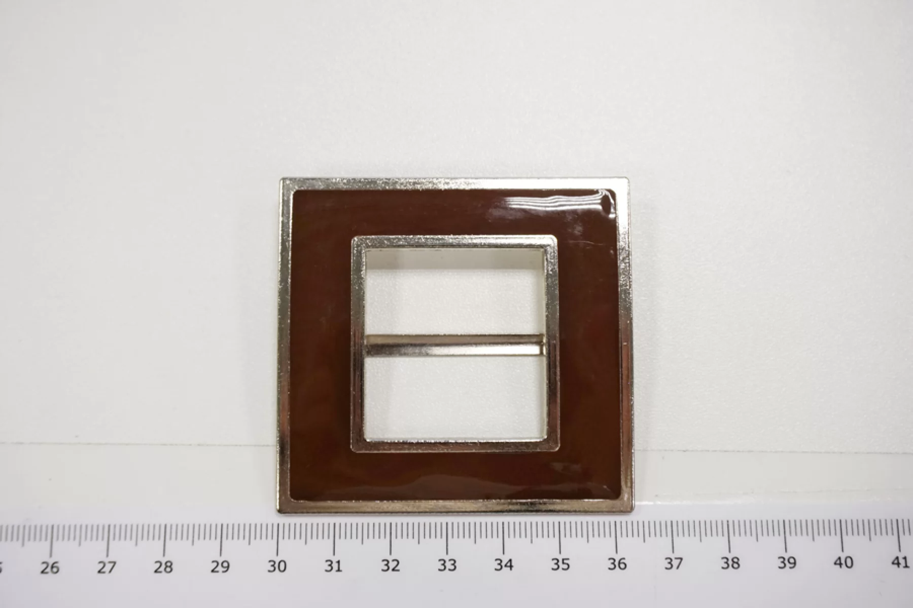 Прямоугольная пряжка из серебристого металла, покрытая глянцевой эмалью бордово-коричневого цвета (махагон). Размер - 63х60 мм. Внутренний размер (для ремешка) - 40х35 мм.