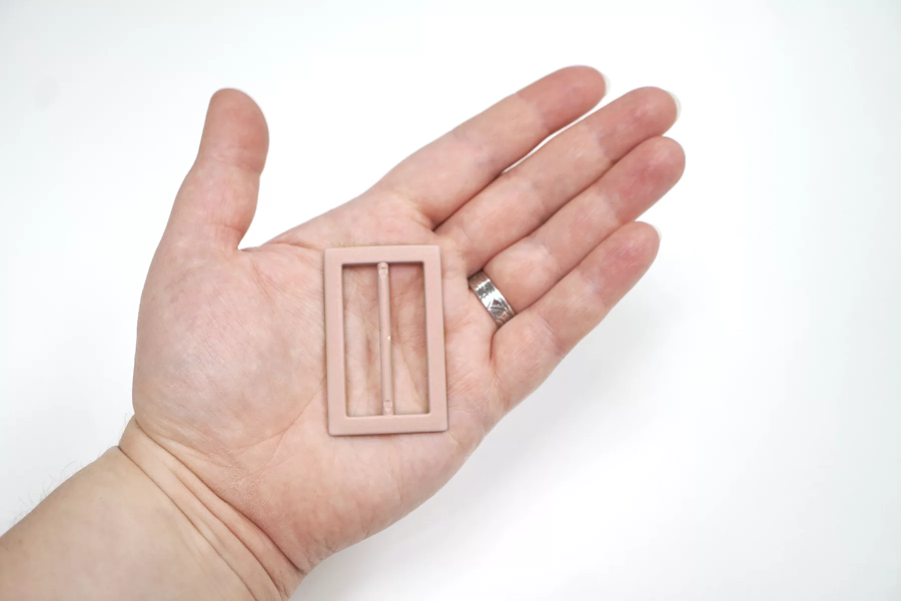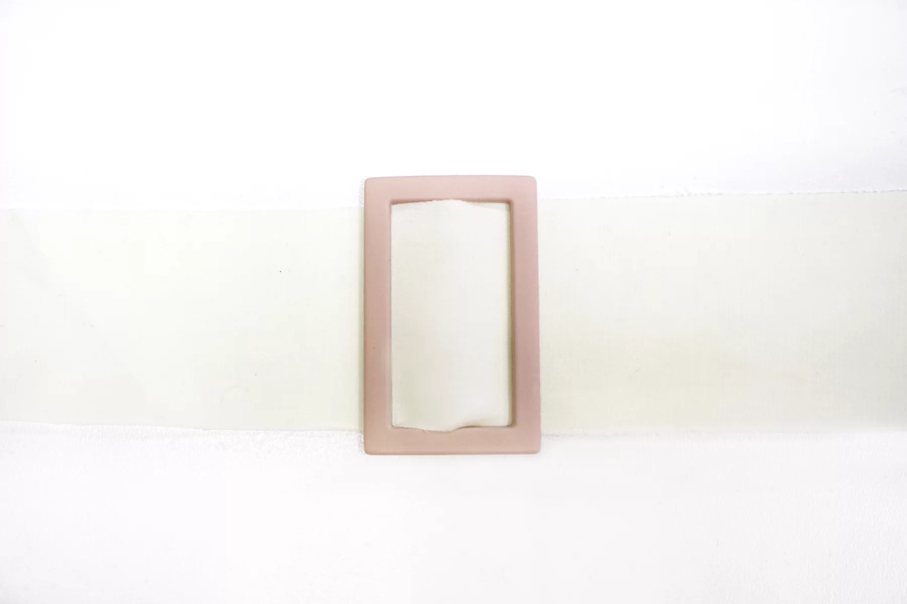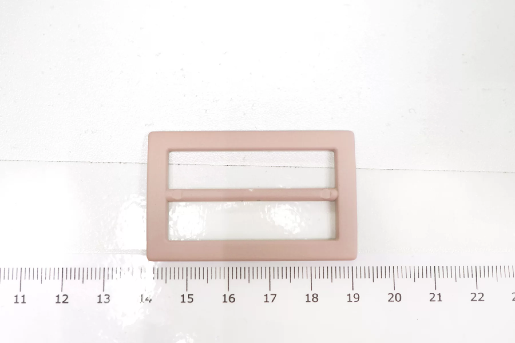 Квадратная пряжка из металла розового цвета с шершавой поверхностью, размер 50х32 мм. Внутренний размер (для ремешка) - 40х10 мм.