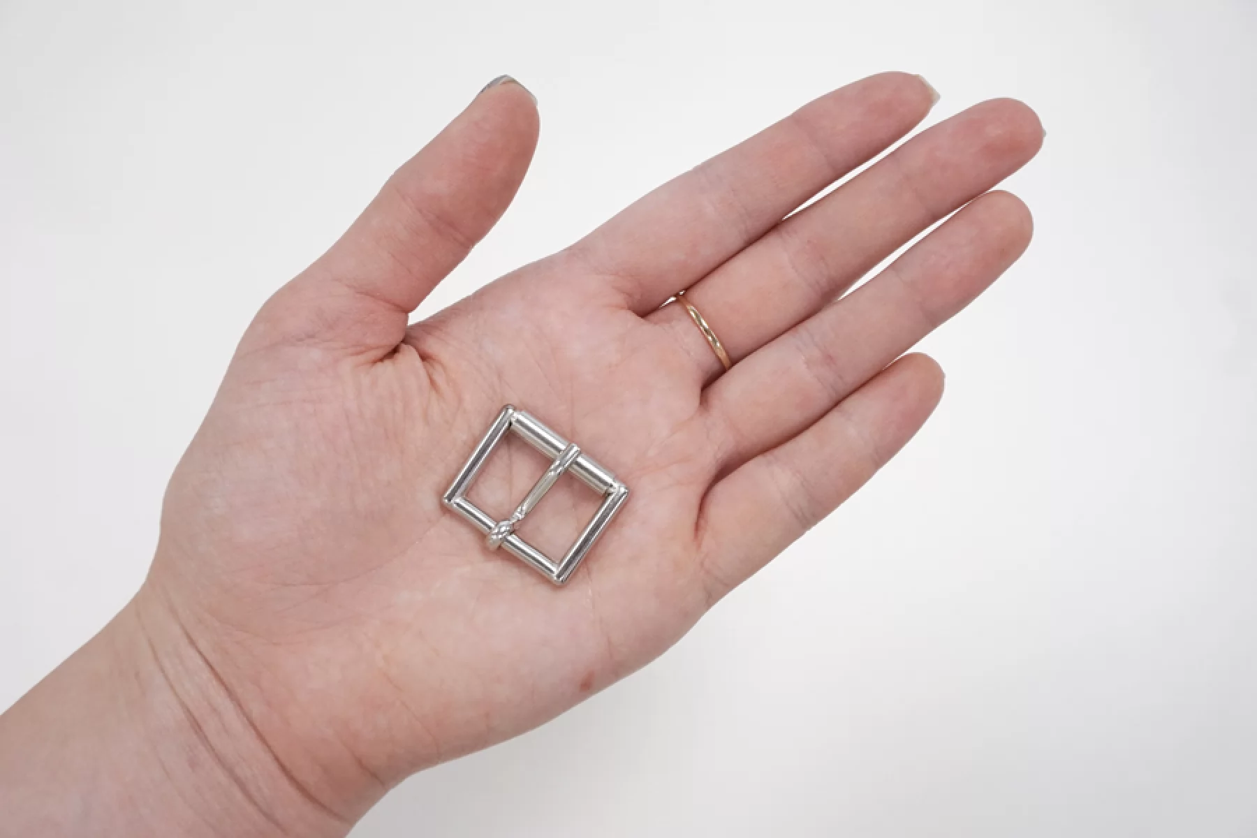 Прямоугольная пряжка из серебристого металла, размер 28х22 мм. Внутренний размер (под ширину ремешка) - 20х15 мм.
