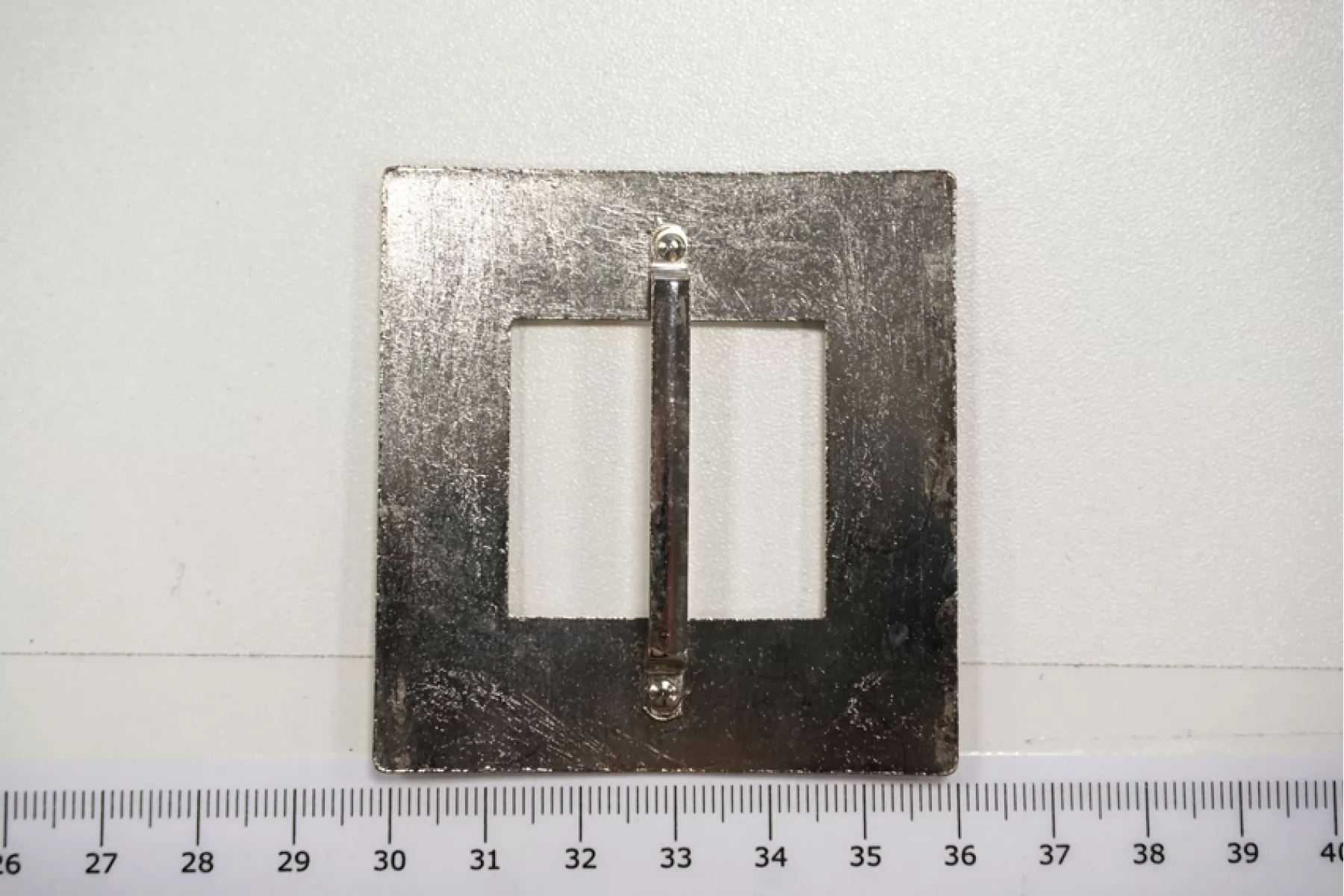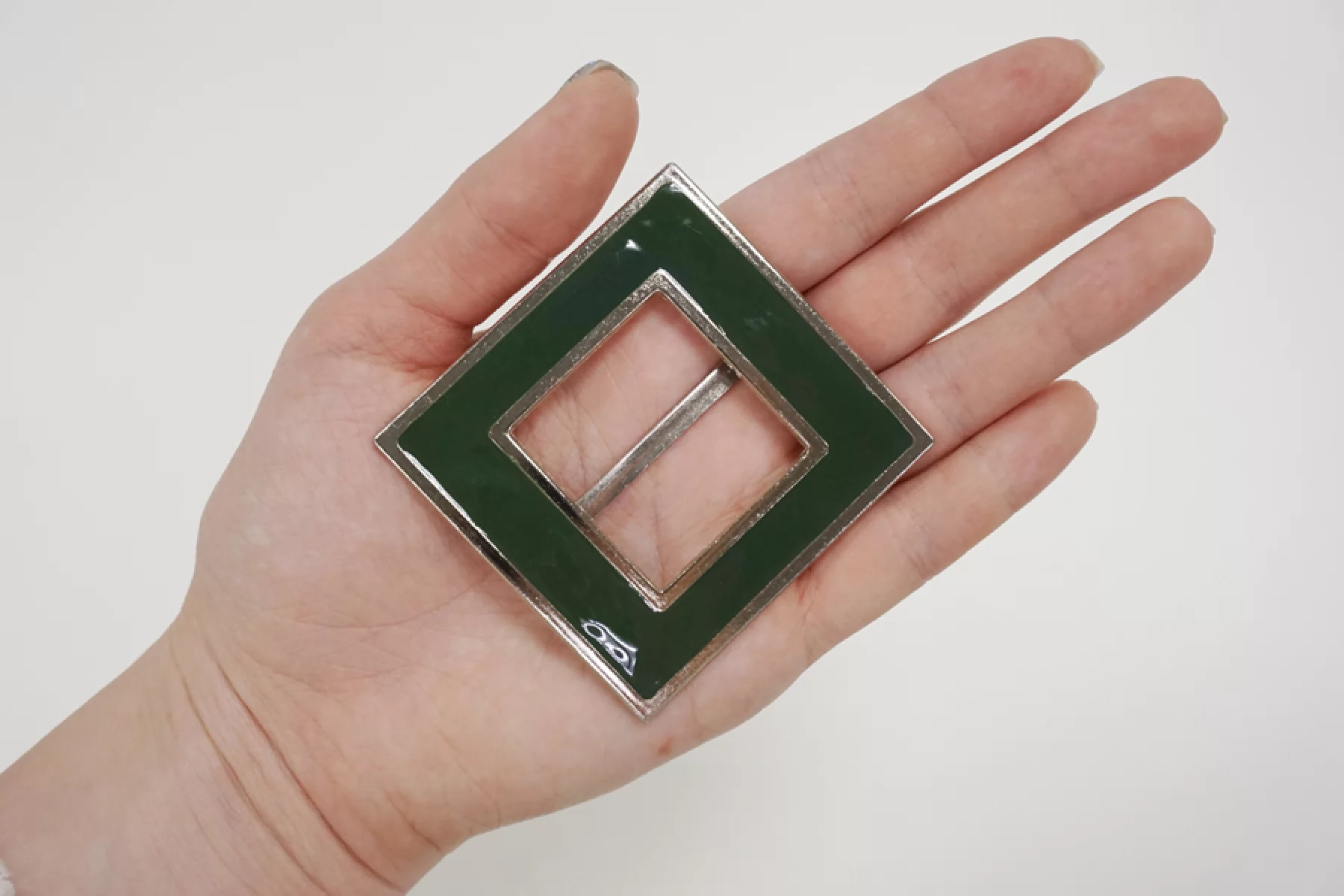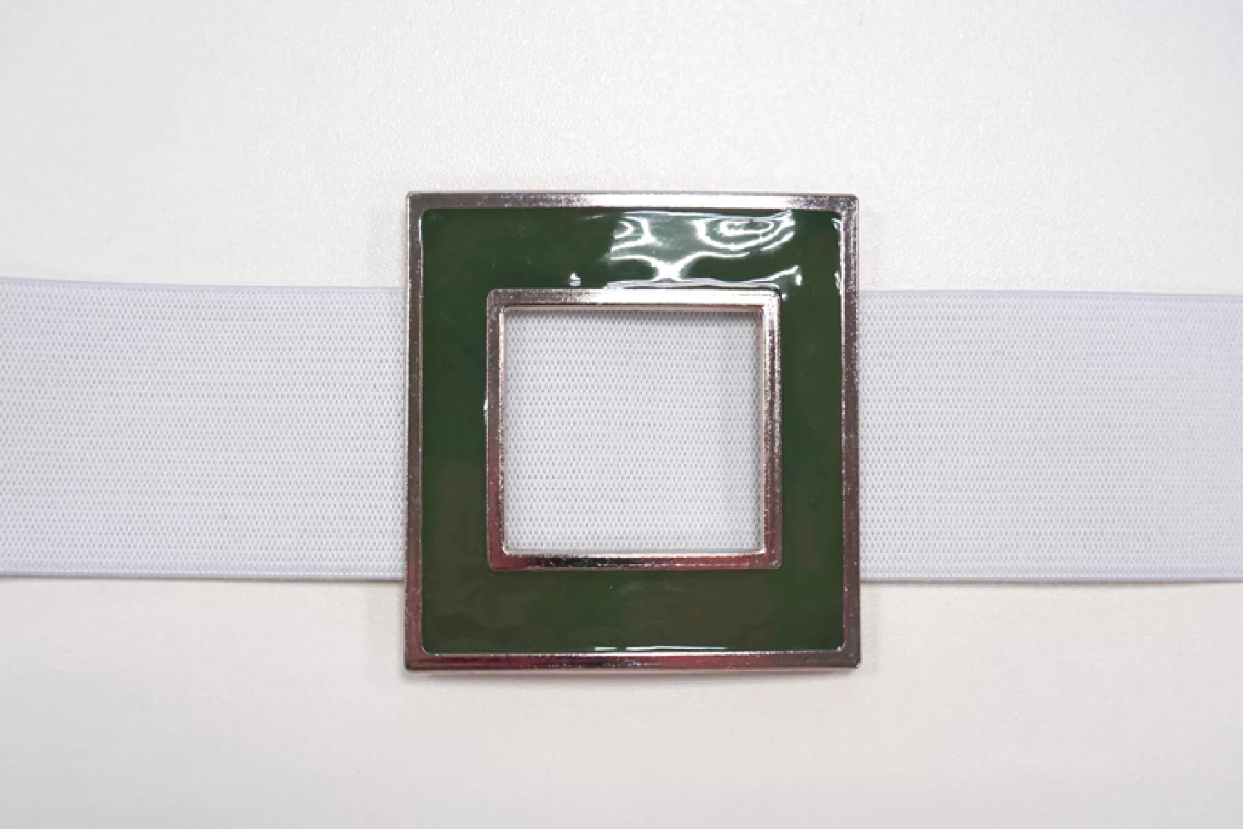Прямоугольная пряжка из серебристого металла, покрытая глянцевой эмалью цвета темно-зеленой оливы . Размер - 63х60 мм. Внутренний размер (для ремешка) - 40х35 мм.