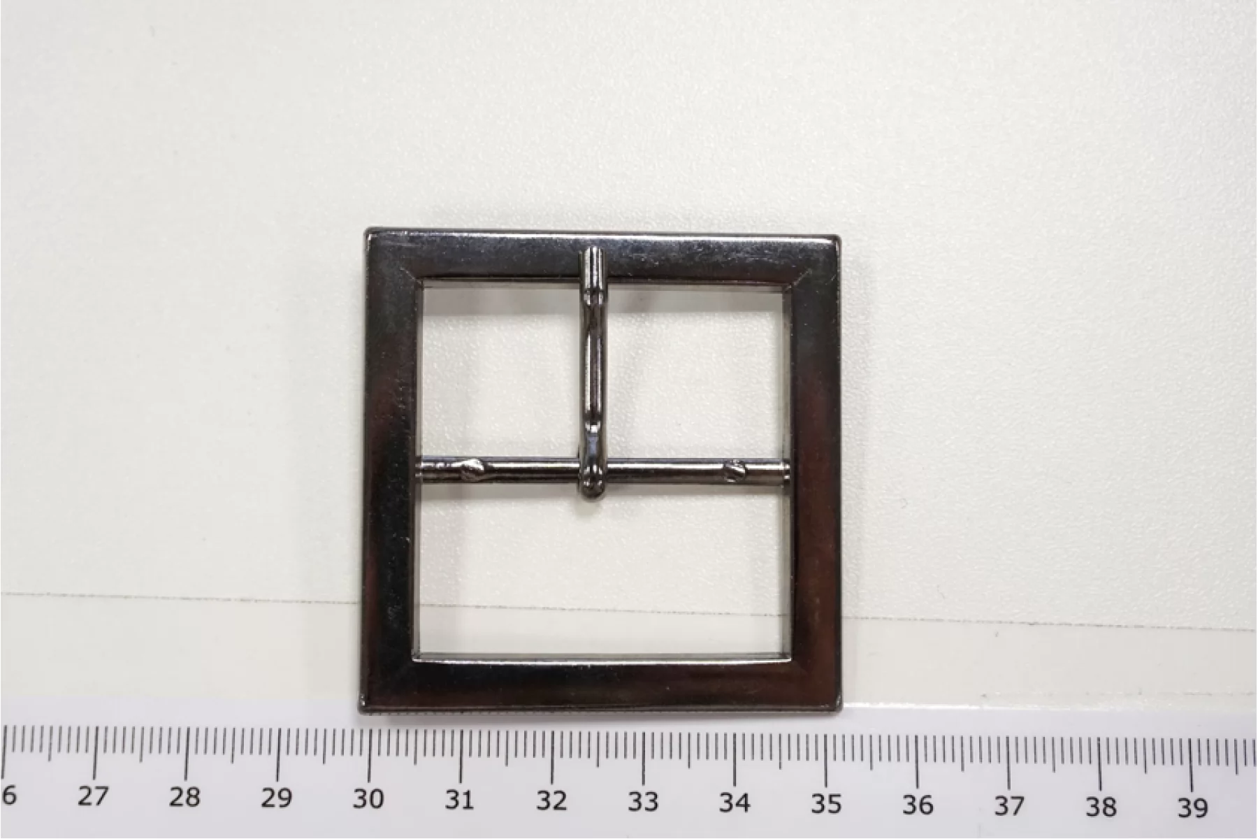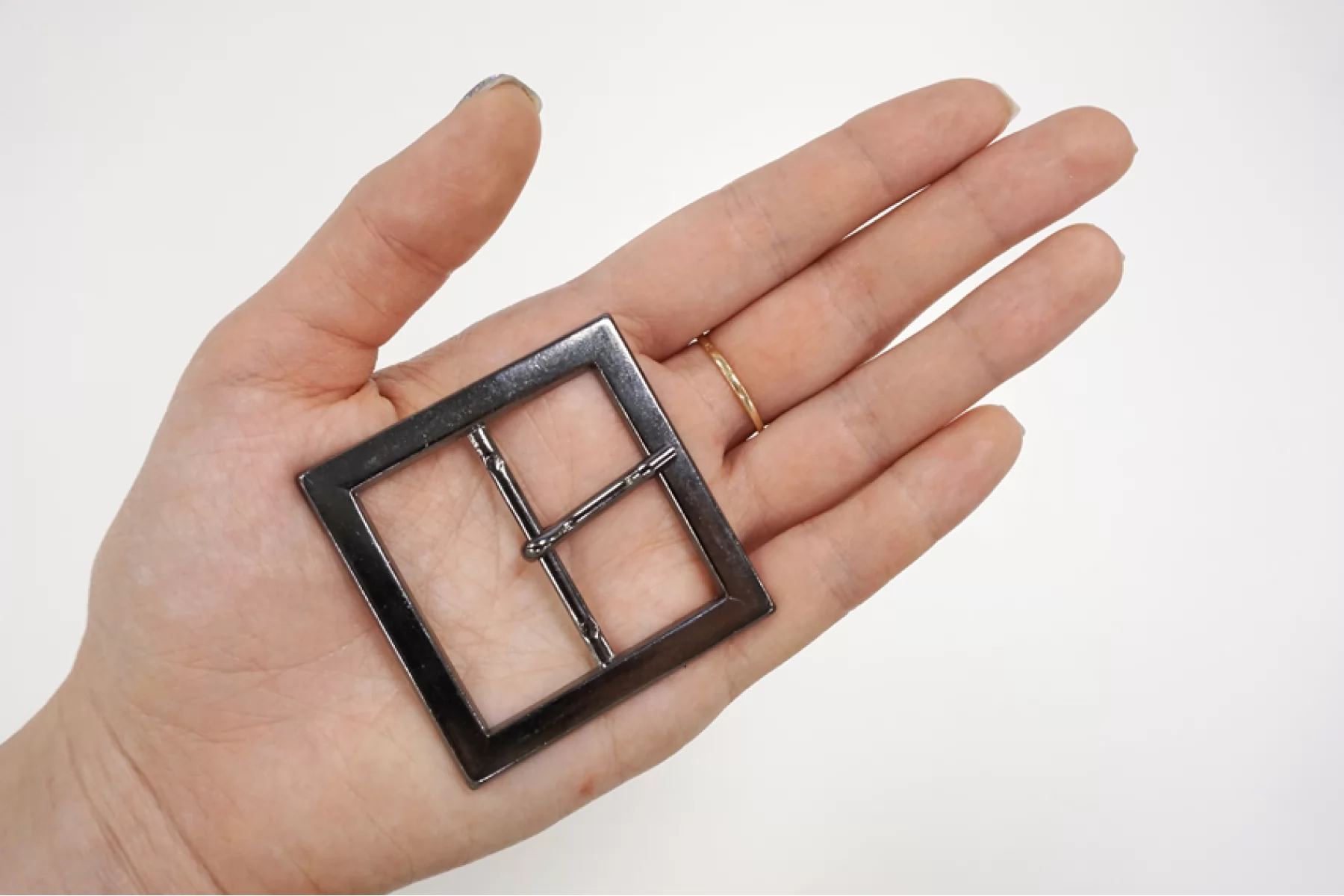 Прямоугольная пряжка из металла, цвета темного никеля. Размер 52х52 мм, внутренний размер (под ширину ремешка) - 40х40 мм.