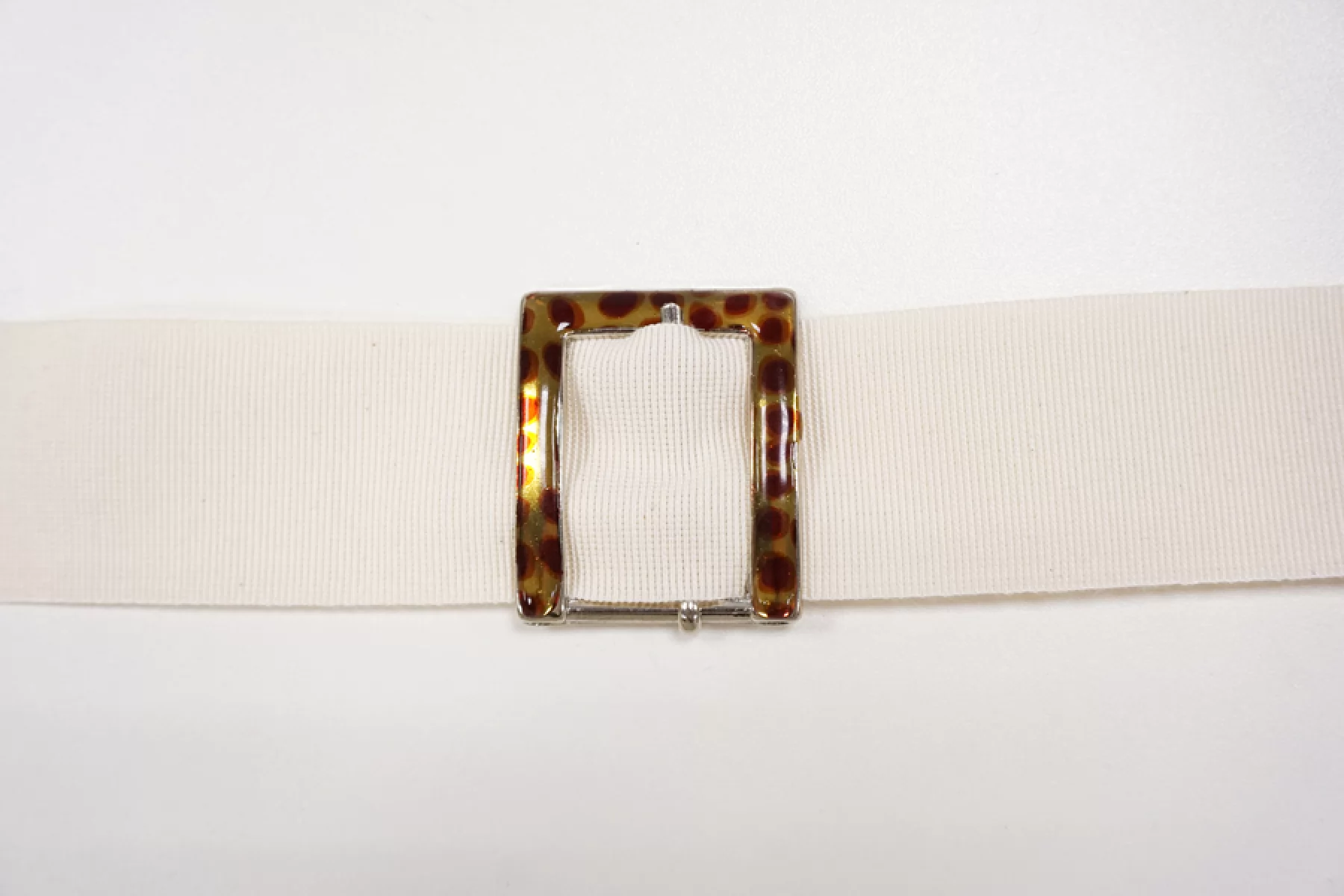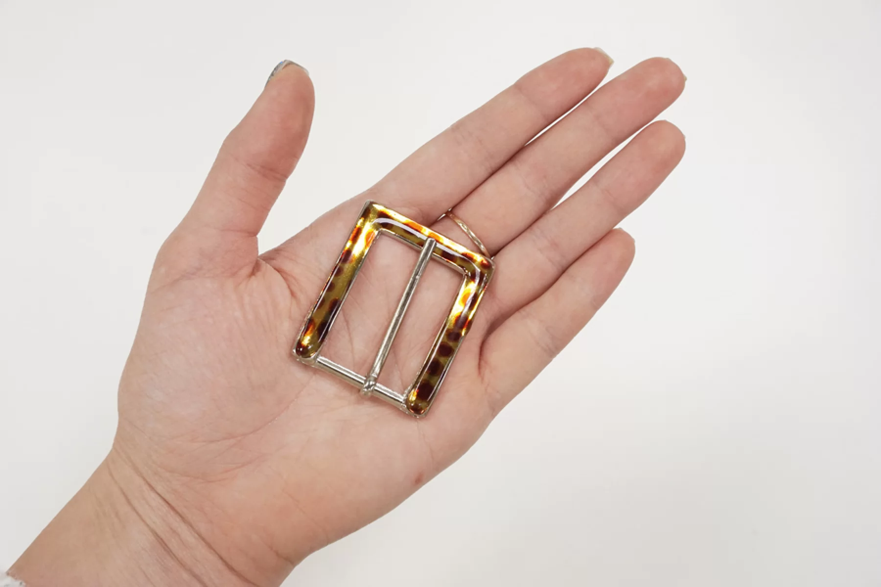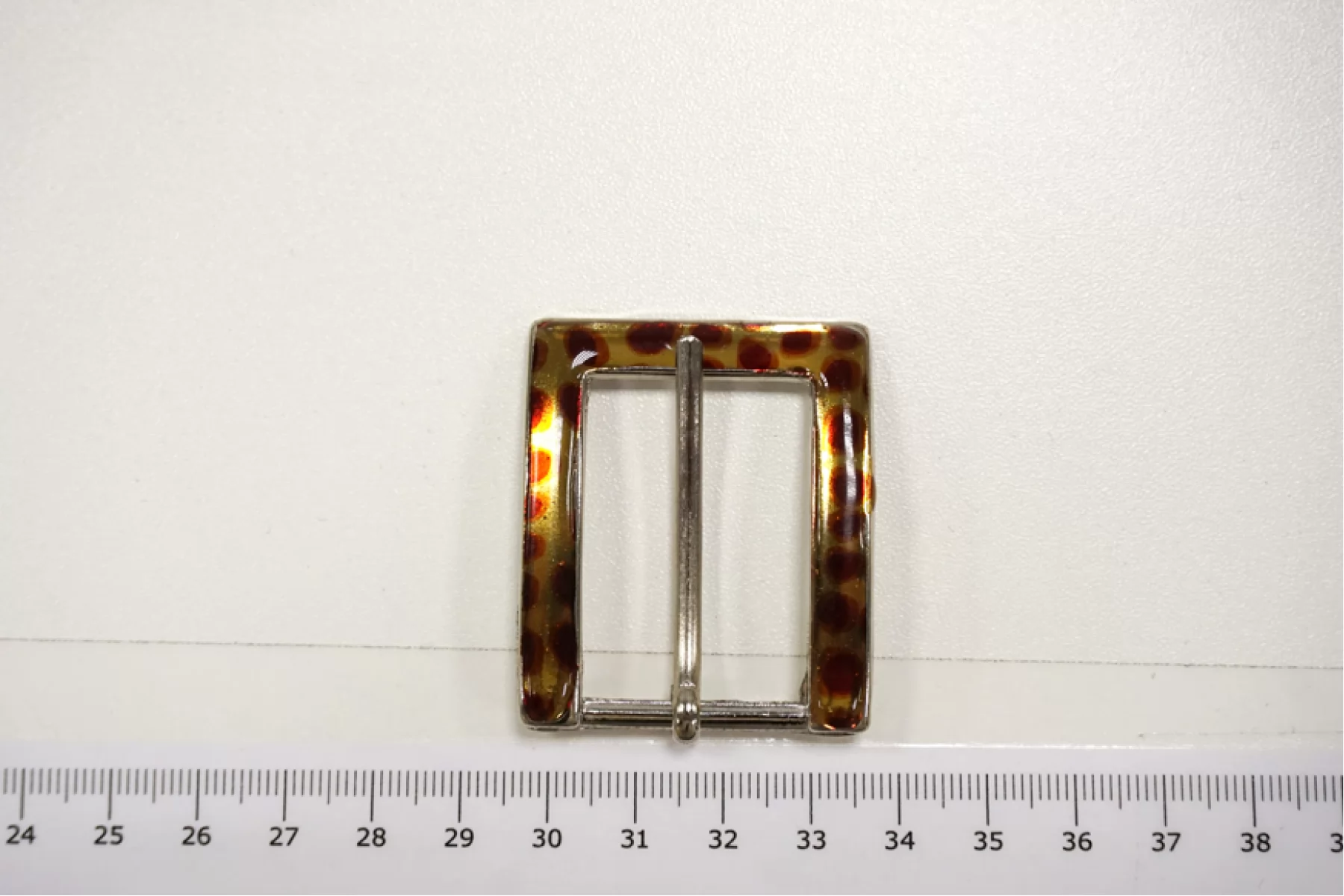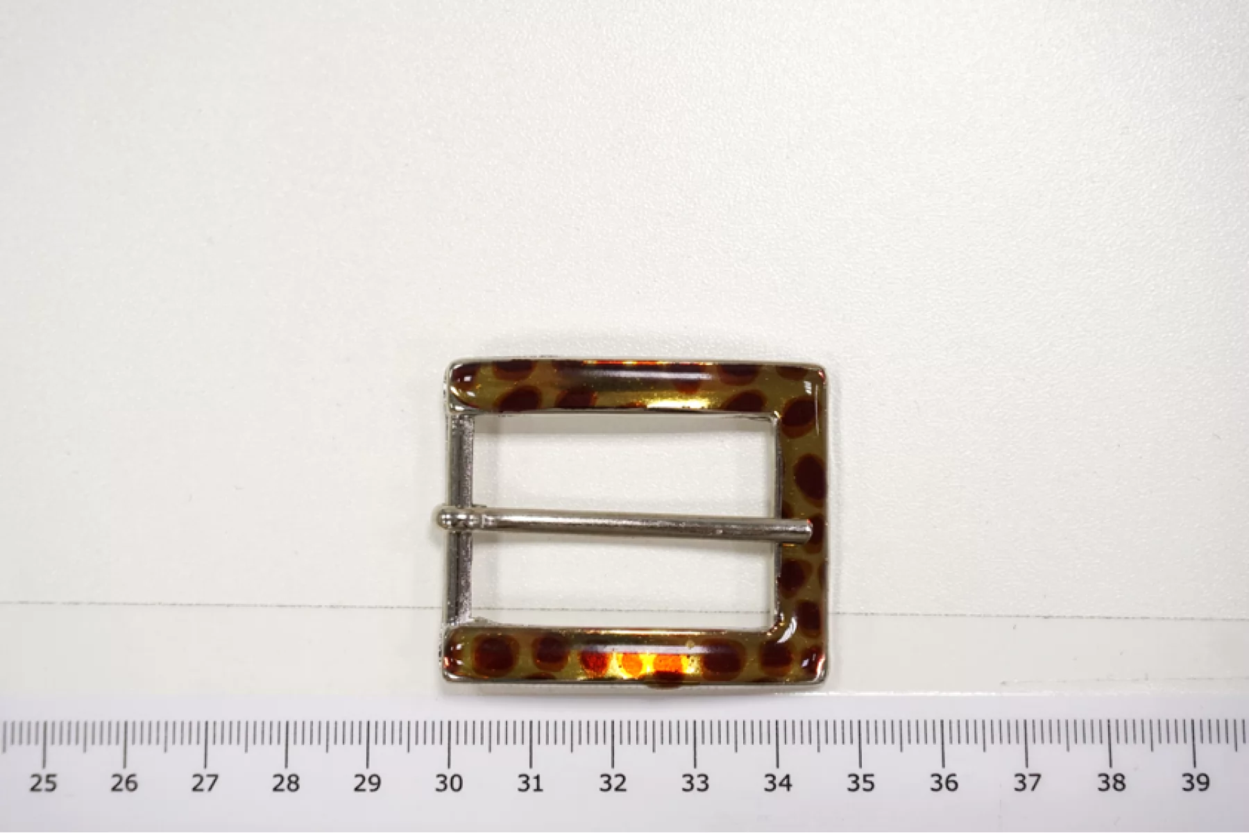 Прямоугольная пряжка из серебристого металла, покрытая эпоксидной смолой и стилизованная под леопарда желто-красного цвета. Размер 40х42 мм мм. Внутренний размер (для ремешка) - 25х36 мм.
