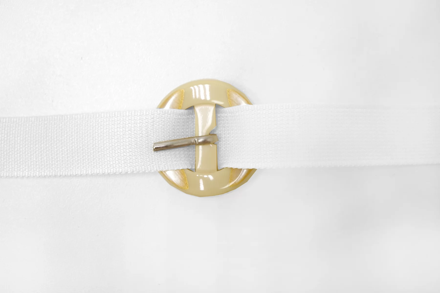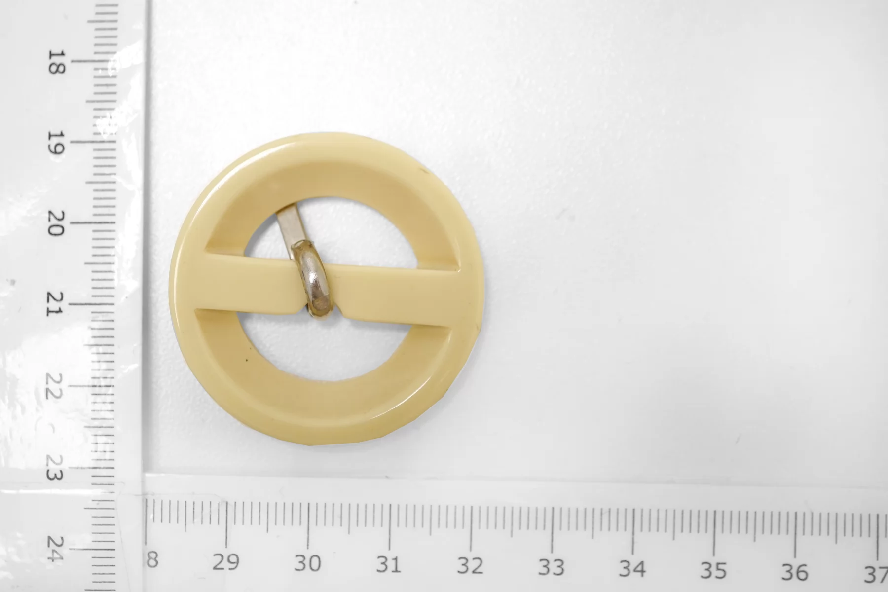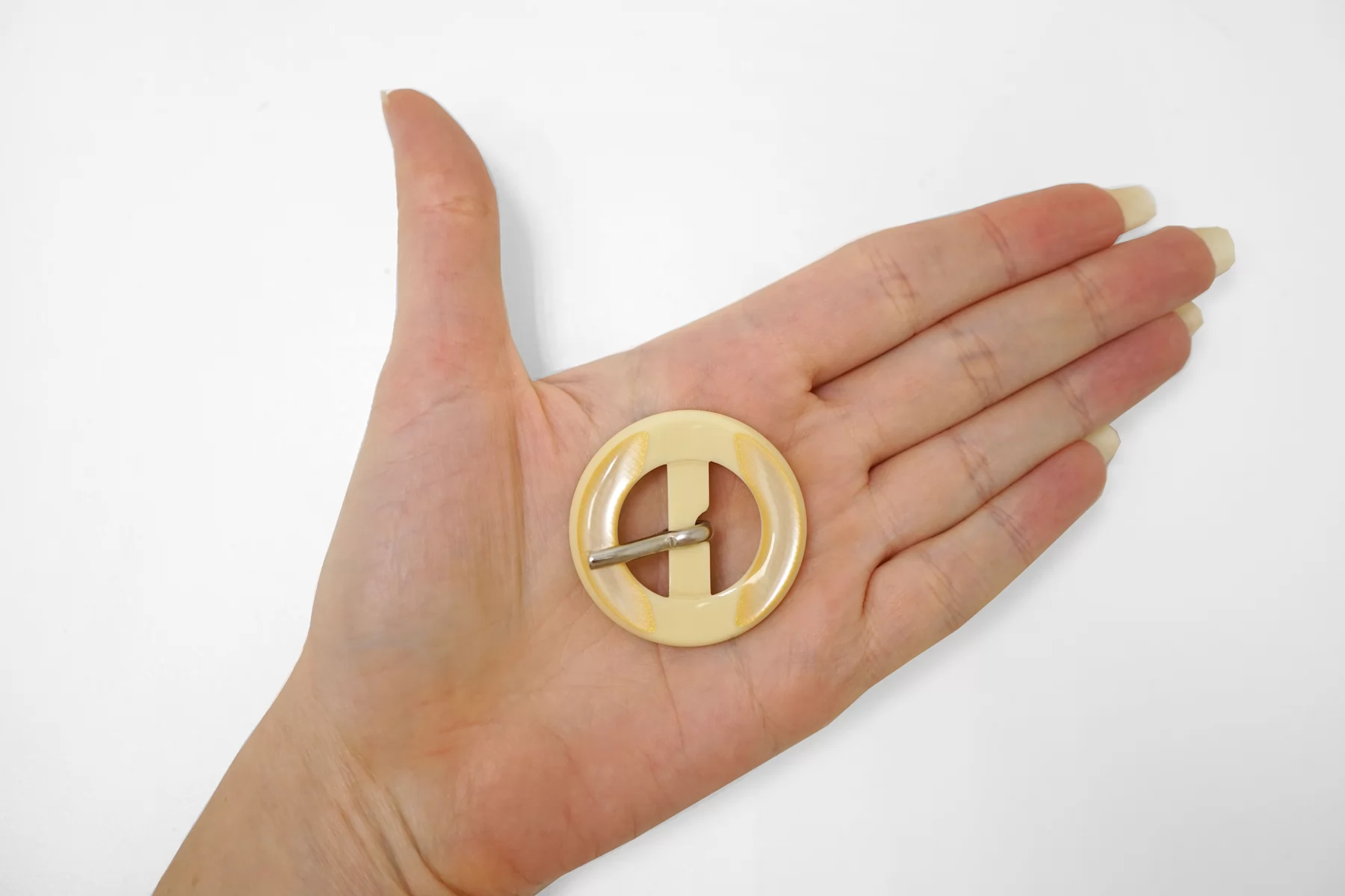 Круглая пряжка из пластмассы, бежевого цвета с перламутром. Внутренний размер (для ремешка) - 20 мм. Пряжка с металлическим язычком.