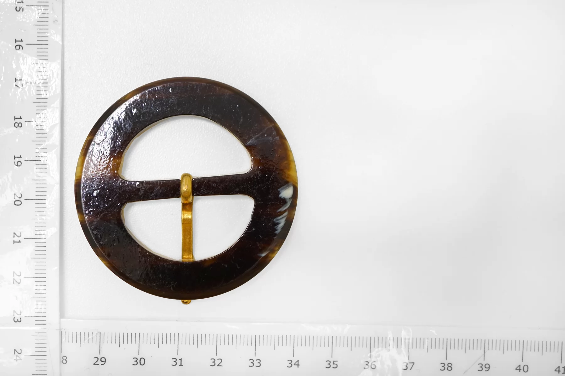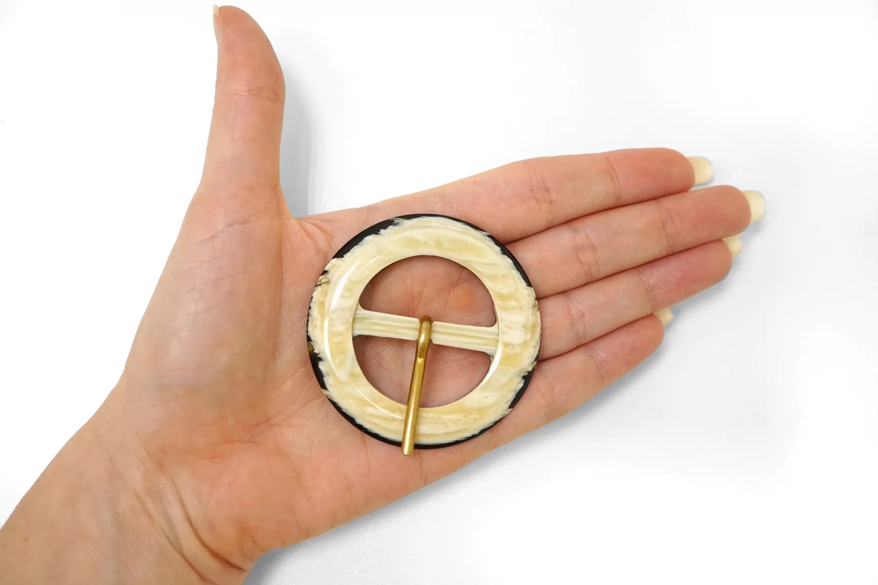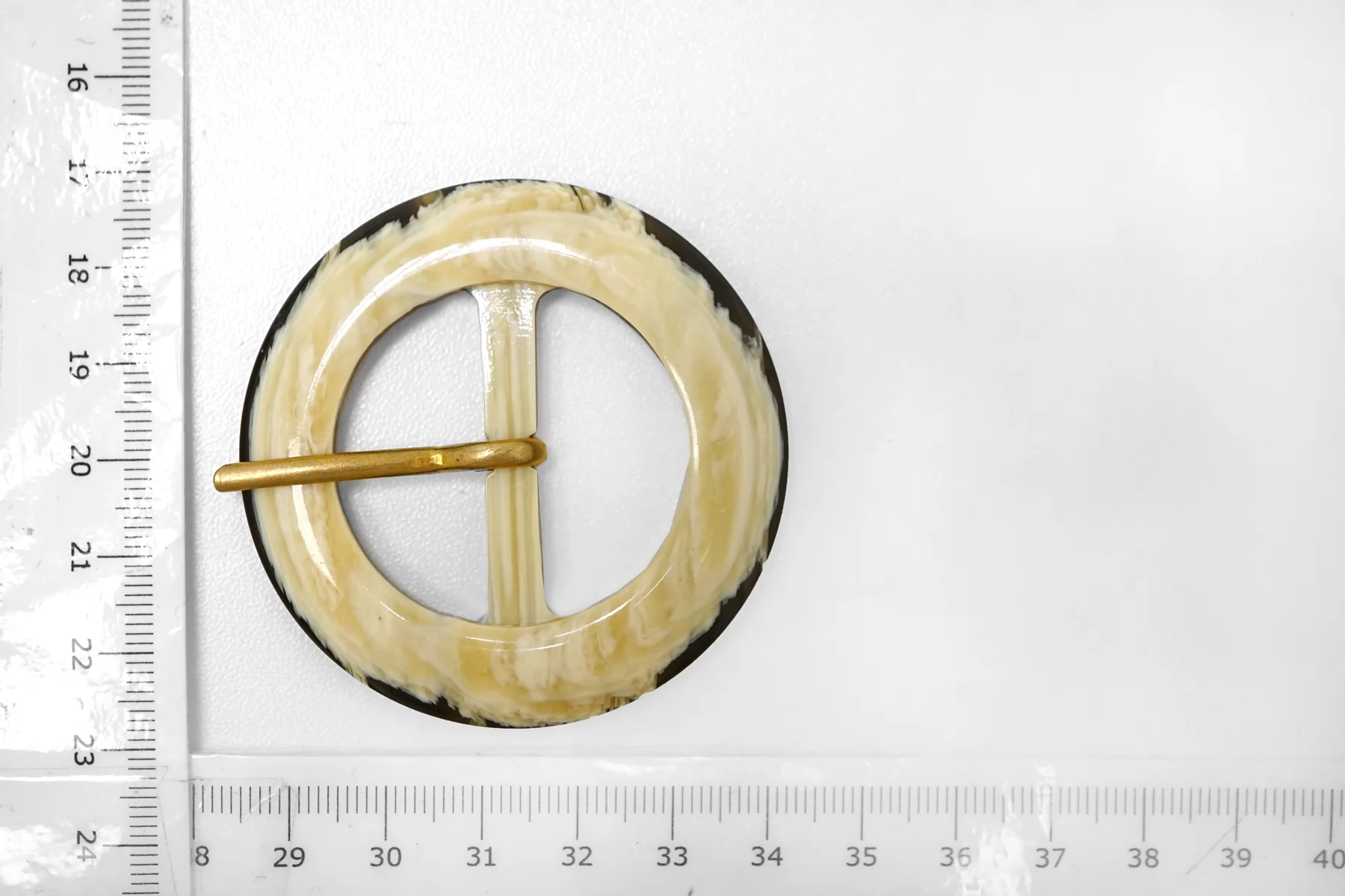 Круглая пряжка из пластмассы, бежевого цвета под рог. Внутренний размер (для ремешка) - 35мм. Пряжка с металлическим язычком.
