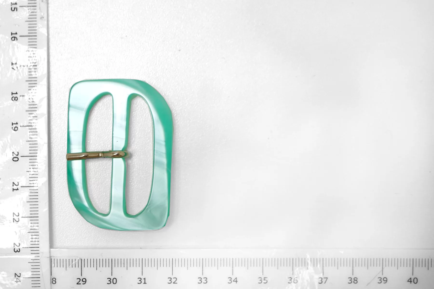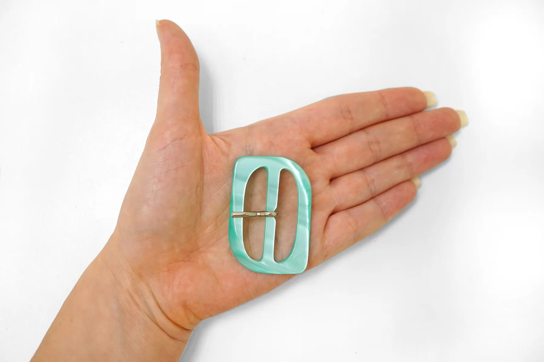 Пряжка из пластмассы, бирюзового цвета с перламутром. Внутренний размер (для ремешка) - 40 мм. Пряжка с металлическим язычком.