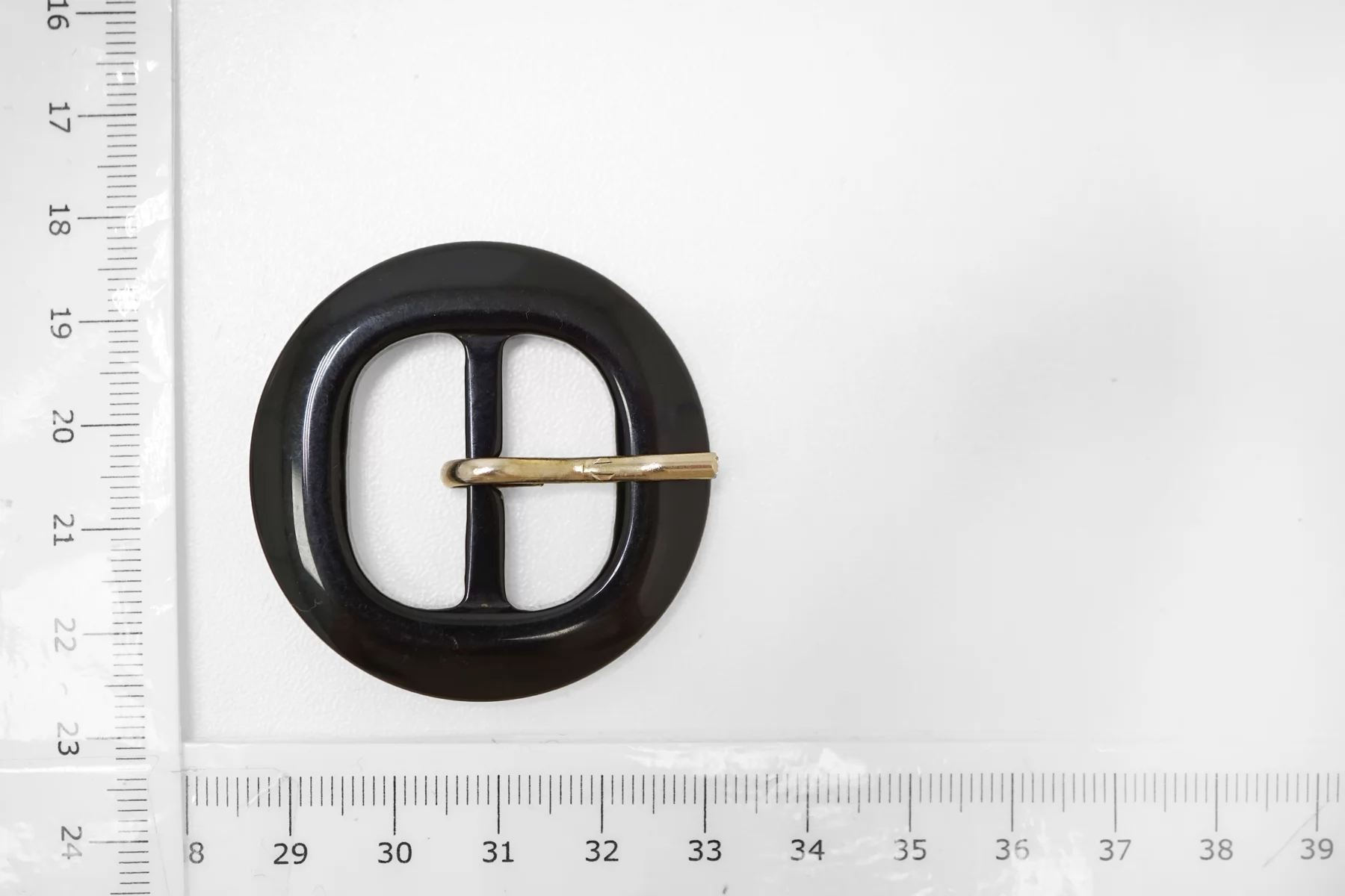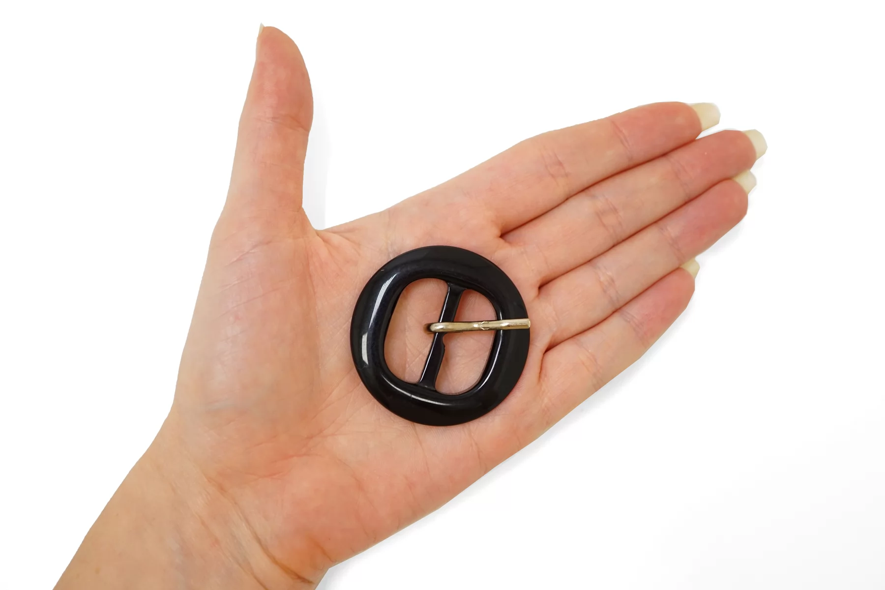 Круглая пряжка из пластмассы, черного цвета . Внутренний размер (для ремешка) - 25 мм. Пряжка с металлическим язычком.