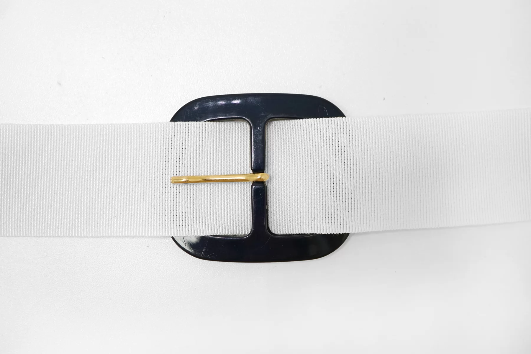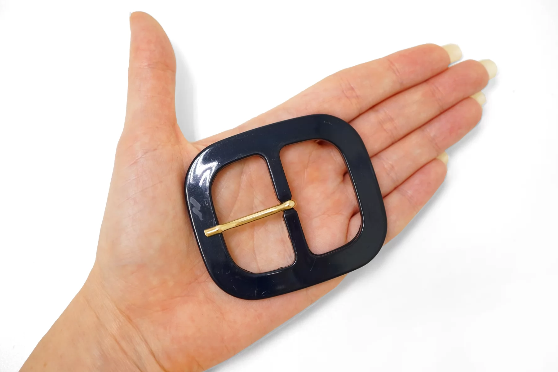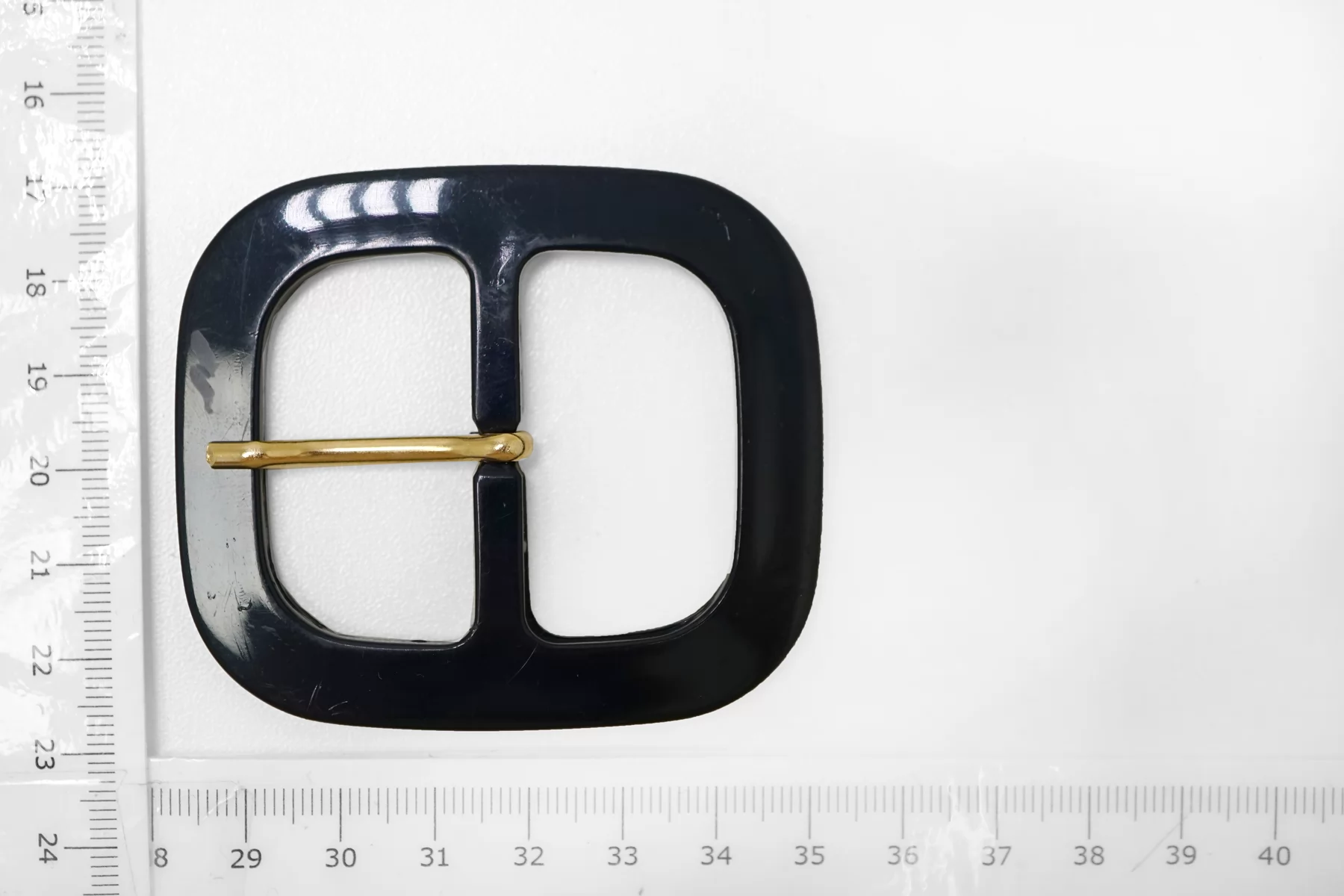 Пряжка из пластмассы, черно-синего цвета. Внутренний размер (для ремешка) - 40 мм. Пряжка с металлическим язычком.