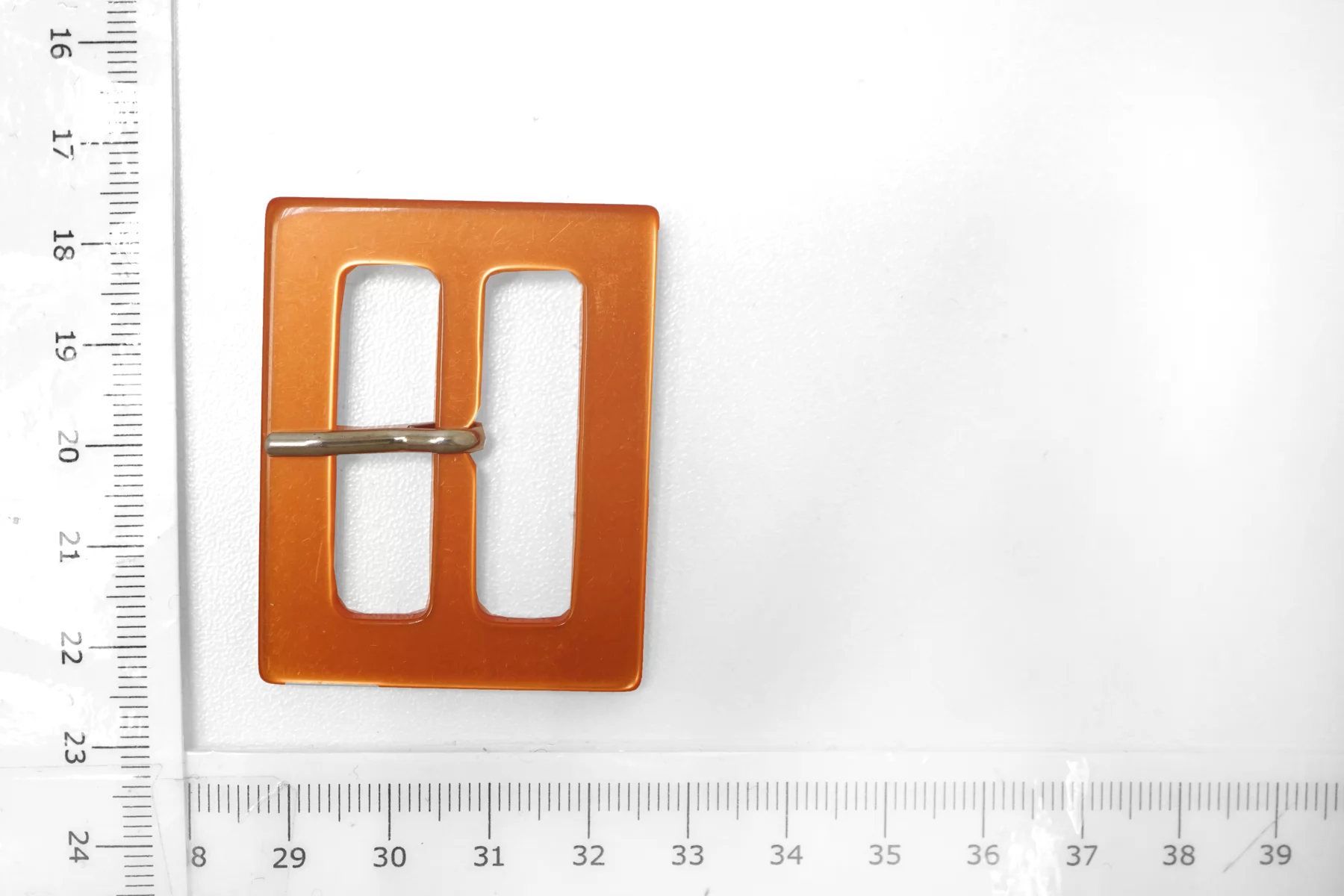 Прямоугольная пряжка из пластмассы, оранжевого цвета с перламутром. Внутренний размер (для ремешка) - 35 мм. Пряжка с металлическим язычком.