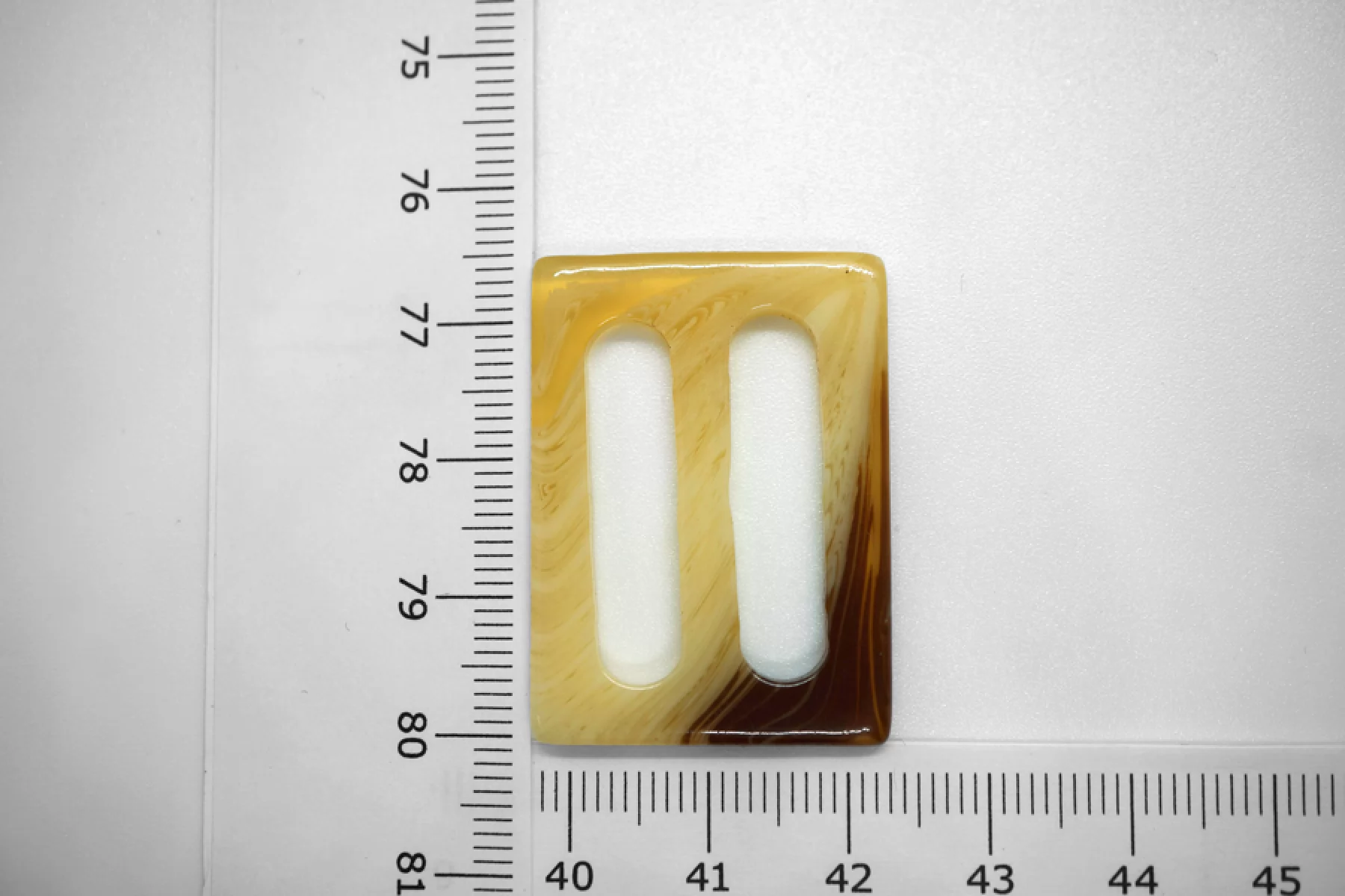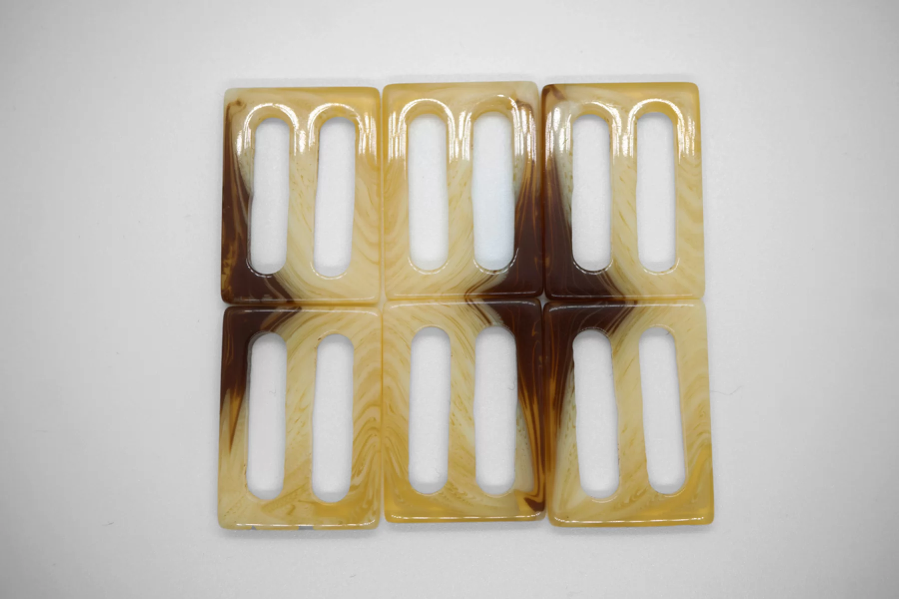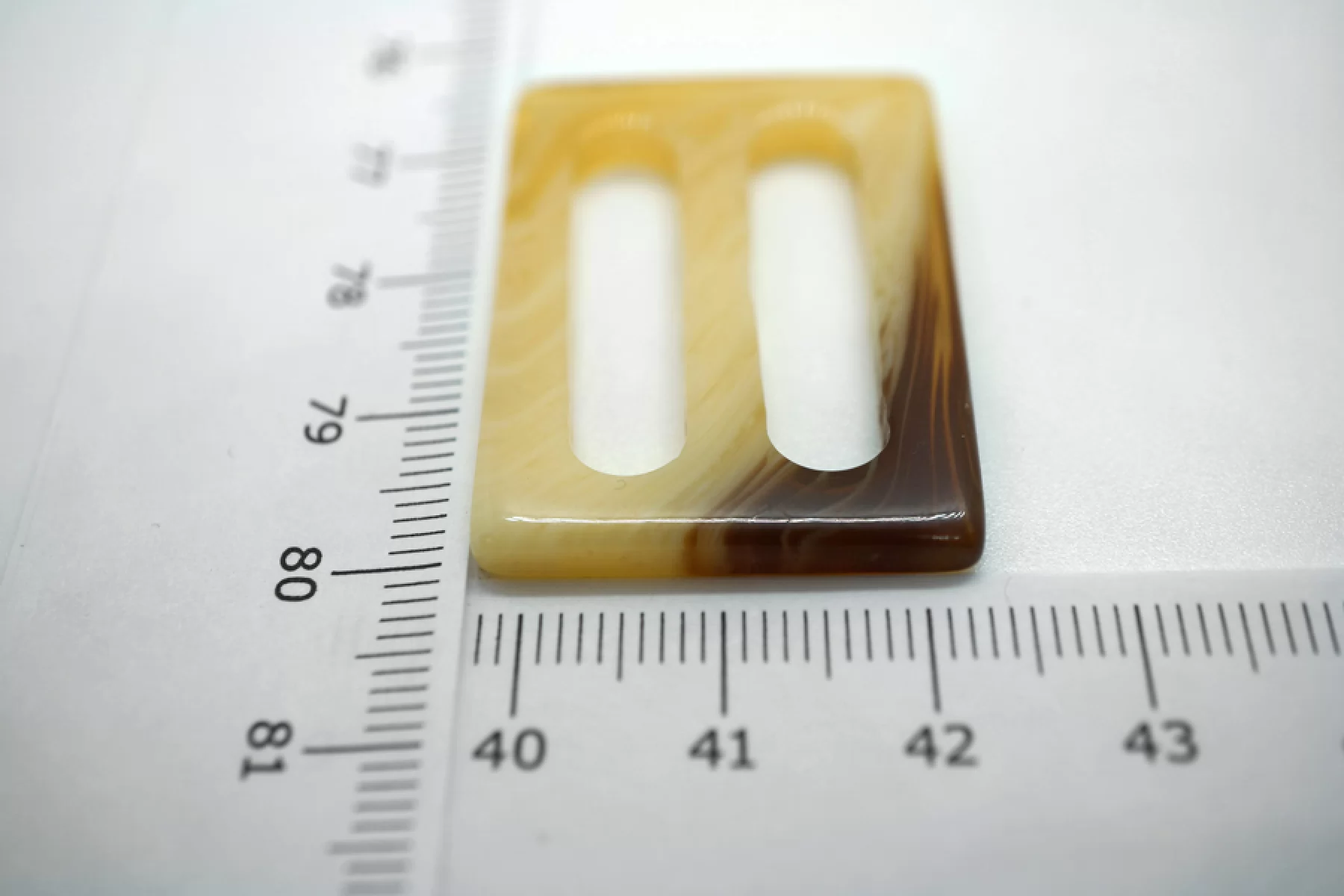 Прямоугольная пряжка из пластмассы, цвет коричнево-бежево-молочный. Размер 35 мм х 25 мм.