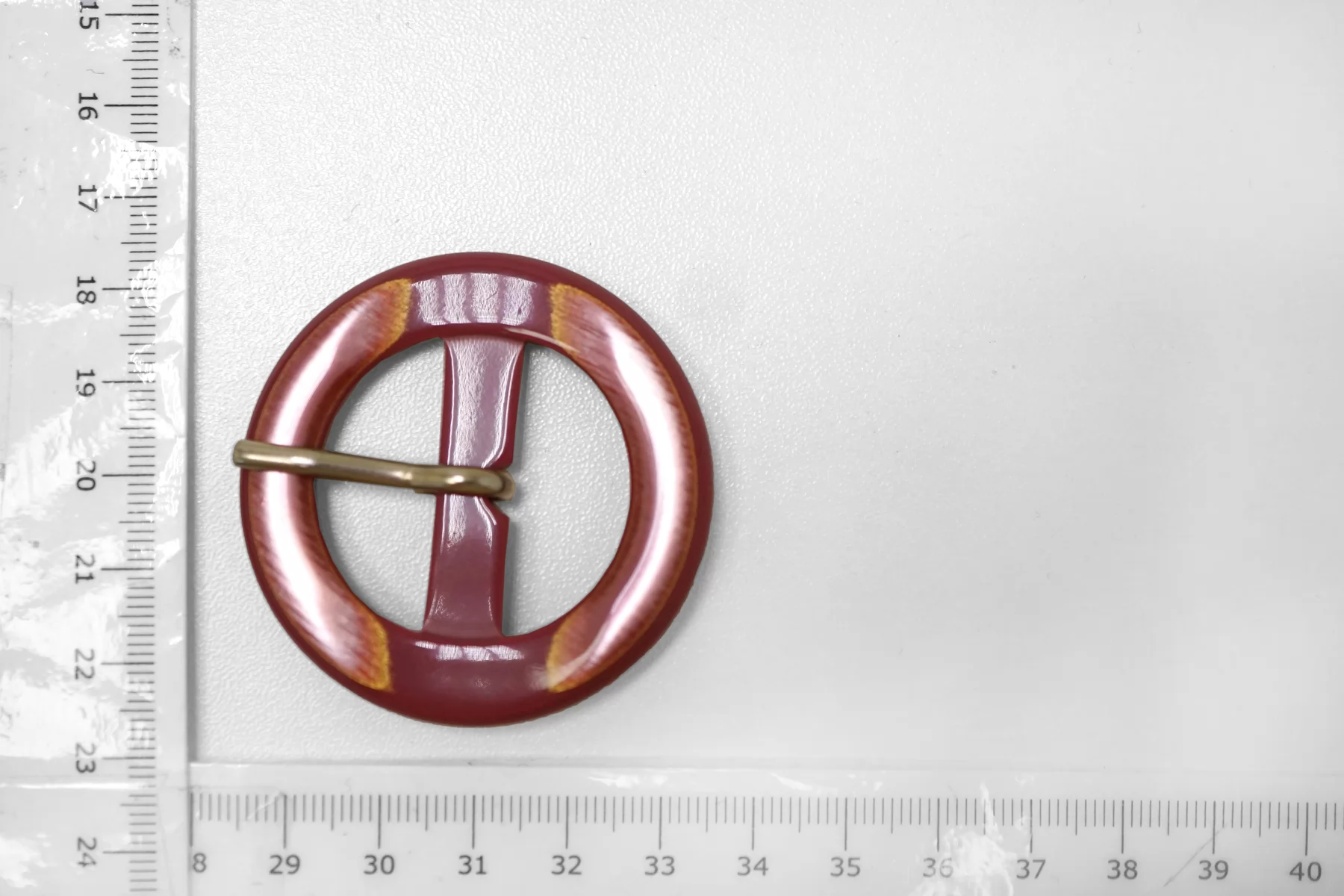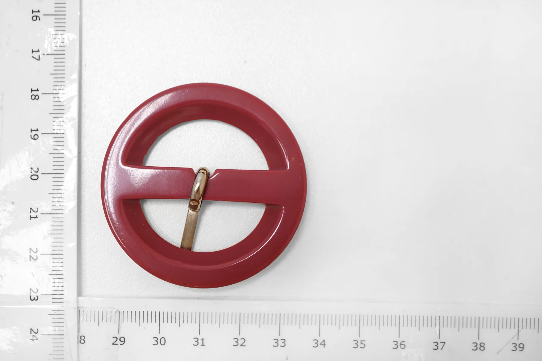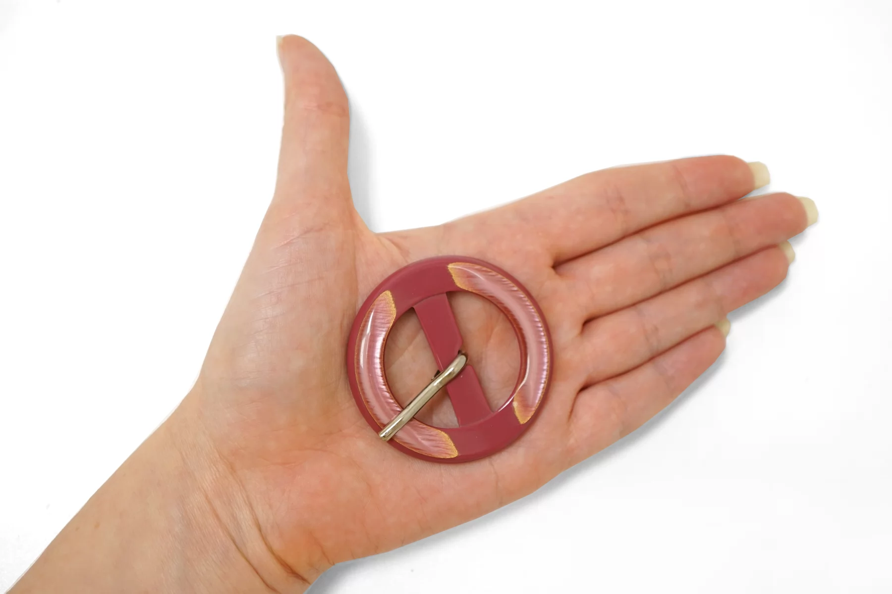 Круглая пряжка из пластмассы, розовая цвета с перламутром. Внутренний размер (для ремешка) - 30 мм. Пряжка с металлическим язычком.