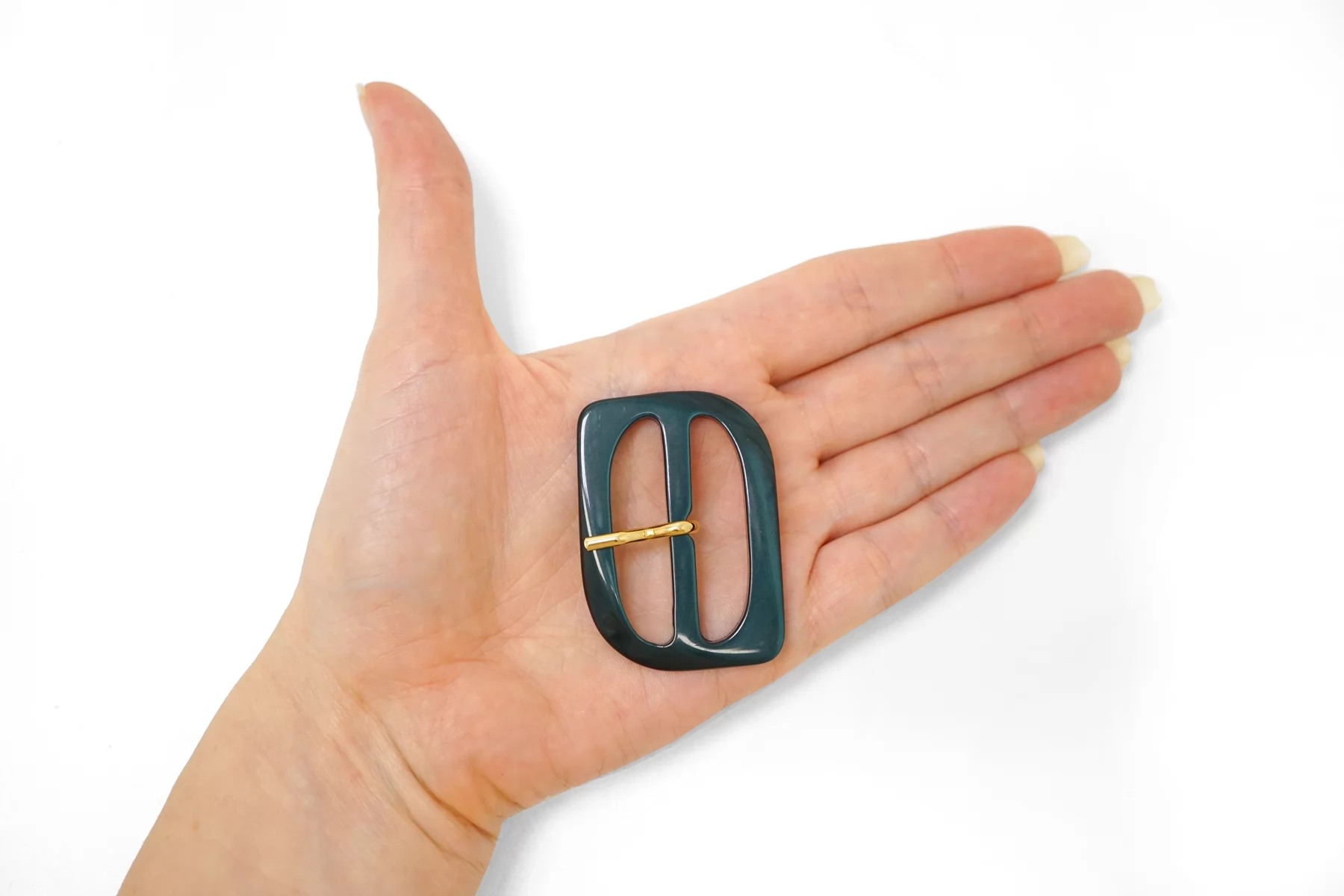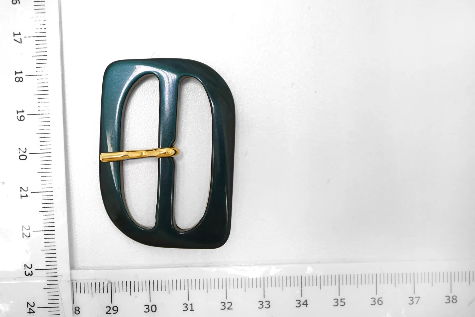 Пряжка из пластмассы, темно-зелёного цвета с перламутром. Внутренний размер (для ремешка) - 40 мм. Пряжка с металлическим язычком.