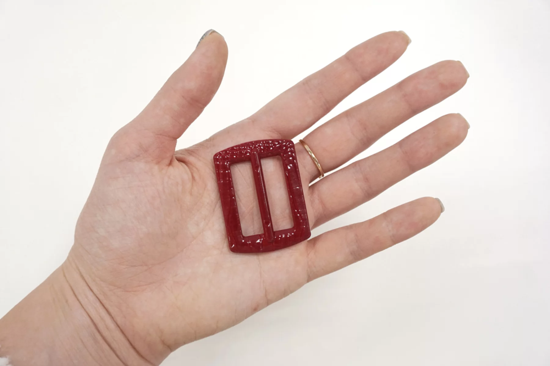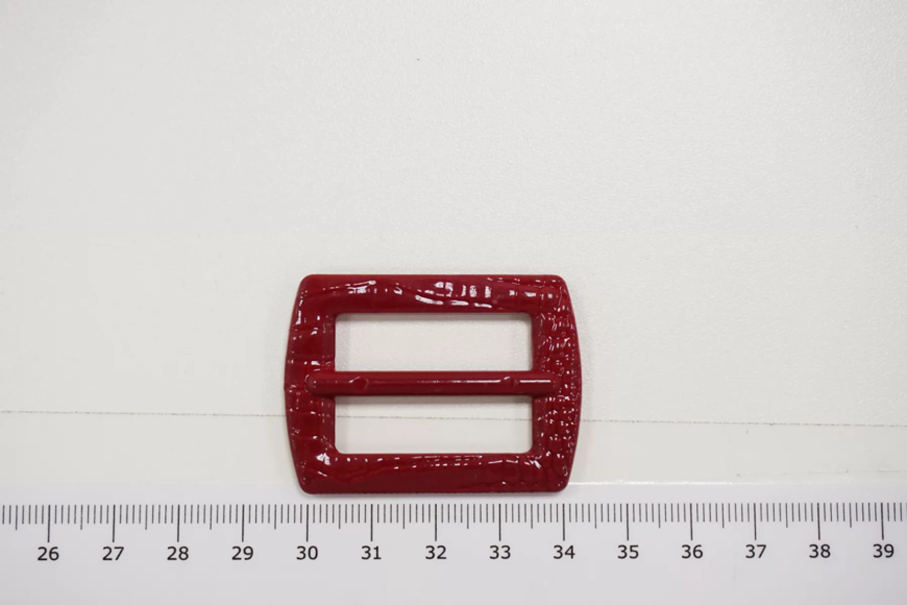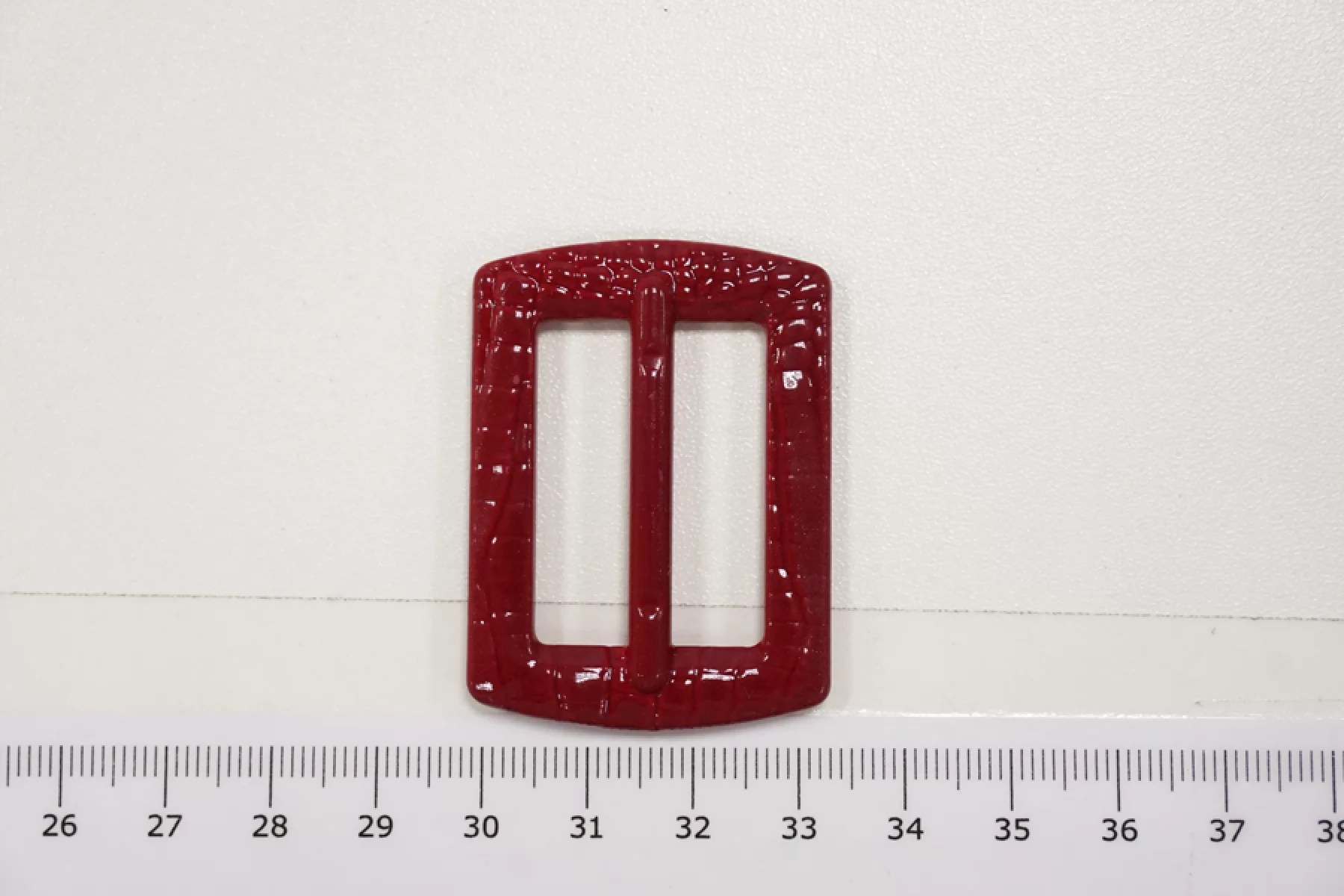 Прямоугольная пряжка из пластмассы, цвета темного рубина с фактурой, имитирующей кожу рептилии. Размер 46х34 мм. Внутренний размер (для ремешка) - 30х21 мм.
