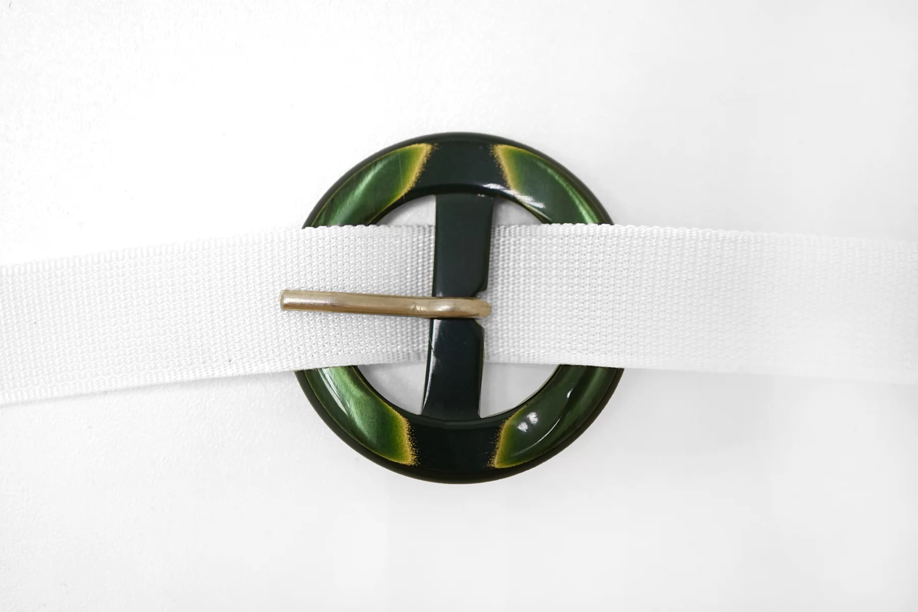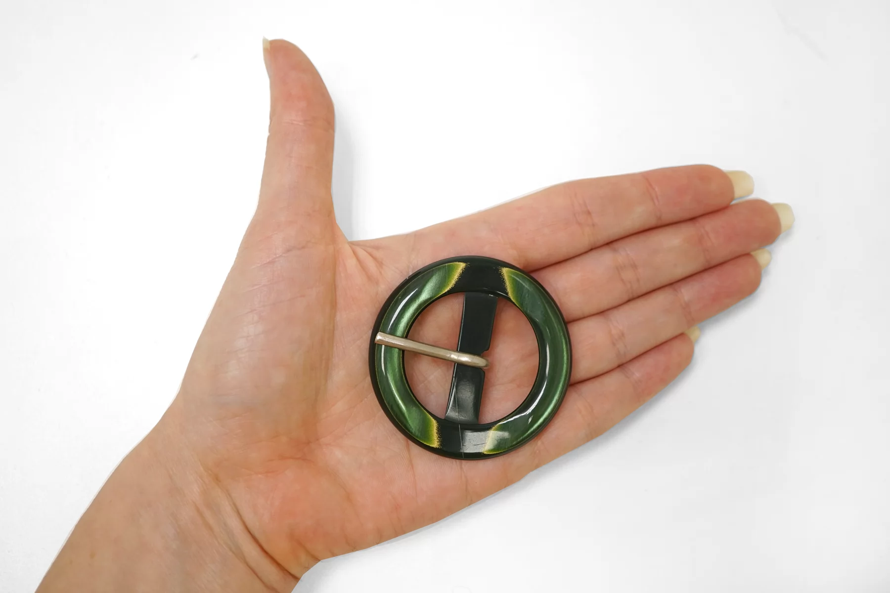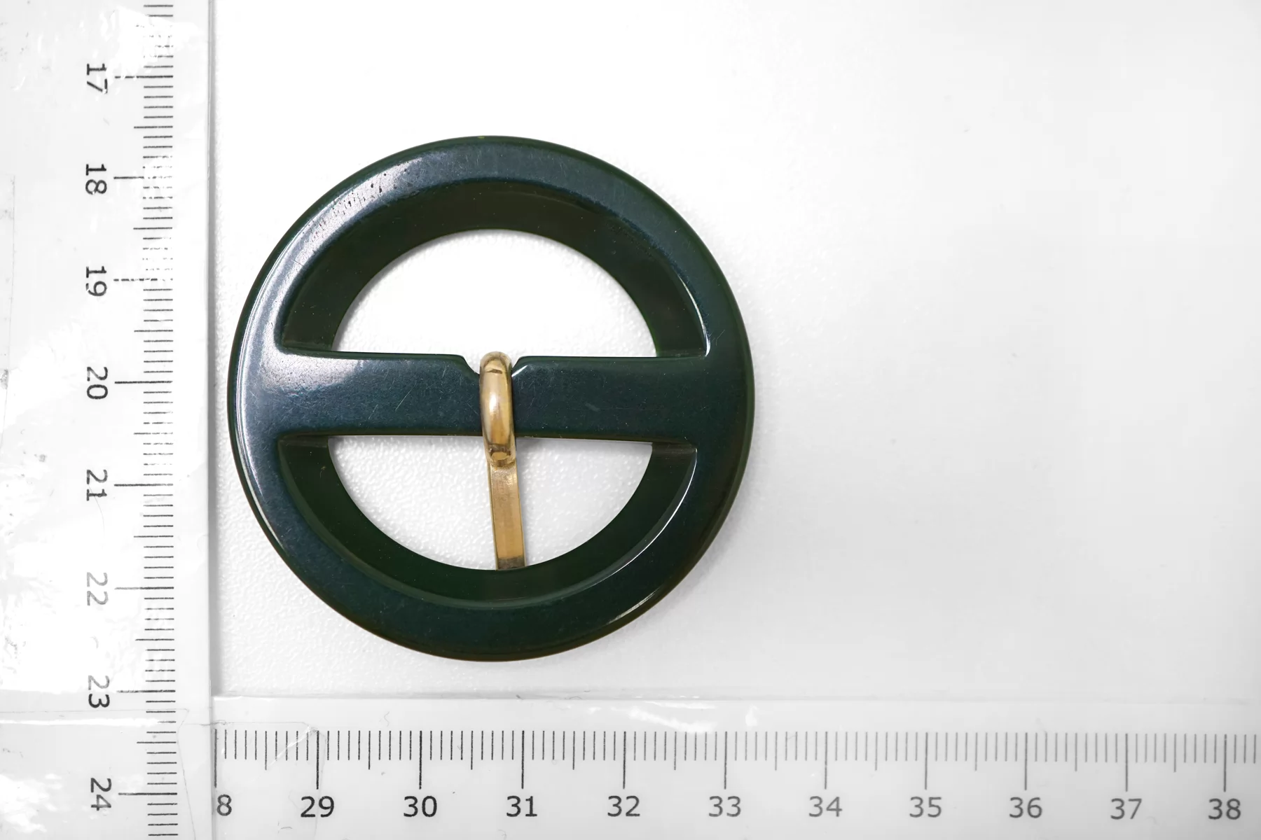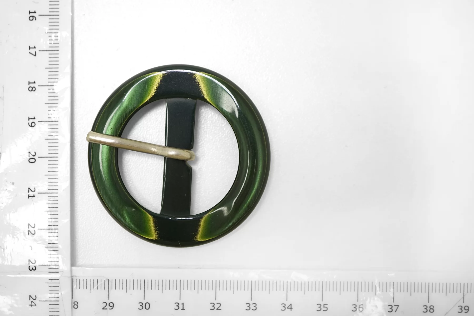 Круглая пряжка из пластмассы, зеленого цвета с перламутром. Внутренний размер (для ремешка) - 30 мм. Пряжка с металлическим язычком.