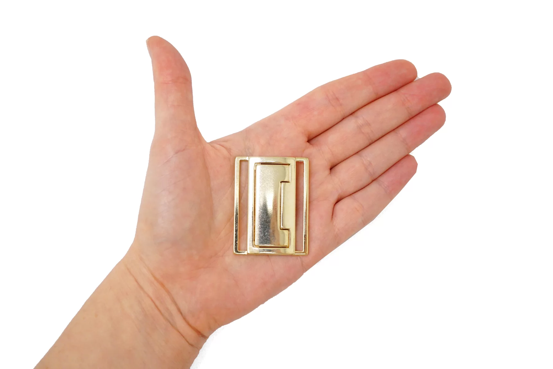 Прямоугольная разъемная пряжка из золотистого металла. Внутренний размер под пояс 40 мм.