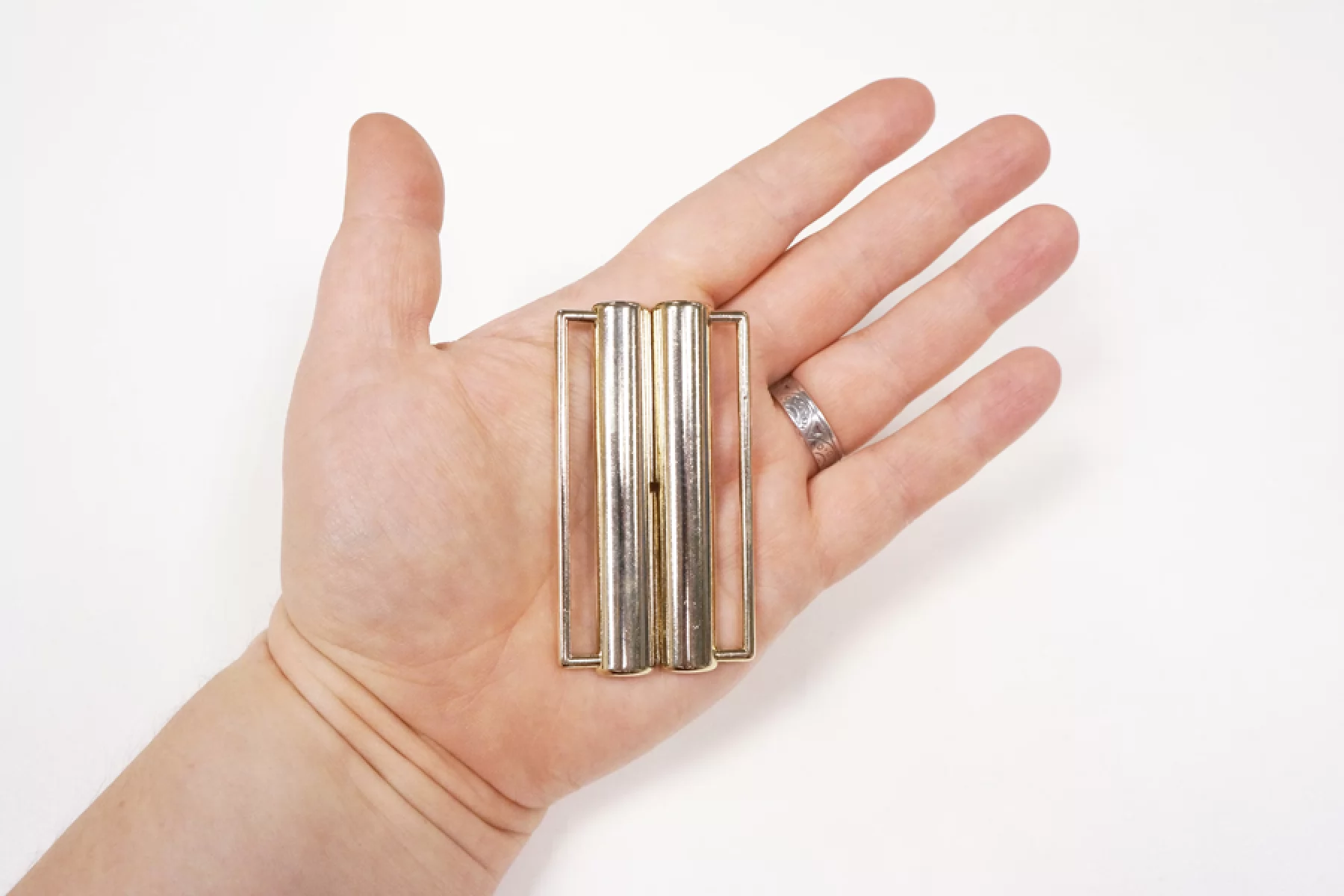 Прямоугольная разъемная пряжка из золотистого металла, размер пряжки 70х40 мм. Размер отверстия - 60х5 мм.
