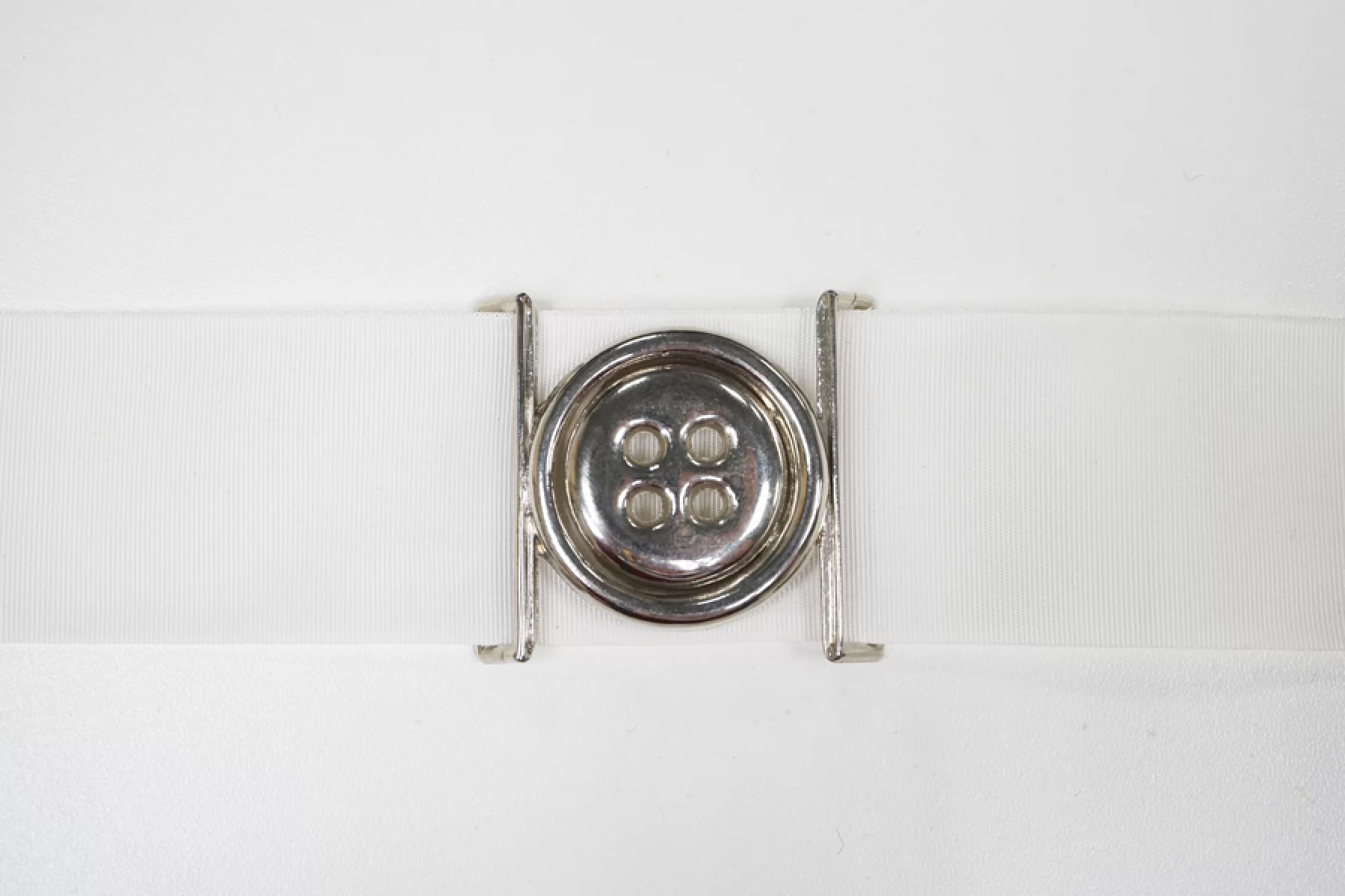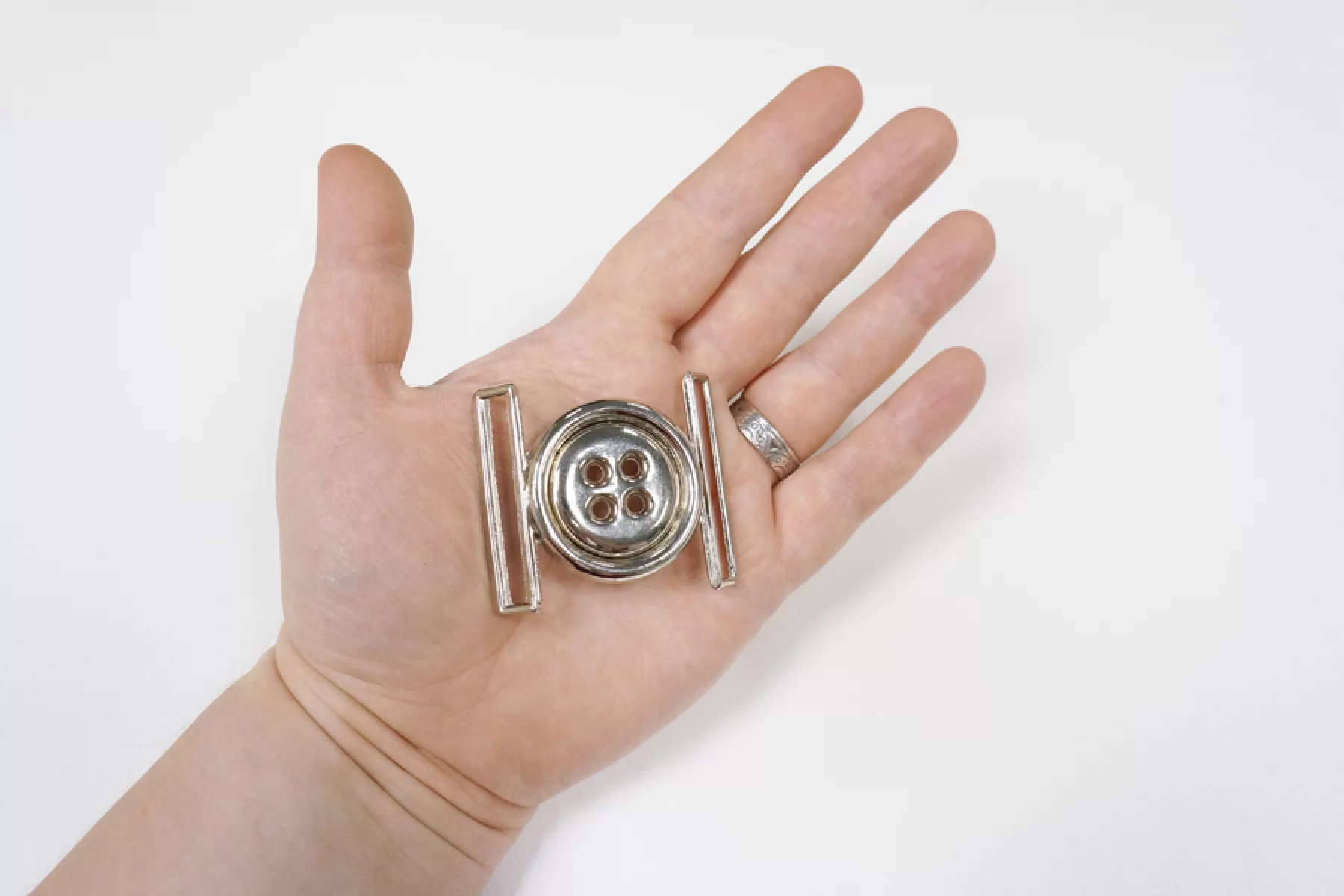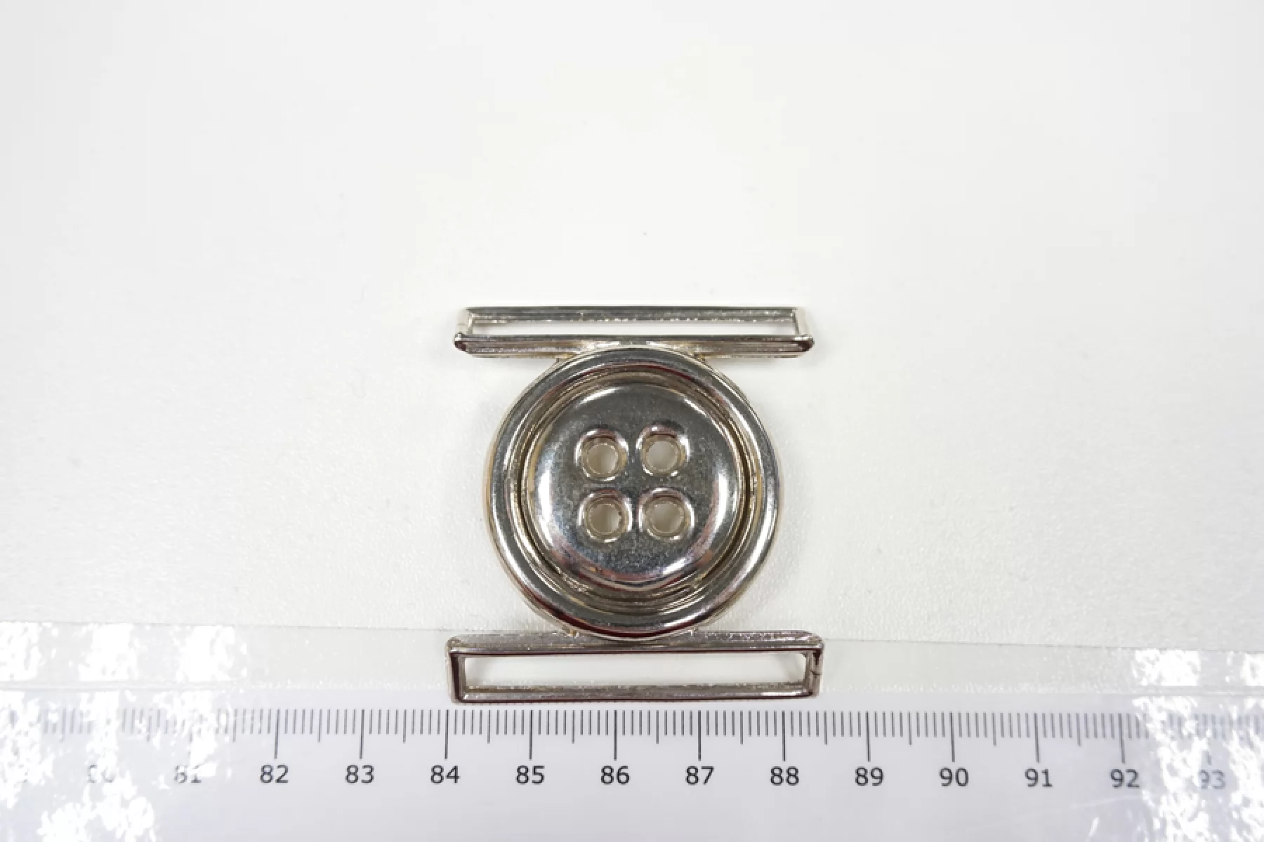 Пряжка разъемная серебряного цвета, размер 51х27. Размер отверстия - 40х0,5 мм. Пряжка с круглой серединкой и декоративными отверстиями.